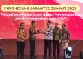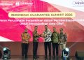 Menteri UMKM Maman Abdurrahman (tengah) berfoto dengan Ketua Umum Asosiasi Perusahaan Penjaminan Indonesia (ASIPPINDO) Ivan Soeparno (kedua dari kiri), didampingi oleh Wakil Ketua Bidang Hubungan Kelembagaan dan Kerjasama ASIPPINDO Abdul Bari (kiri), Sekretaris Jenderal ASIPPINDO Agus Supriadi (kedua dari kanan), dan Bendahara ASIPPINDO Kokok Alun Akbar (kanan), usai pembukaan Indonesia Guarantee Summit 2025 di Jakarta, Rabu (16/4/2025). Indonesia Guarantee Summit 2025 merupakan forum strategis yang diselenggarakan ASIPPINDO sebagai wadah kolaborasi, diskusi, dan inovasi dalam memperkuat industri penjaminan nasional. Dengan tema “Peran Perusahaan Penjaminan dalam Pemberdayaan UMKM untuk Mewujudkan Asta Cita”, forum ini menghadirkan pemangku kepentingan dari pemerintah, regulator, lembaga keuangan, dan pelaku UMKM untuk merumuskan strategi bersama menuju ekosistem pembiayaan yang inklusif, sehat, dan berkelanjutan.