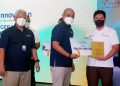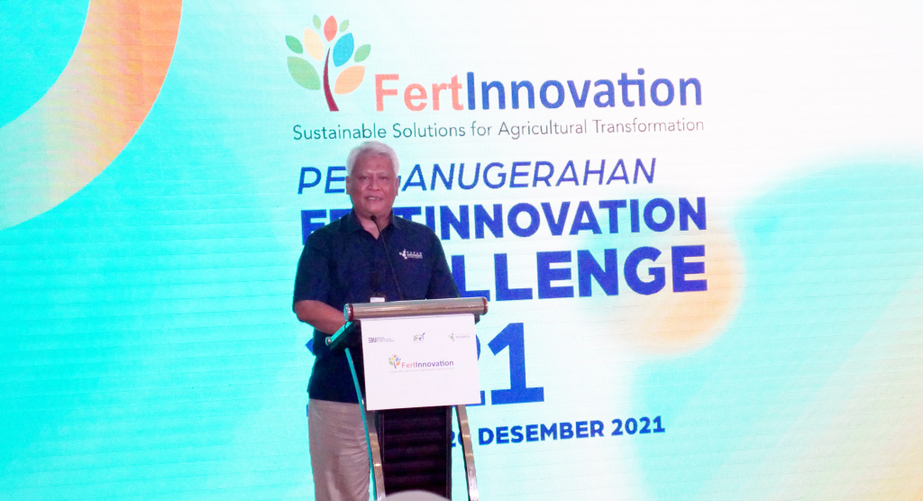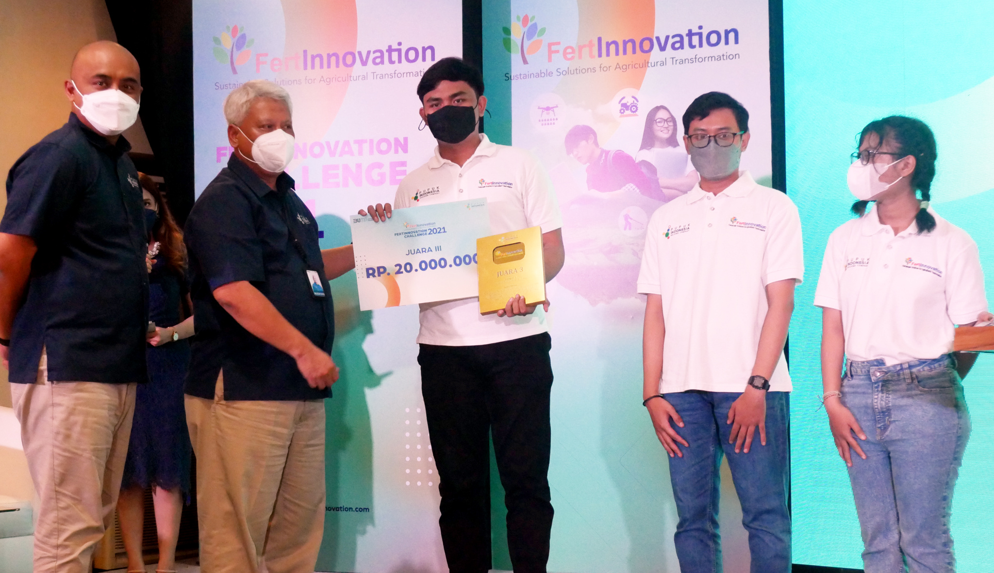 Wakil Direktur Utama PT Pupuk Indonesia (Persero), Nugroho Christijanto (kiri) bersama Direktur Transformasi Bisnis PT Pupuk Indonesia (Persero) Panji Winanteya Ruky (kanan) berfoto bersama dengan pemenang (juara I) Ajang kompetisi riset pertanian Fertinnovation Challenge 2021 dari tiga katagori masing-masing; Ni Putu Eka Dwi Yanti dan Oki Trisna Sekar Arum dari Universitas Brawijaya pemenang untuk kategori Innovation in Smart and Precision Agriculture; Astri Diani Nur Mufihah dan Luvy Dellarosa dari Institut Teknologi Bandung pemenang kategori Innovation in Agriculture Value Chain; Fadhlih Al-Zaki Sitorus dan Alfi Zahraini dari Universitas Gadjah Mada pemenang kategori Innovation in Fertilizer Production System usai pengumuman pemenang di Jakarta, Senin (20/12/3021). PT Pupuk Indonesia menggelar kompetisi riset pertanian Fertinnovation Challenge 2021 yang melibatkan perguruan tinggi secara nasional. Ini merupakan sebuah komitmen Pupuk Indonesia Group untuk menumbuhkan dan mengembangkan inovasi dan kolaborasi secara khusus dengan generani milenial dan civitas akademika dan universitas.