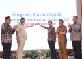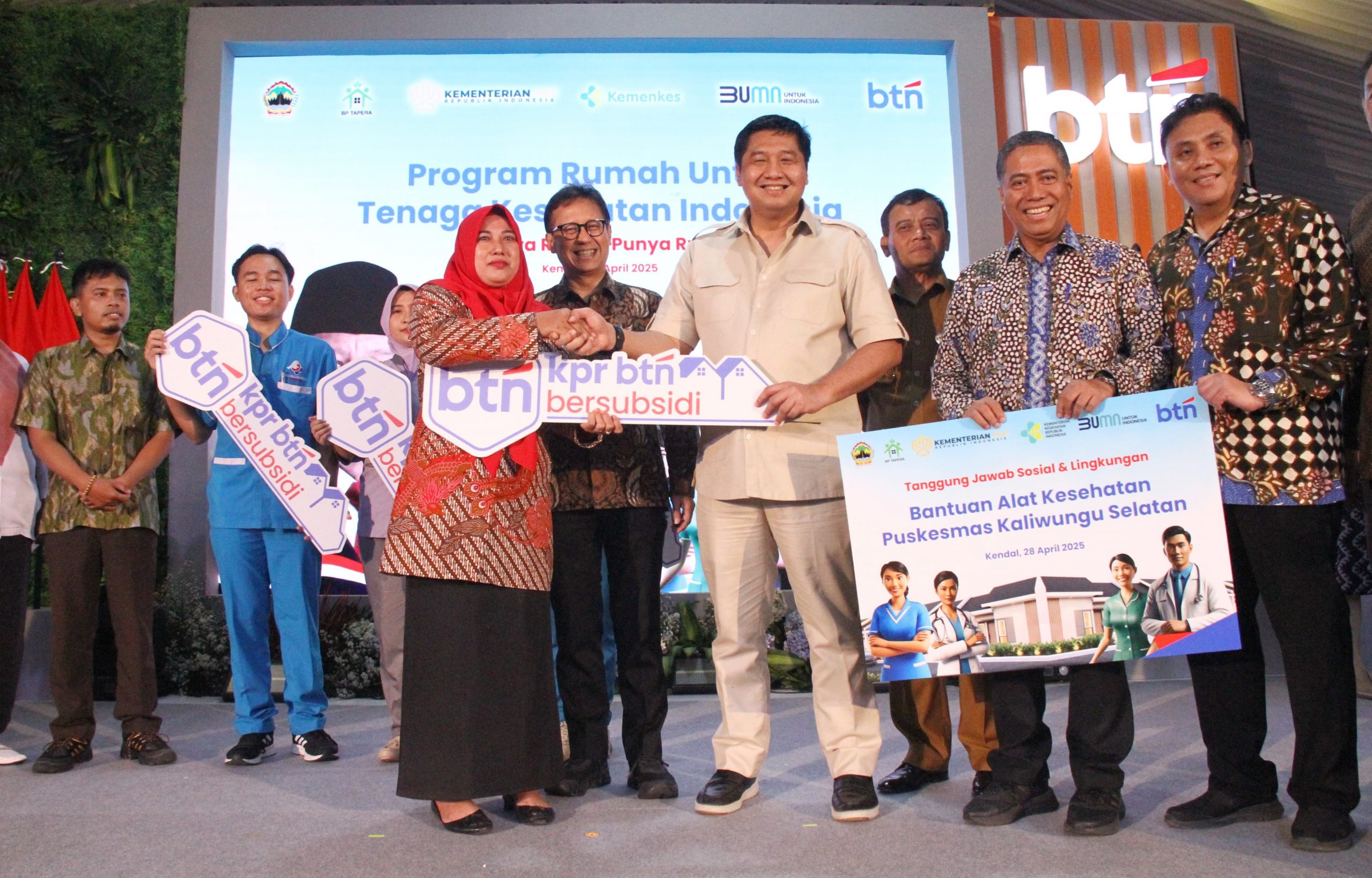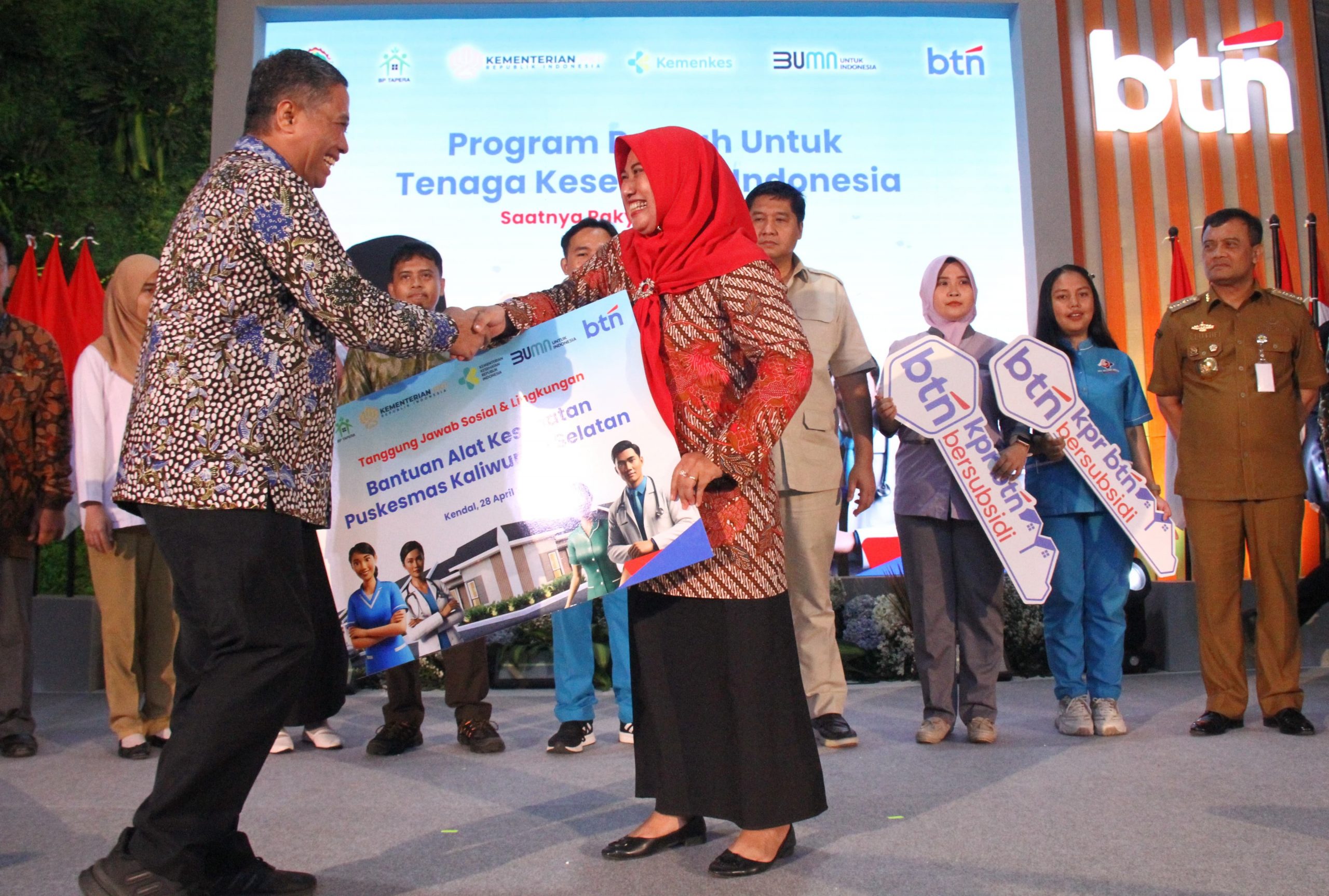 Menteri Perumahan dan Kawasan Permukiman Republik Indonesia Maruarar Sirait (ke empat dari kanan), Menteri Kesehatan Republik Indonesia Budi Gunadi Sadikin (keempat dari kiri), Gubernur Jawa Tengah Ahmad Luthfi (ketiga dari kanan) dan Direktur Consumer Banking PT Bank Tabungan Negara (Persero) Tbk (BTN) Hirwandi Gafar (kedua dari kanan) serta Komisioner BP Tapera Heru Pudyo Nugroho (kanan) menyerahkan kunci rumah secara simbolis kepada para pekerja yang berprofesi Tenaga Kesehatan, dalam acara peluncuran Program Rumah untuk Tenaga Kesehatan Indonesia di Kendal, Jawa Tengah, Senin (28/4).