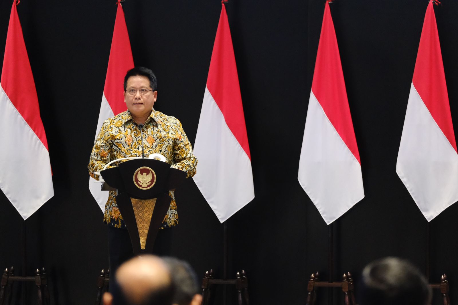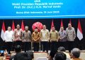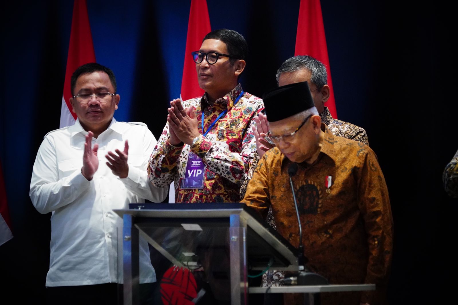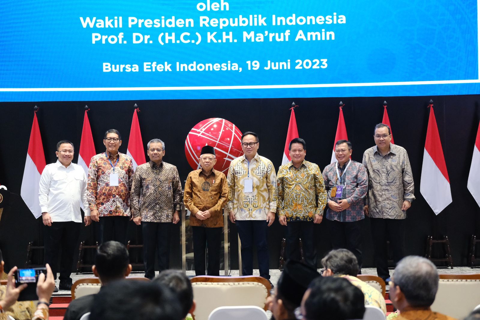 Hadir dalam kesempatan tersebut (ki-ka) : Sekretaris Jenderal Masyarakat Ekonomi Syariah Iggi Haruman Achsien (paling kiri), Ketua Eksekutif Pengawas Pasar Modal Keuangan Derivatif dan Bursa Karbon OJK Inarno Djajadi, Wakil Menteri Keuangan RI Suahasil Nazara, Wakil Presiden RI KH Ma’ruf Amin, Wakil Menteri BUMN Kartika Wirjoatmodjo, Direktur Utama PT Bank Syariah Indonesia Tbk Hery Gunardi, Direktur Utama PT Sarana Multigriya Finansial (persero) Ananta Wiyogo dan Direktur Utama PT Bursa Efek Indonesia (BEI) Iman Rachman (19/6).