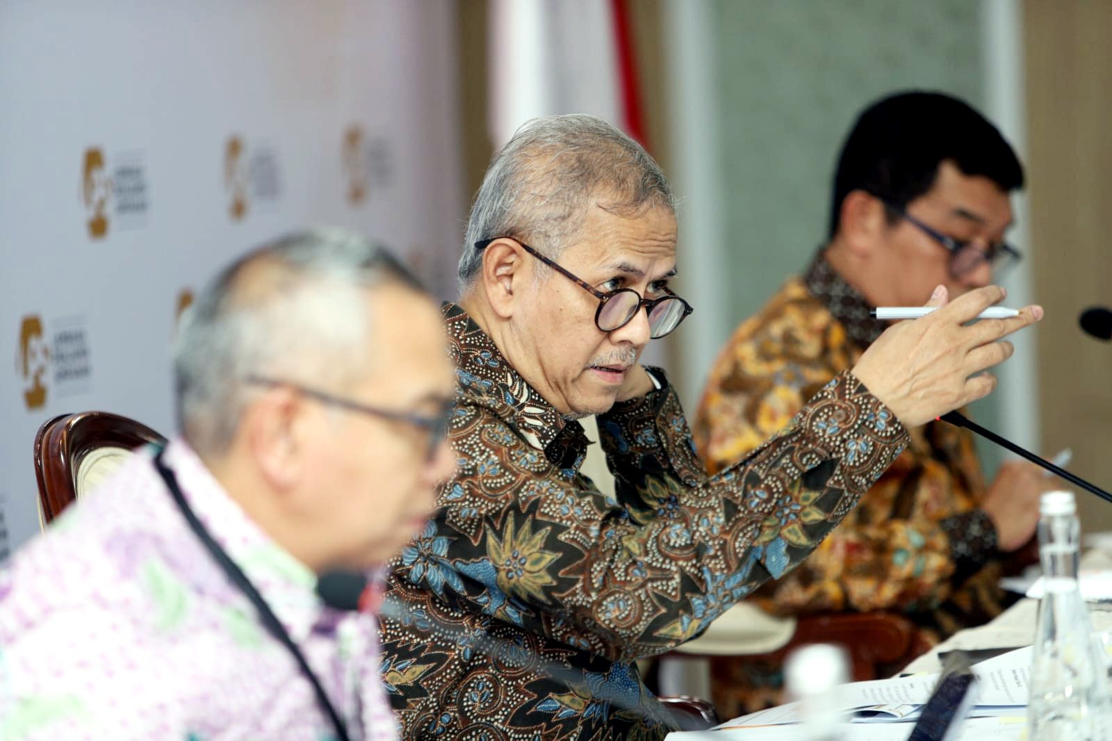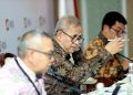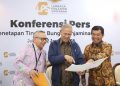 Ketua Dewan Komisioner Lembaga Penjamin Simpanan (LPS) Anggito Abimanyu (tengah) bersama dengan Wakil Ketua Dewan Komisioner Farid Azhar Nasution (kiri) dan Anggota Dewan Komisioner Bidang Program Penjaminan Polis Ferdinan D. Purba (kanan) saat konferensi pers Penetapan Tingkat Bunga Penjaminan LPS di Jakarta, Kamis (22/1/2026).
