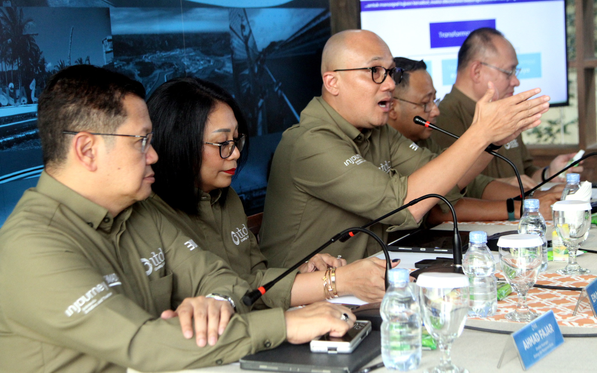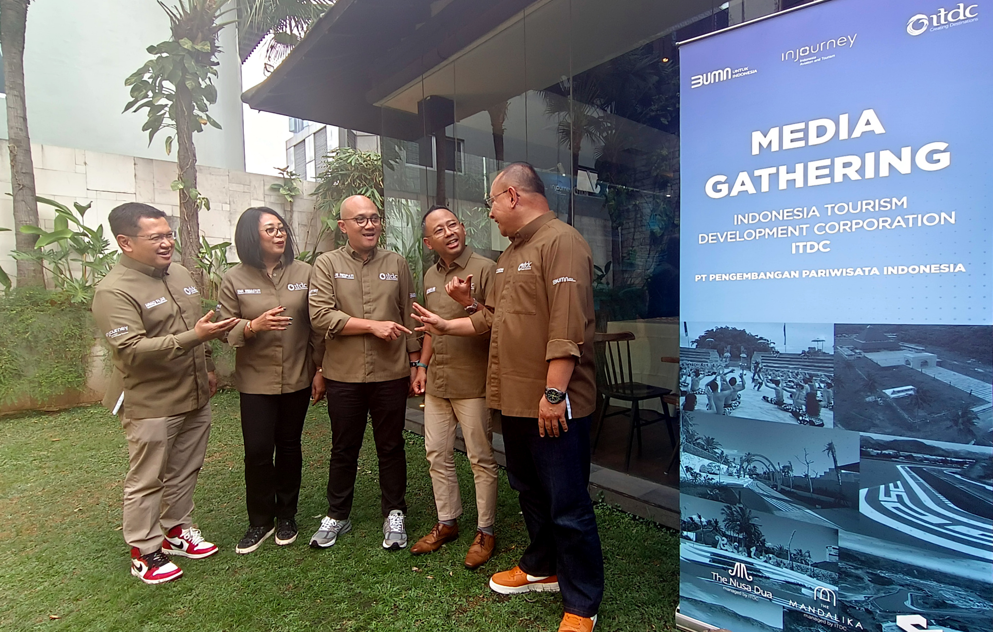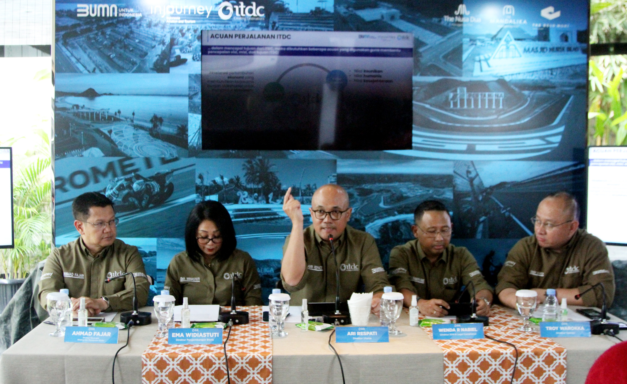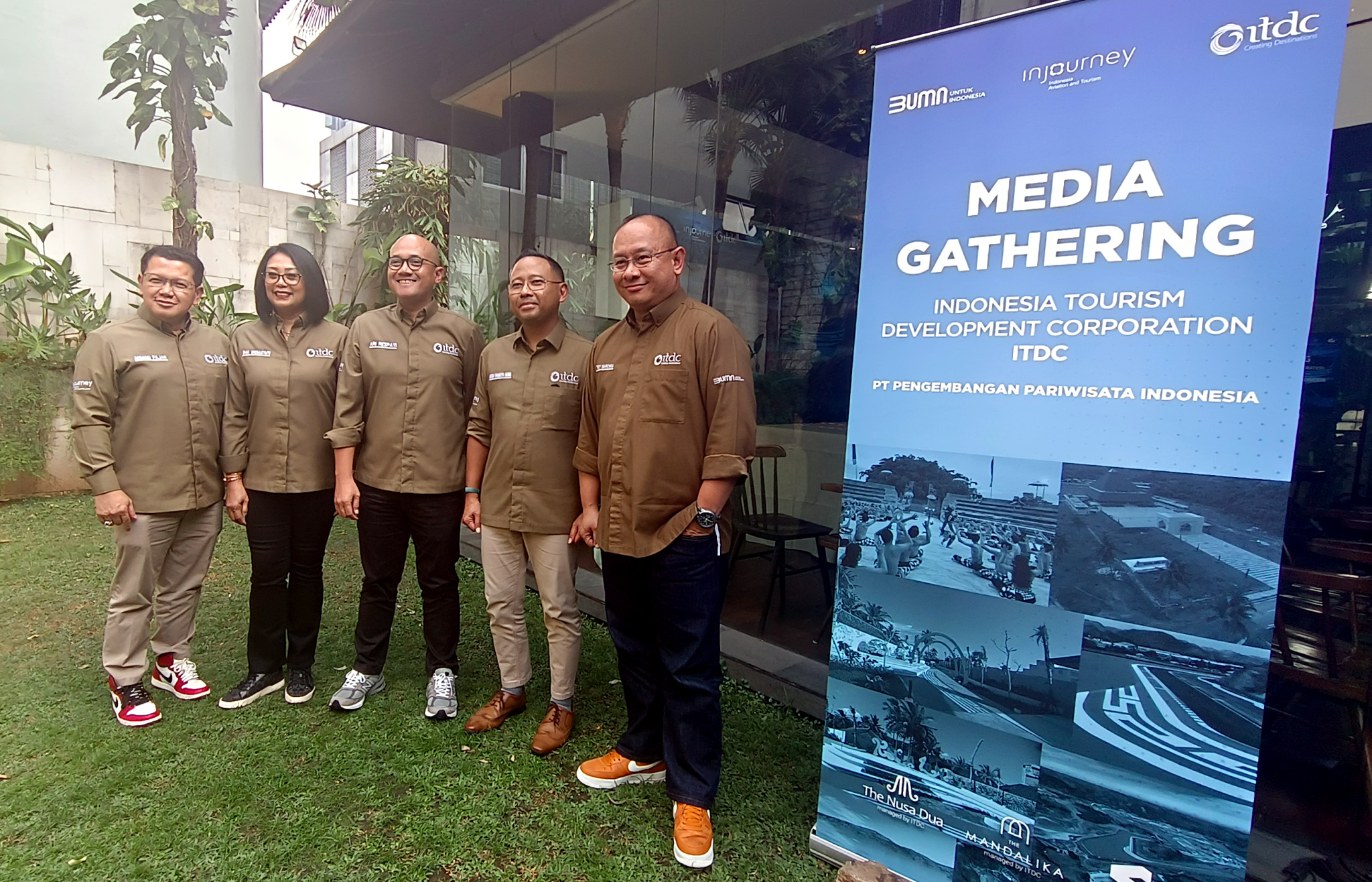 Direktur Utama PT Pengembangan Pariwisata Indonesia/Indonesia Tourism Development Corporation (ITDC) Ari Respati (tengah), Direktur Pengembangan Bisnis, Ema Widiastuti (kedua kiri), Direktur Keuangan, Strategi, dan Manajemen Risiko, Ahmad Fajar (kiri), Direktur Operasi, Troy Reza Warokka (kedua kanan), dan Direktur SDM dan Legal Compliance, Wenda R. Nabiel (kanan) berfoto saat event Media Briefing, Jakarta, Selasa (8/8). ITDC berkomitmen mengembangkan destinasi pariwisata di Indonesia dimana saat ini ITDC tengah menjalankan tugas dari pemerintah untuk mengembangkan The Nusa Dua, Bali, The Mandalika, NTB dan The Golo Mori, NTT