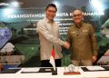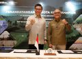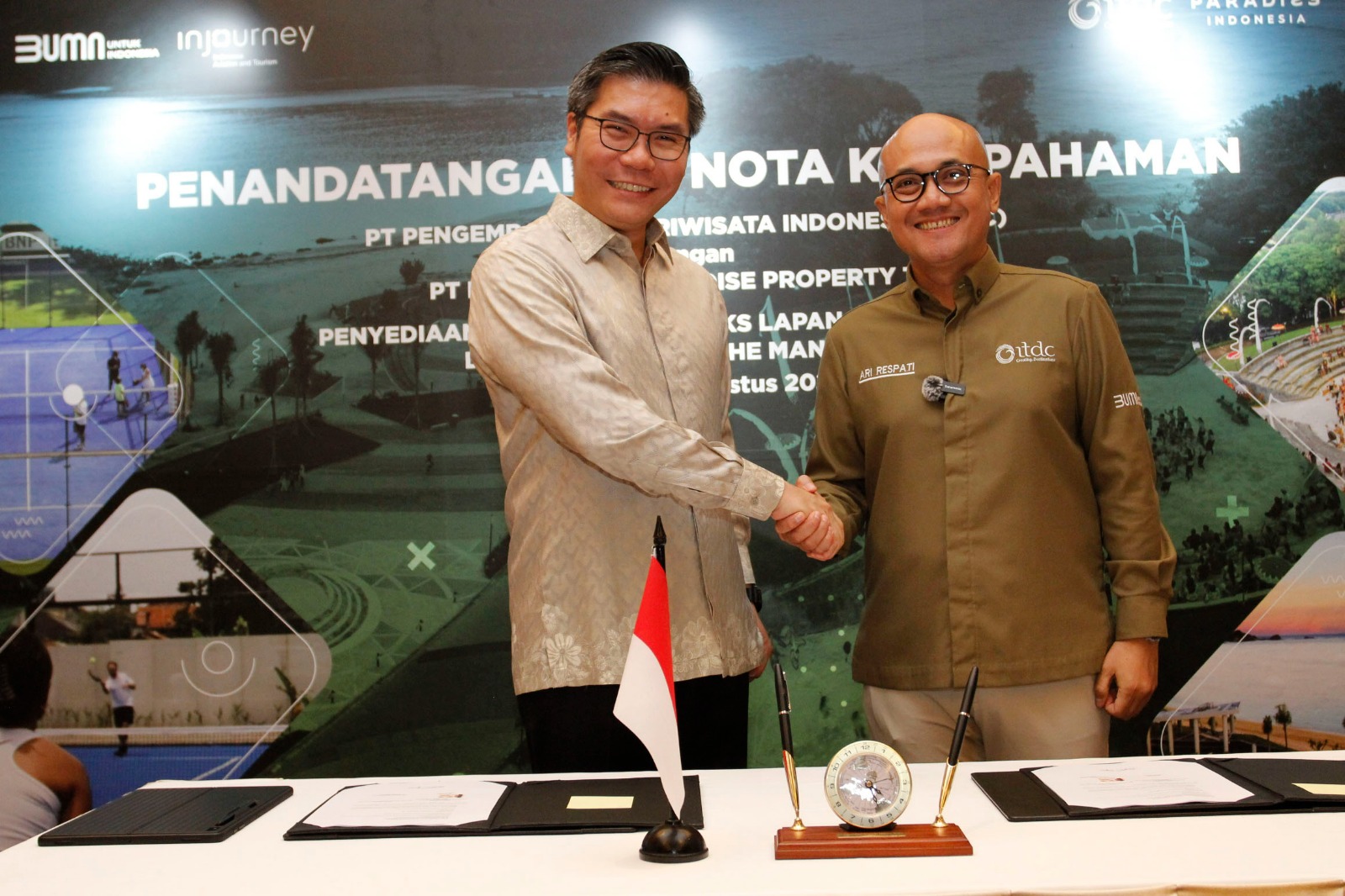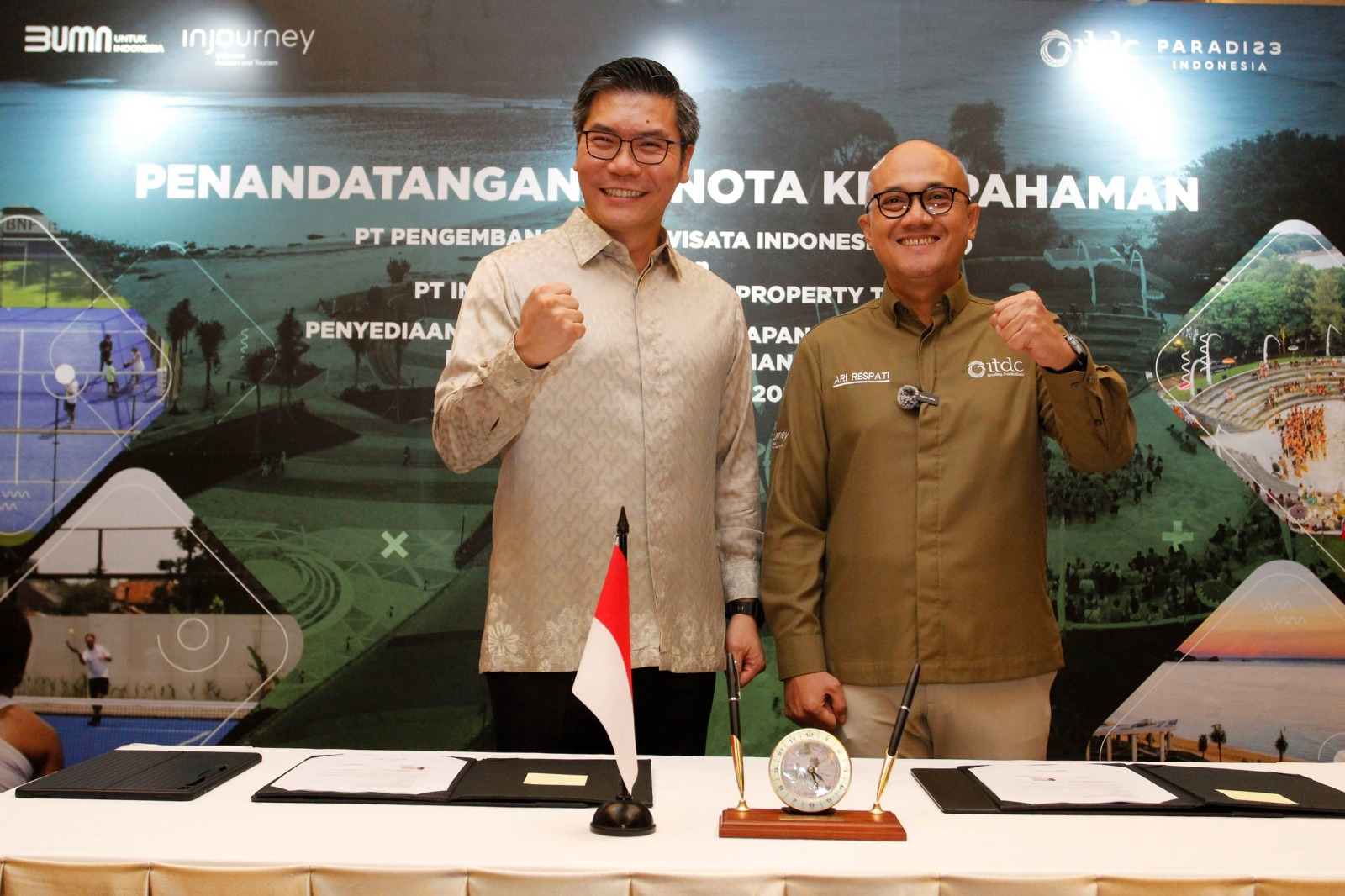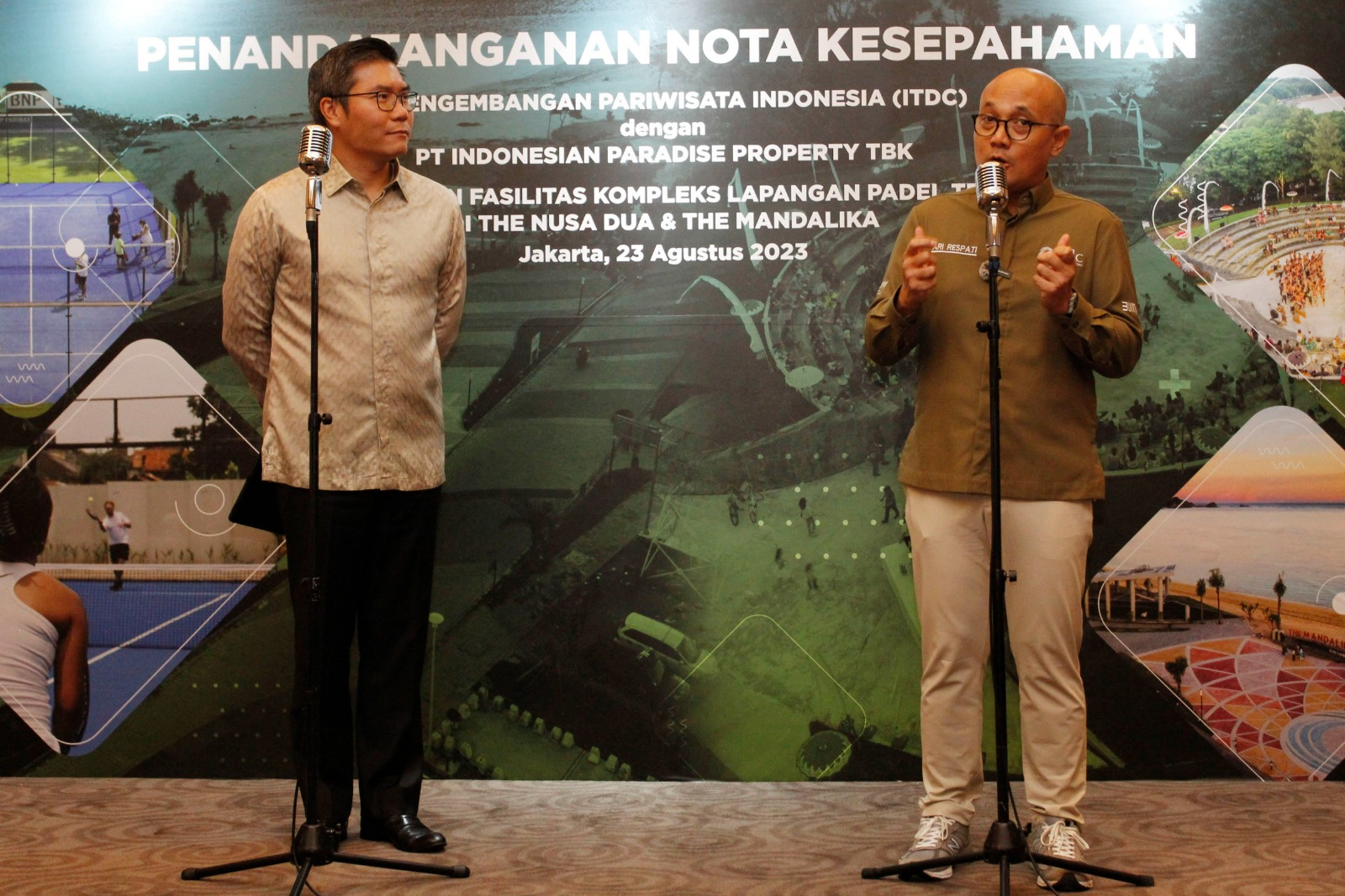 Direktur Utama ITDC Ari Respati (3 kanan), Direktur Keuangan, Strategi, & Manajemen Risiko ITDC Ahmad Fajar (2 kanan), Direktur SDM dan Legal Compliance ITDC Wenda R. Nabiel (kanan), Presiden Direktur & CEO PT Indonesian Paradise Property Tbk (INPP) Anthony Prabowo Susilo (3 kiri), Founder&Chairman INPP Boyke Gozali (2 kiri), Shareholder Representative INPP Harris Gozali (kiri) berfoto seusai penandatanganan Nota Kesepahaman terkait Rencana Penyediaan Fasilitas Kompleks Lapangan Padel Tenis di kawasan The Nusa Dua, Bali dan The Mandalika, Nusa Tenggara Barat (NTB), yang berlangsung di Jakarta, Rabu (23/8/2023). Pengembangan kompleks padel tenis bertaraf internasional di The Nusa Dua dan The Mandalika ini akan dilengkapi dengan fasilitas modern dan berstandar internasional serta diharapkan dapat menjadi pusat kegiatan olahraga bagi semua kalangan, mulai dari pemula hingga para profesional