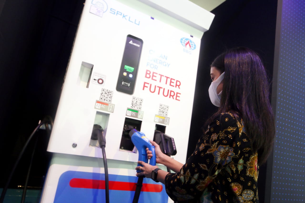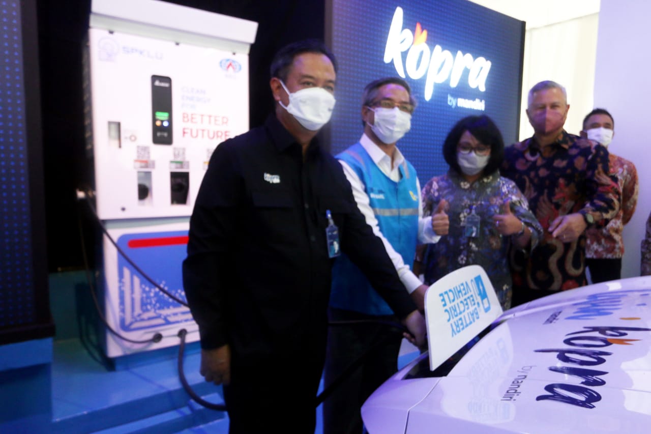 (Kika) Direktur Niaga dan Manajemen Pelanggan PLN Bob Saril, Direktur Corporate Banking Bank Mandiri Susana Indah K Indriati, Direktur Hubungan Kelembagaan Bank Mandiri Rohan Hafas, Direktur Treasury & International Banking Bank Mandiri Panji Irawan dan SEVP Corporate Banking Bank Mandiri Arief Ariyana saat meresmikan pengoperasian Stasiun Pengisian Kendaraan Listrik Umum (SPKLU) Plaza Mandiri di Jakarta, Senin (10/1). Bank Mandiri mendukung pengembangan Energi Terbarukan melalui sinergi dengan PLN dan menjadi BUMN non-PLN Group pertama yang menempatkan instalasi SPKLU di kantor pusat perseroan. Fasilitas yang beroperasi 7×24 jam ini akan didukung oleh channel pembayaran online (QRIS, Livin’ by Mandiri, dll) Bank Mandiri pada aplikasi PLN Mobile untuk kemudahan transaksi.