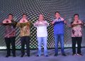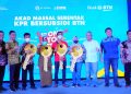 Direktur Jenderal Pembiayaan Infrastruktur Kementerian PUPR Herry Trisaputra Zuna didampingi Direktur Consumer Bank BTN Hirwandi Gafar (kiri) dan Deputi Komisioner BP Tapera Ariev Baginda Siregar (tengah) secara simbolis menyerahkan kunci kepada debitur KPR FLPP yang mengikuti kegiatan Akad Massal KPR Subsidi yang dilakukan secara serentak di beberapa Kantor Cabang BTN yang dipusatkan penyelenggaraannya di Palembang, Sumatera Selatan, Sabtu (25/6). Dalam kegiatan tersebut Bank BTN menggelar Akad Massal KPR Subsidi 10.000 Unit Rumah yang diharapkan dapat menjawab kebutuhan rumah rakyat sekaligus untuk menyukseskan Program Satu Juta Rumah.
