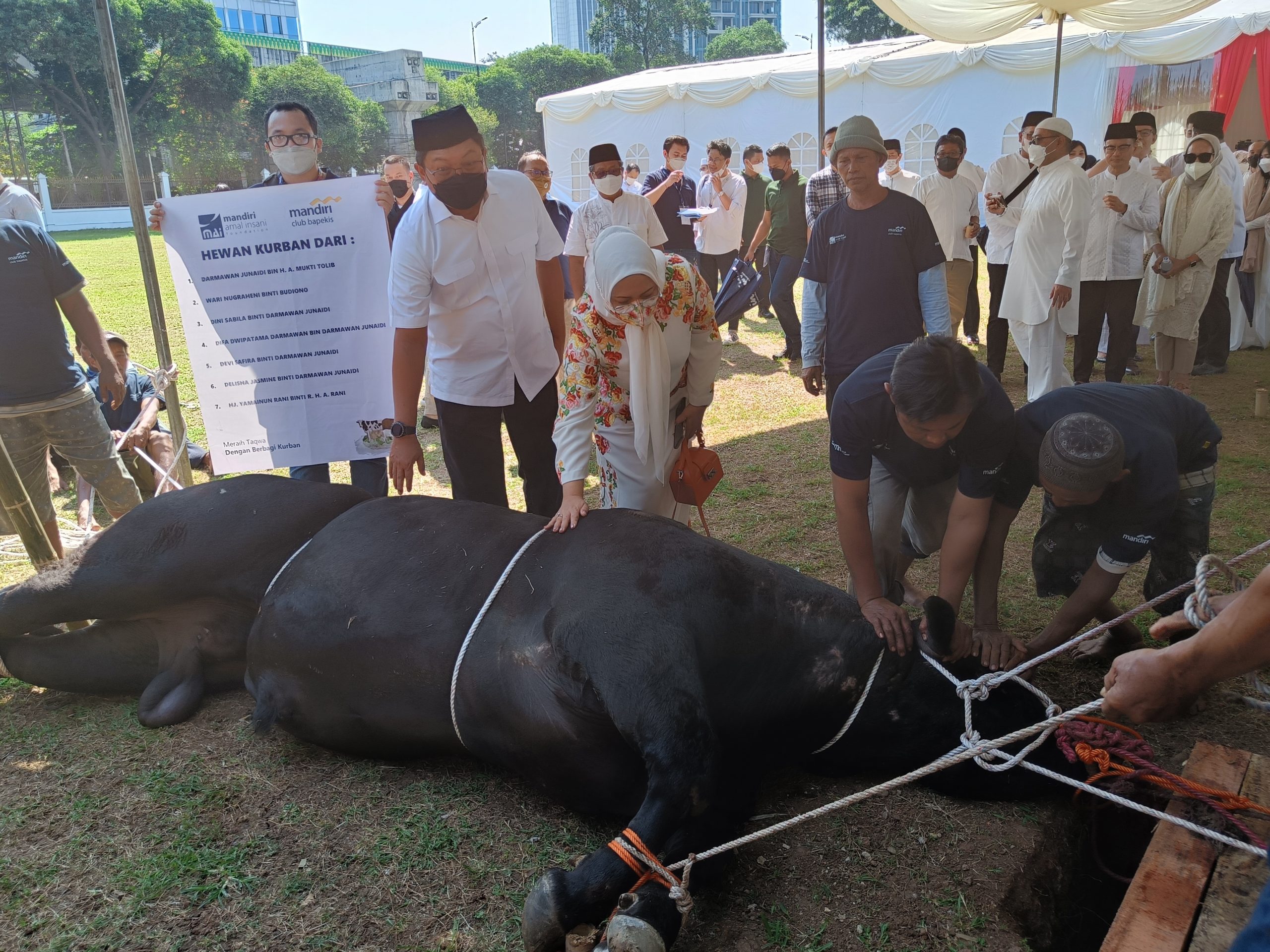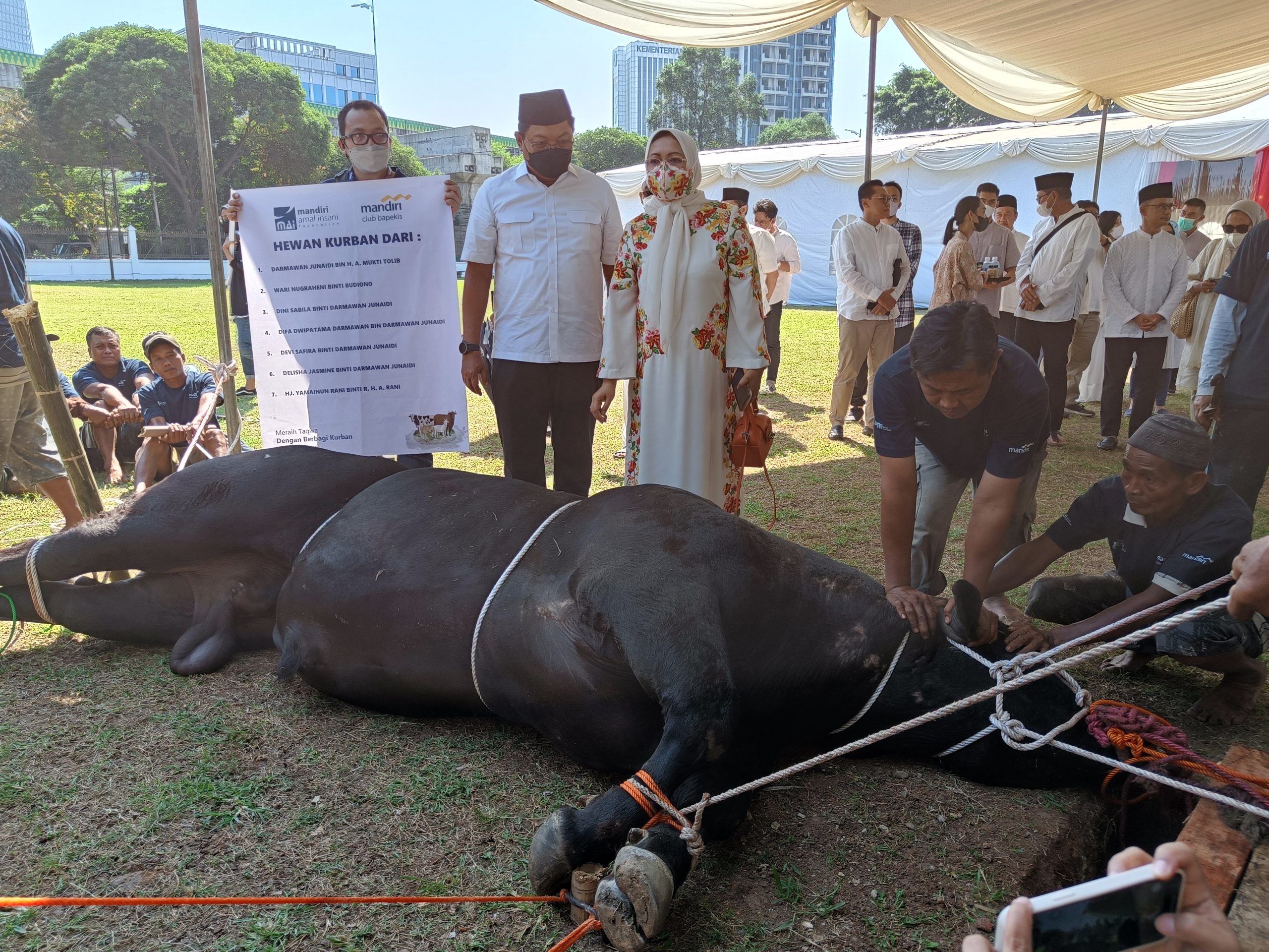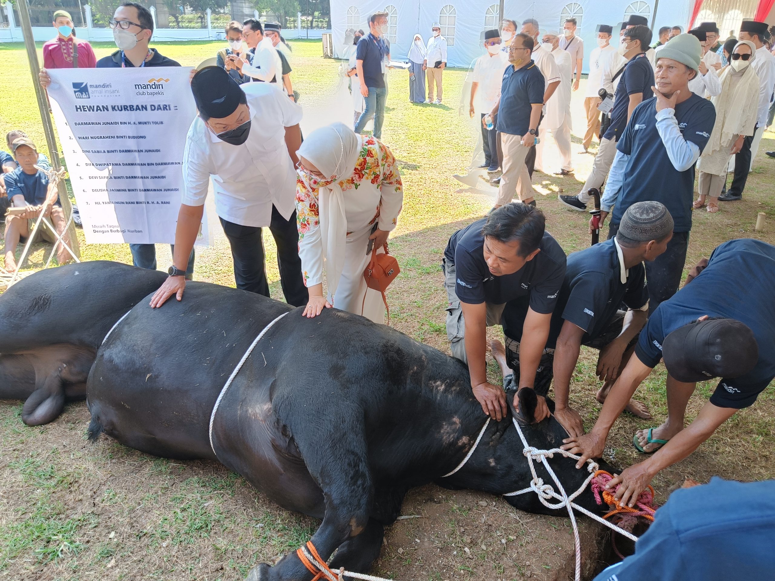 Direktur Utama Bank Mandiri Darmawan Junaidi (dua kiri) dan Heni Darmawan Junaidi (kiri) saat menyerahkan hewan kurban dalam rangka Idul Adha 1443 H di Griya Mandiri Mampang, Jakarta, Minggu (10/7). Dalam kegiatan tahun ini, Bank Mandiri menyerahkan total 478 hewan kurban, yang terdiri dari 153 ekor sapi dan 325 ekor kambing kepada masyarakat yang berhak menjadi penerima di sekitar kantor utama, kantor wilayah, kantor cabang serta perumahan Mandiri di berbagai lokasi di Indonesia. Khusus di Jabodetabek, pendistribusian dilakukan oleh Mandiri Amal Insani kepada 41 yayasan yang menjadi mitra, beberapa masjid dan masyarakat sekitar komplek Bank Mandiri serta kaum dhuafa binaan yayasan di wilayah tersebut,”