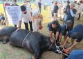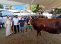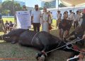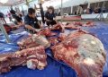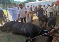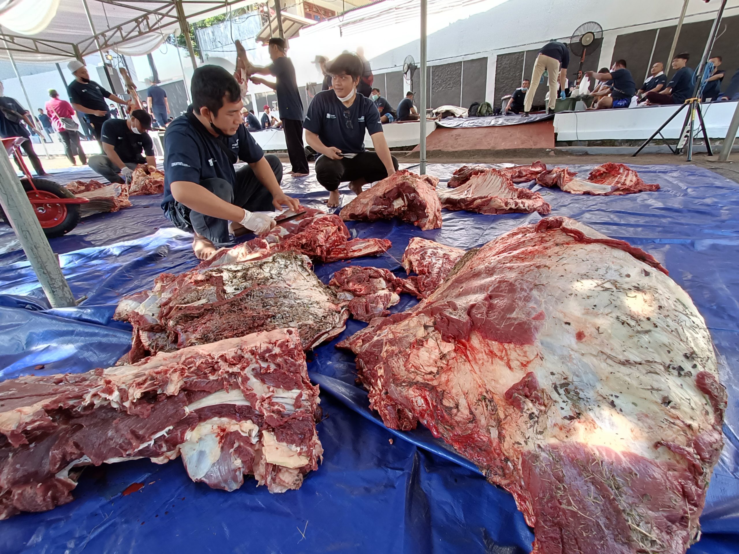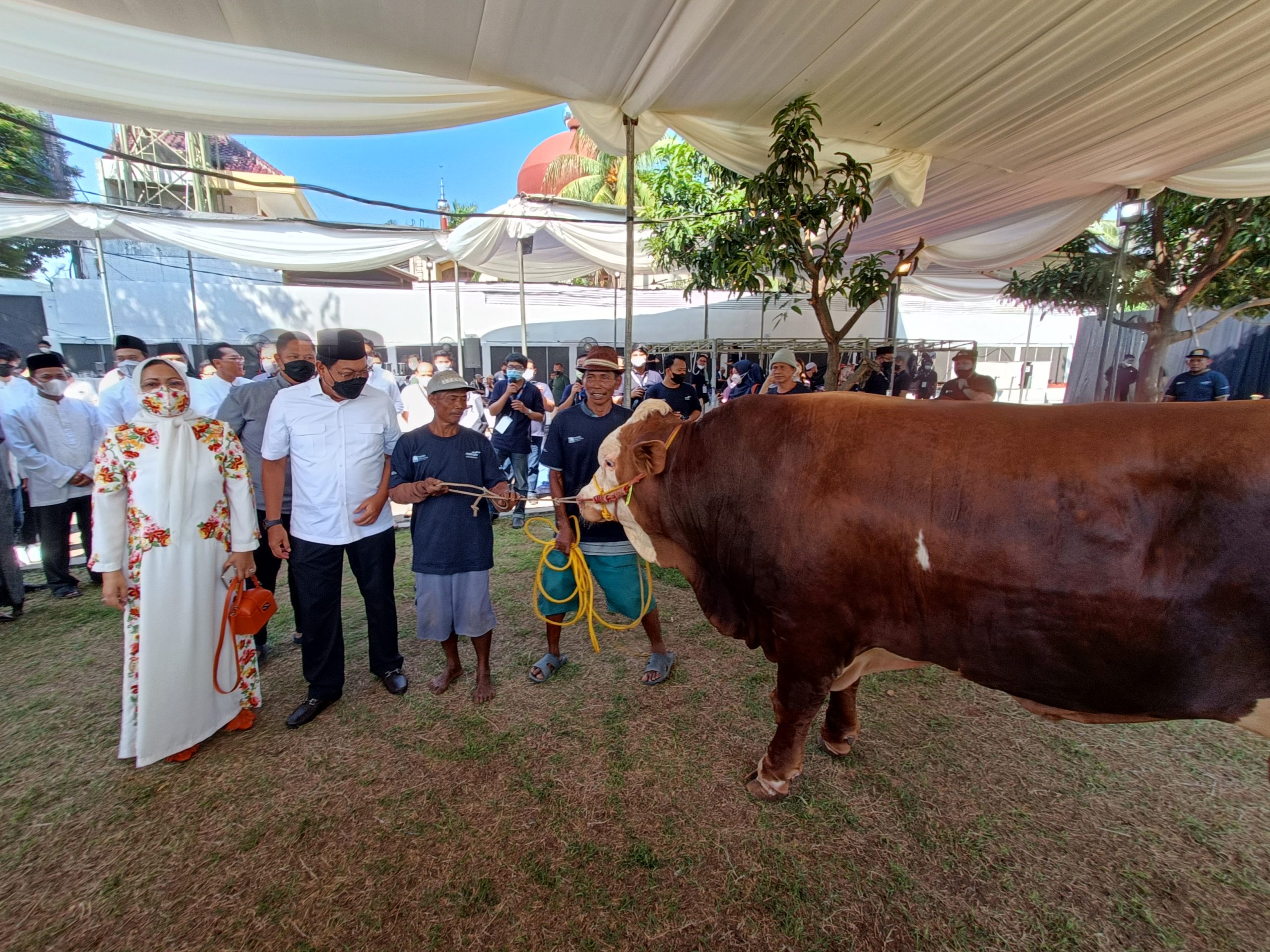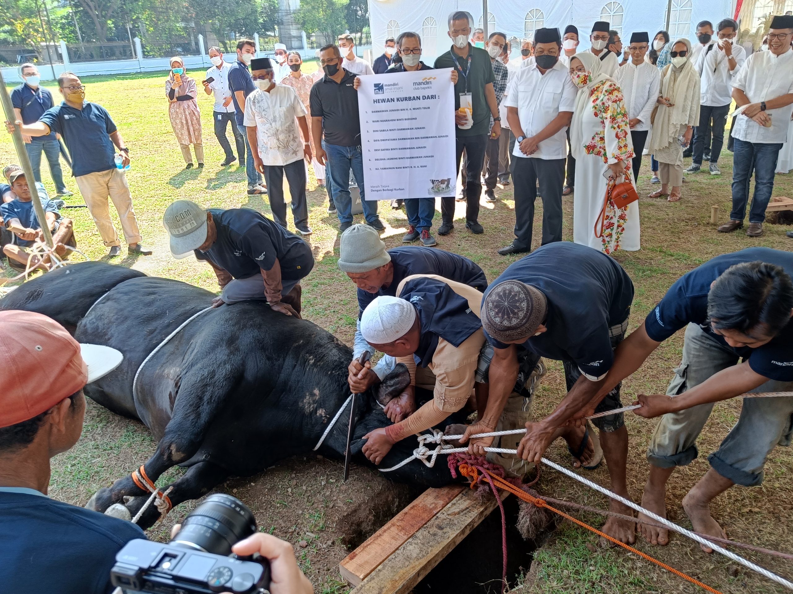 Direktur Utama Bank Mandiri Darmawan Junaidi (dua kiri) dan Heni Darmawan Junaidi (kiri) saat menyerahkan hewan kurban dalam rangka Idul Adha 1443 H di Griya Mandiri Mampang, Jakarta, Minggu (10/7). Dalam kegiatan tahun ini, Bank Mandiri menyerahkan total 478 hewan kurban, yang terdiri dari 153 ekor sapi dan 325 ekor kambing kepada masyarakat yang berhak menjadi penerima di sekitar kantor utama, kantor wilayah, kantor cabang serta perumahan Mandiri di berbagai lokasi di Indonesia. Khusus di Jabodetabek, pendistribusian dilakukan oleh Mandiri Amal Insani kepada 41 yayasan yang menjadi mitra, beberapa masjid dan masyarakat sekitar komplek Bank Mandiri serta kaum dhuafa binaan yayasan di wilayah tersebut,”