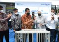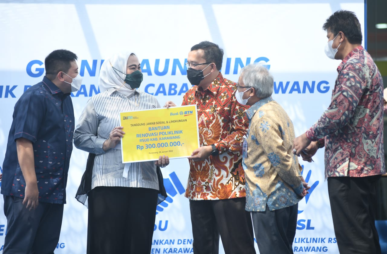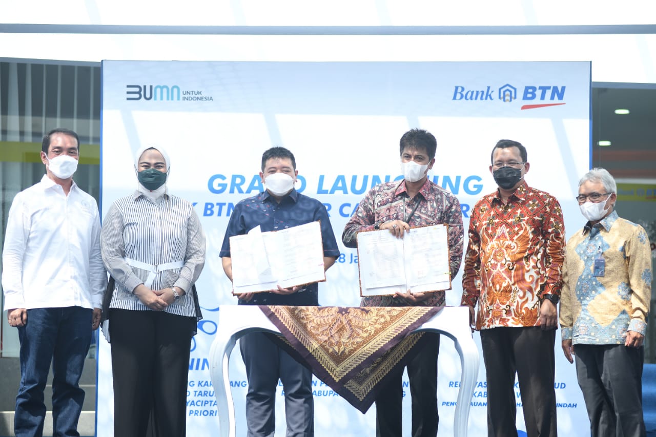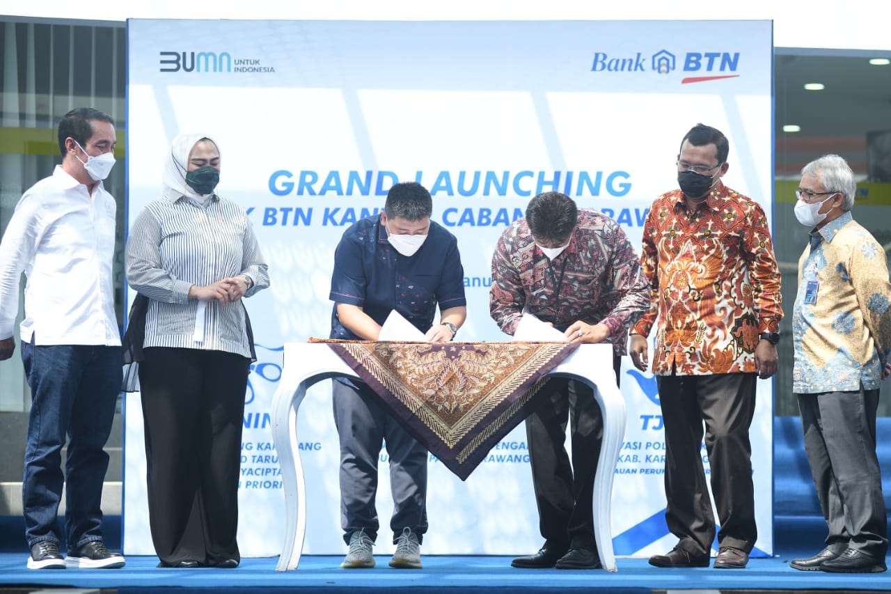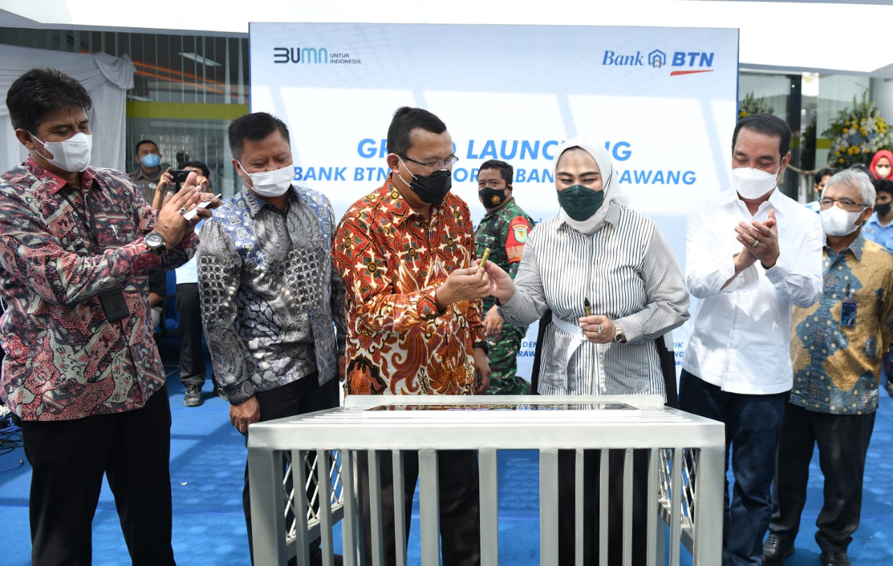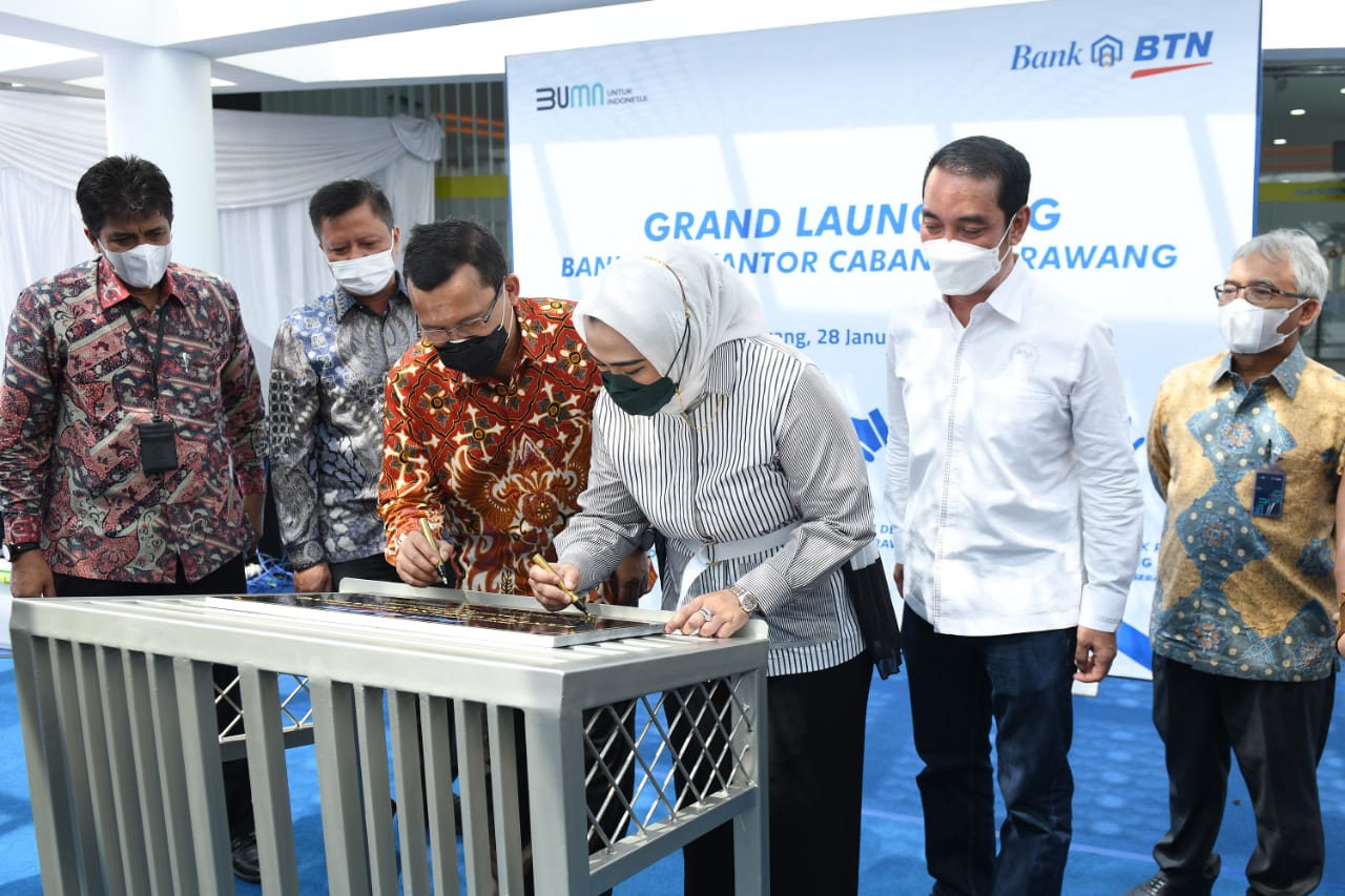 Direktur Utama Bank BTN Haru Koesmahargyo dan Bupati Karawang Cellica Nurrachadiana(ketiga kanan) menandatangani prasasti peresmian Gedung Kantor Cabang Bank BTN Karawang didampingi Direktur Distribution and Retail Funding Jasmin (Kanan), Kepala Kantor Wilayah I Bank BTN Edward Alimin Syarif(kiri), Anggota Komisi XI DPR Fauzi H Amro (kedua kanan) dan Anggota Komisi XI DPR Bertu Merlas (kedua kiri), di Kabupaten Karawang, Jawa Barat, Jumat (28/1). Peresmian Kantor Cabang Bank BTN Karawang ini akan membuat perseroan semakin ekspansif dalam menggali potensi bisnis di daerah tersebut baik pendanaan maupun kredit khusus pembiayaan perumahan. Foto/RIZKI MEIRINO.