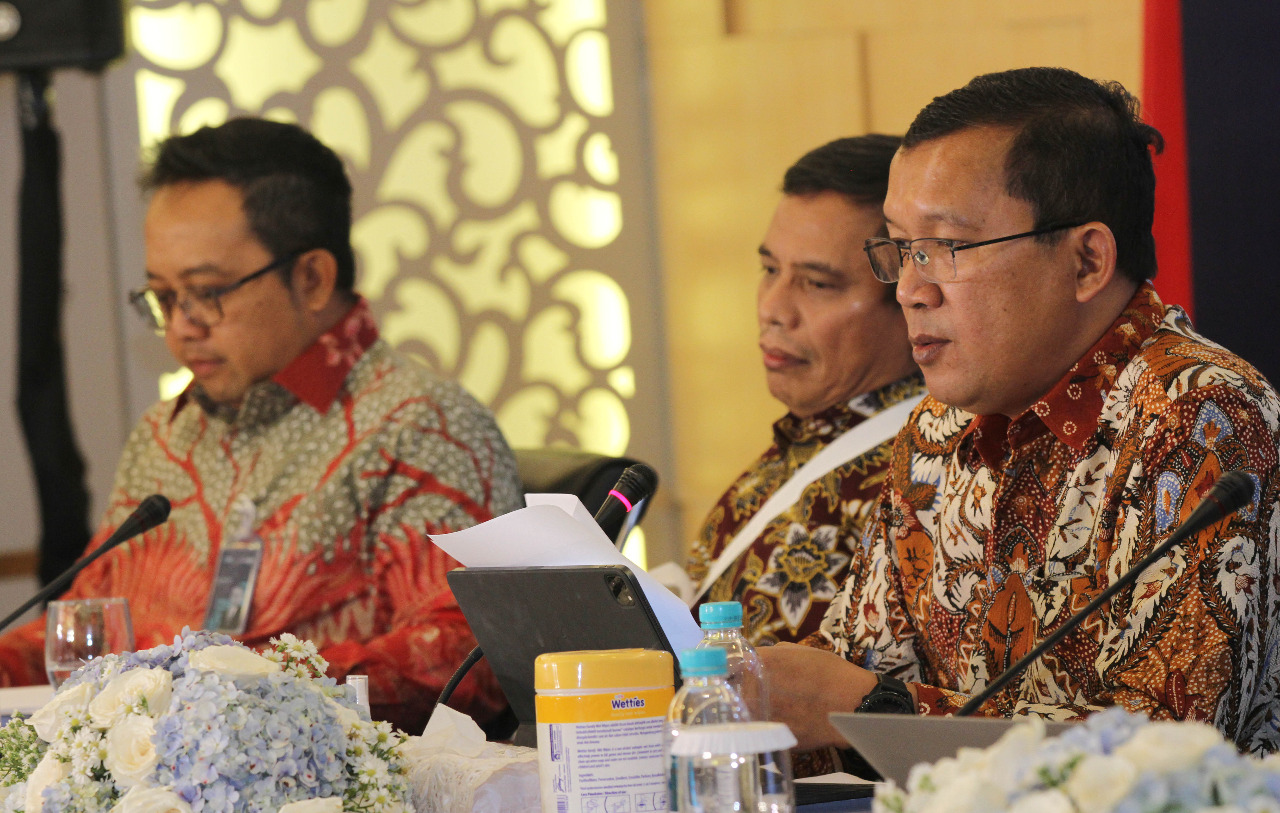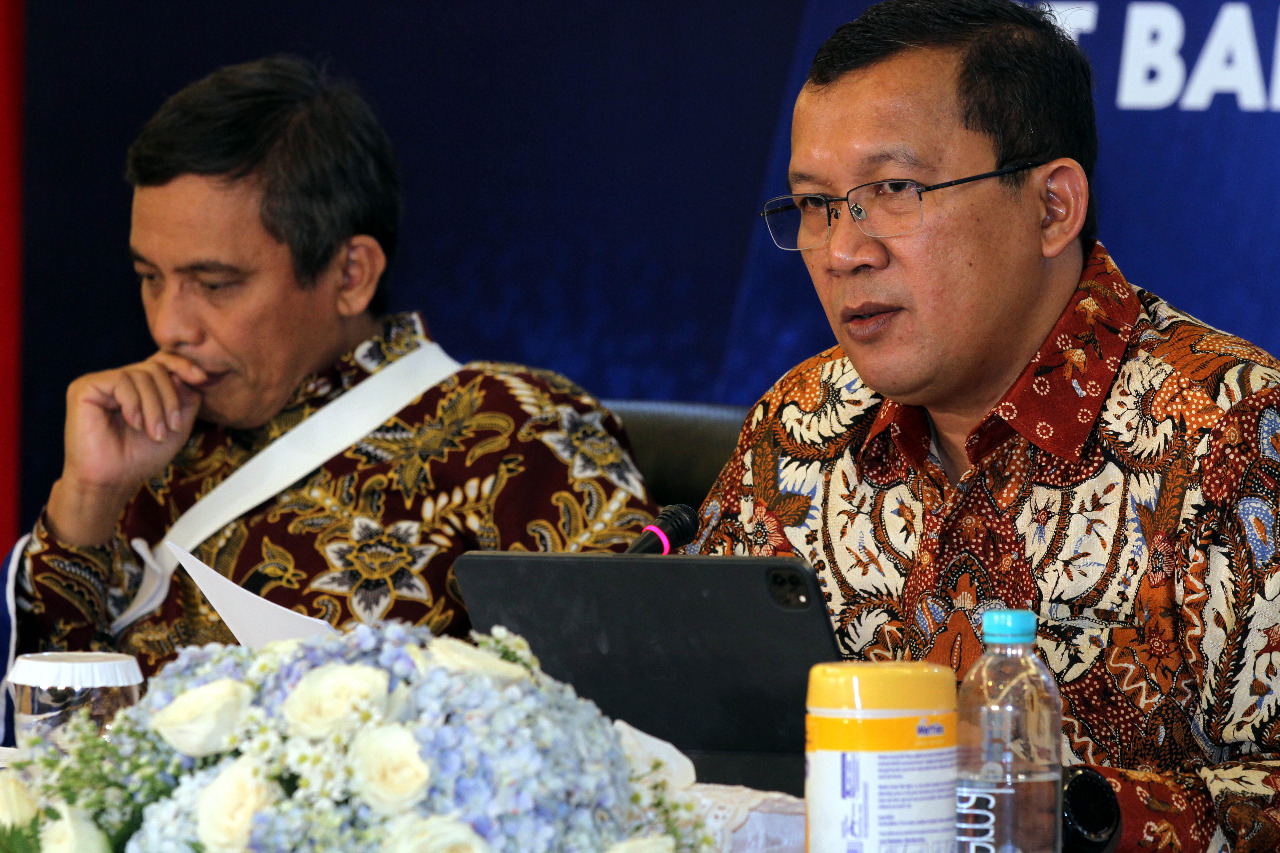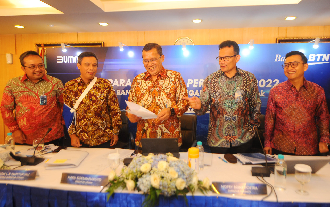 Direktur Utama Bank BTN Haru Koesmahargyo berbincang bersama Wakil Direktur Utama Bank BTN Nixon LP Napitupulu, Direktur Finance Bank BTN Nofry Rony Poetra, Direktur IT & Digital Bank BTN Andi Nirwoto dan Direktur Risk Management Bank BTN Setiyo Wibowo saat pers conference Kinerja Keuangan Bank BTN semester I/2022 di Jakarta, Kamis (15/9). Sepanjang periode Januari hingga Juni 2022 Bank BTN berhasil membukukan kinerja gemilang dengan meraih laba bersih Rp1,47 triliun melonjak 60%, penyaluran kredit naik 7,61% menjadi Rp286,152 triliun dan DPK tumbuh 2,99% menjadi Rp307,309 triliun.