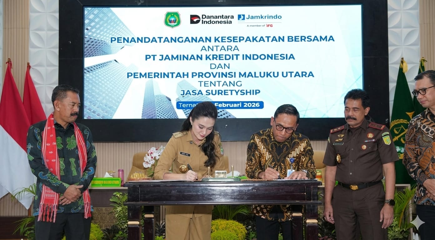 JAKARTA, Cobisnis.com – PT Jaminan Kredit Indonesia (Jamkrindo) menandatangani Kesepakatan Bersama dengan Pemerintah Provinsi Maluku Utara terkait pemanfaatan layanan Jasa Penjaminan Suretyship. Penandatanganan dilakukan di Ternate pada Senin (13/02/2026), bertepatan dengan agenda kerja sama antara Kejaksaan Tinggi Maluku Utara dan pemerintah daerah se-Maluku Utara mengenai pelaksanaan pidana kerja sosial.