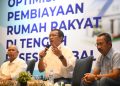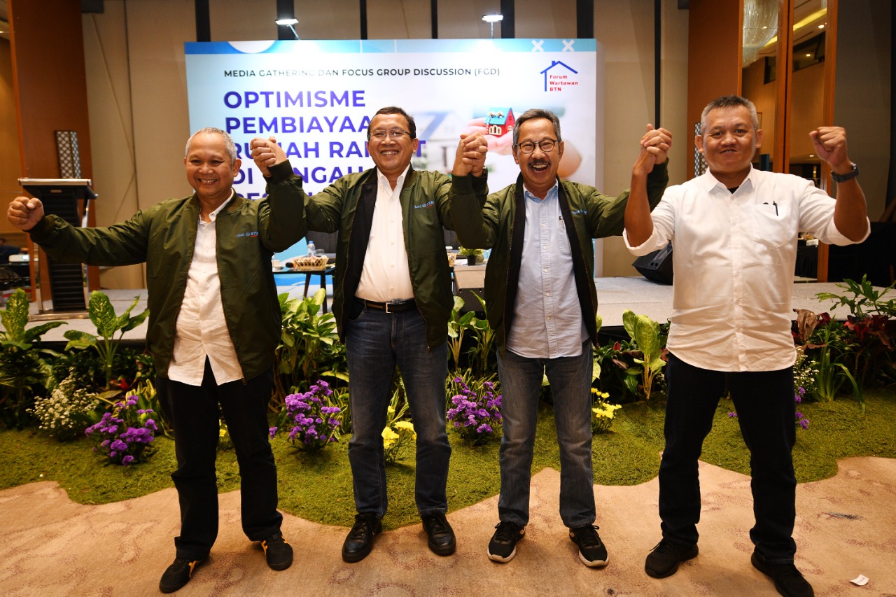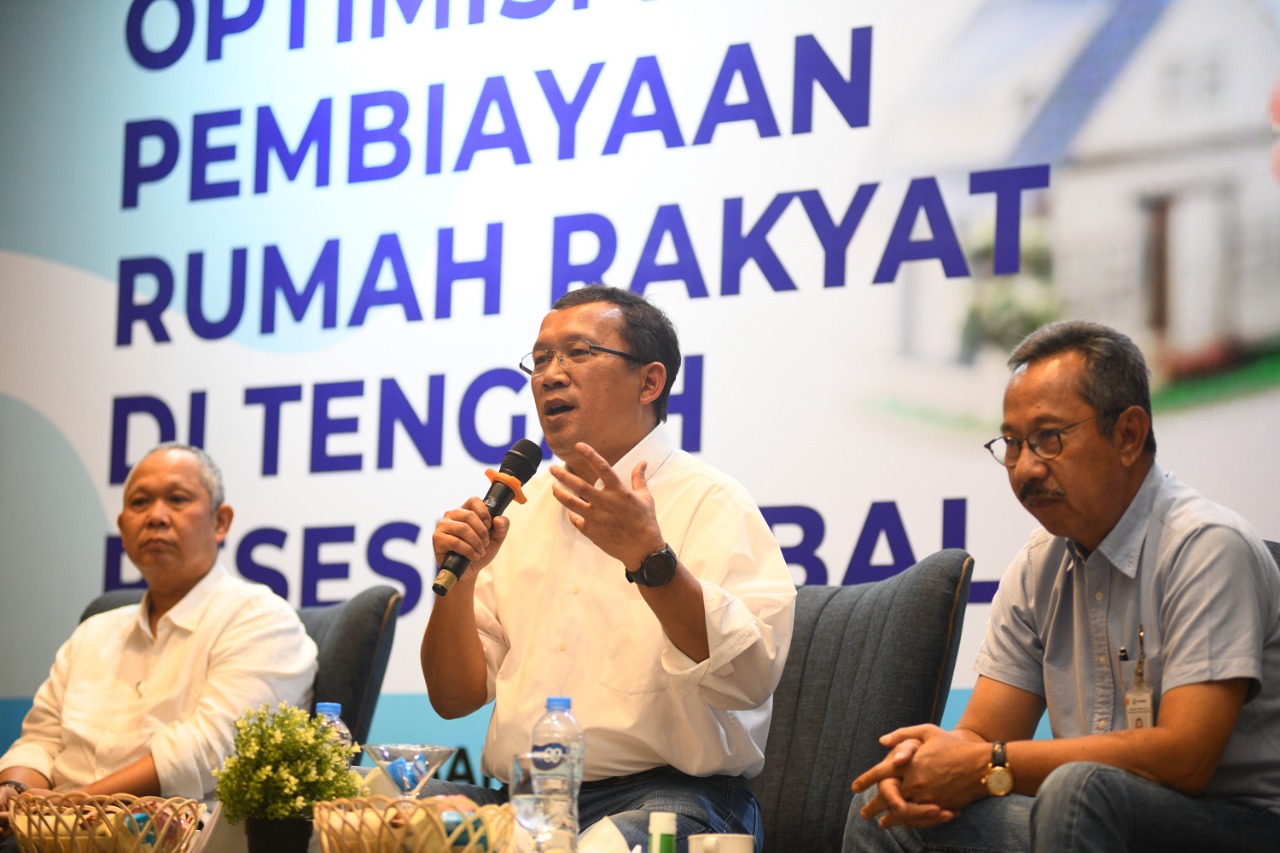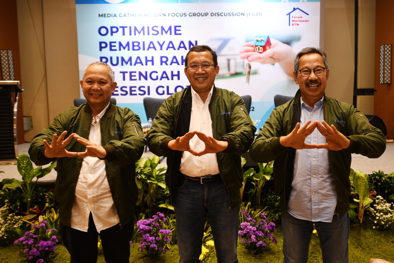 Direktur Utama PT Bank Tabungan Negara (Persero) Tbk Haru Koesmahargyo (tengah) bersama Komisioner Badan Pengelola Tabungan Perumahan Rakyat (BP Tapera) Adi Setianto (kanan) dan Dirjen Pembiayaan Infrastruktur Pekerjaan Umum dan Perumahan Kementerian PUPR Herry Trisaputra Zuna menjadi pembicara dalam acara Media Gathering dan Focus Group Discussion, di Bandung, Kamis (24/11/2022). BTN meyakini permintaan perumahan, terutama untuk rumah subsidi masih tinggi pada tahun mendatang. Hal ini sejalan dengan komitmen pemerintah yang terus meningkatkan alokasi anggaran subsidi untuk sektor perumahan.