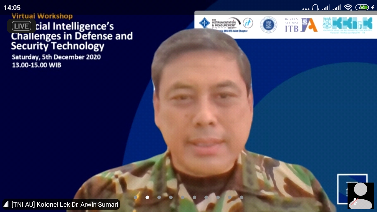 “Ada 14 kemungkinan penerapan AI di bidang pertahanan,” kata Kolonel Arwin di Virtual Workshop: AI’s Challenges in Defense & Security) yang digelar Mahasiswa Program Magister Kelompok Keahlian Instrumentasi dan Kontrol, Fakultas Teknik Industri ITB, Sabtu (5 Desember 2020).