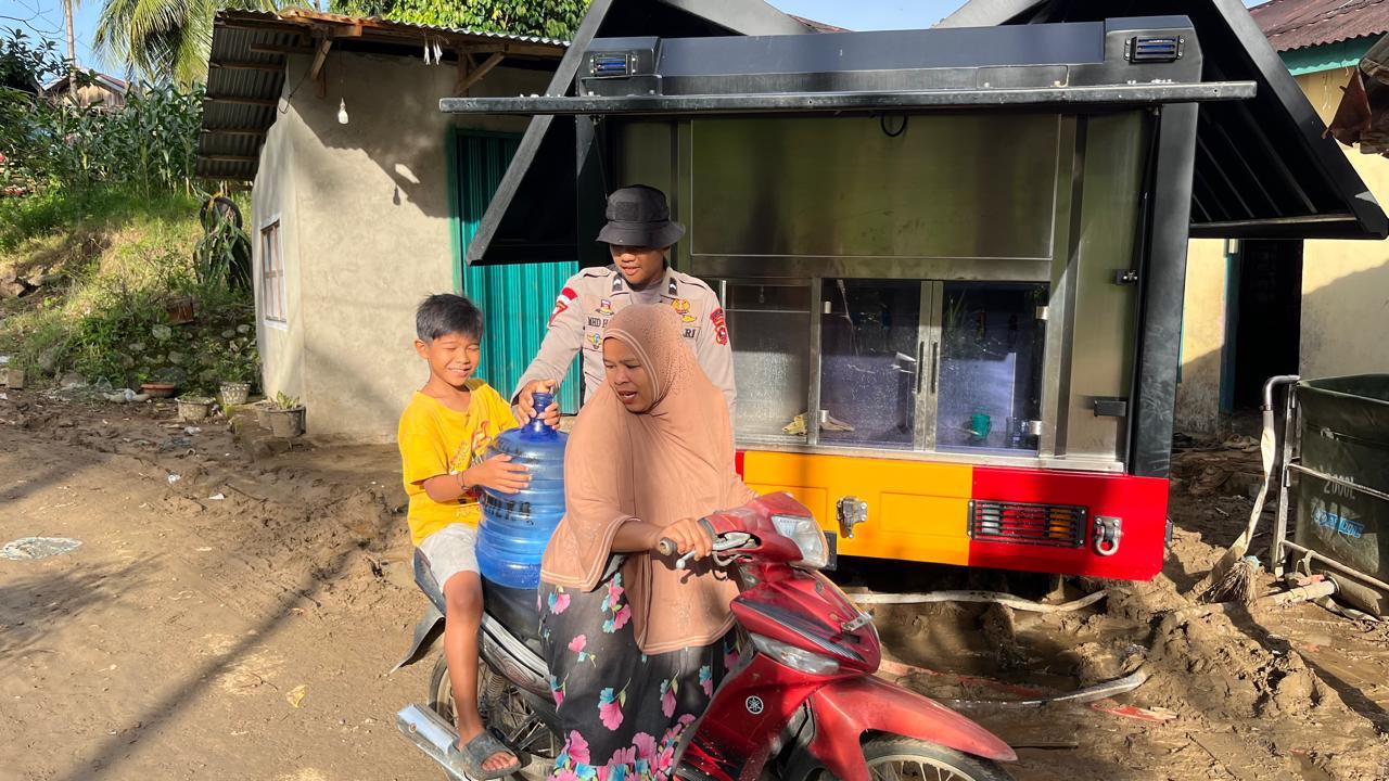 Air yang sebelumnya tidak layak minum diproses menggunakan perangkat water treatment hingga memenuhi standar kesehatan, kemudian dibagikan kepada warga dalam bentuk galon. Layanan ini menjadi sangat penting mengingat banyaknya sumber air yang rusak dan terbatasnya akses air bersih setelah bencana.