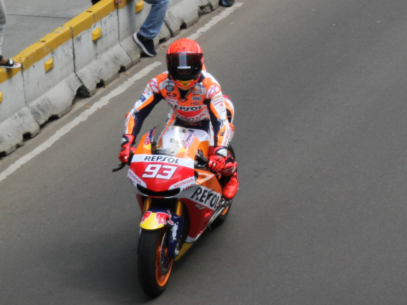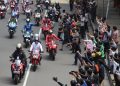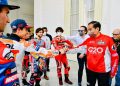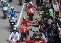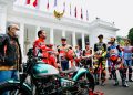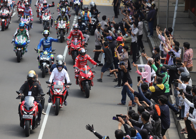 Presiden Joko Widodo (tengah) berjalan bersama para pembalap MotoGP sebelum melepas parade Moto GP di depan Istana Merdeka, Jakarta, Rabu (16/3/2022). Parade tersebut merupakan bentuk apresiasi atas kerja keras Pemerintah dalam mempersiapkan pagelaran MotoGP Mandalika pada 18-20 Maret 2022.
