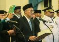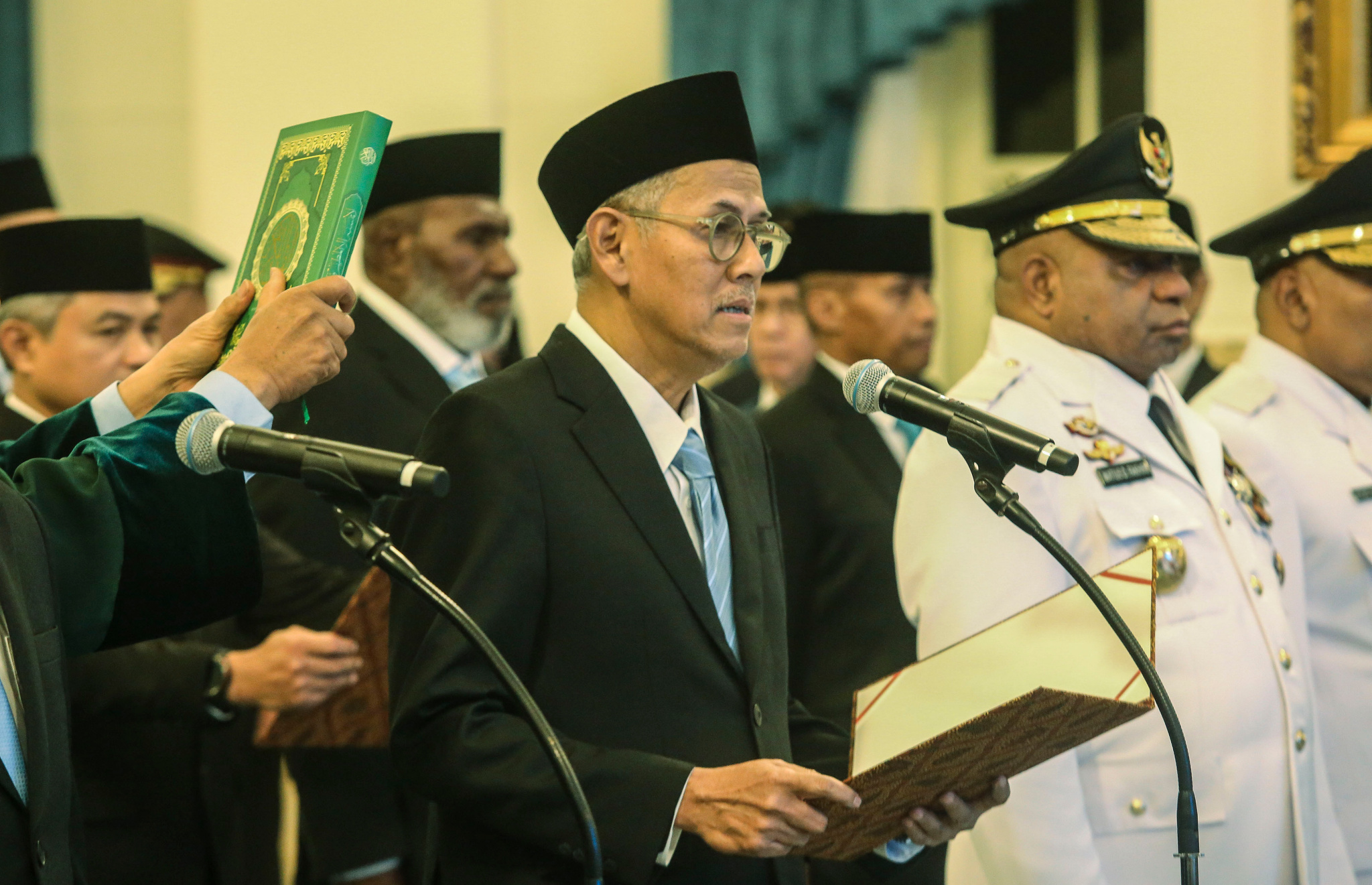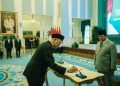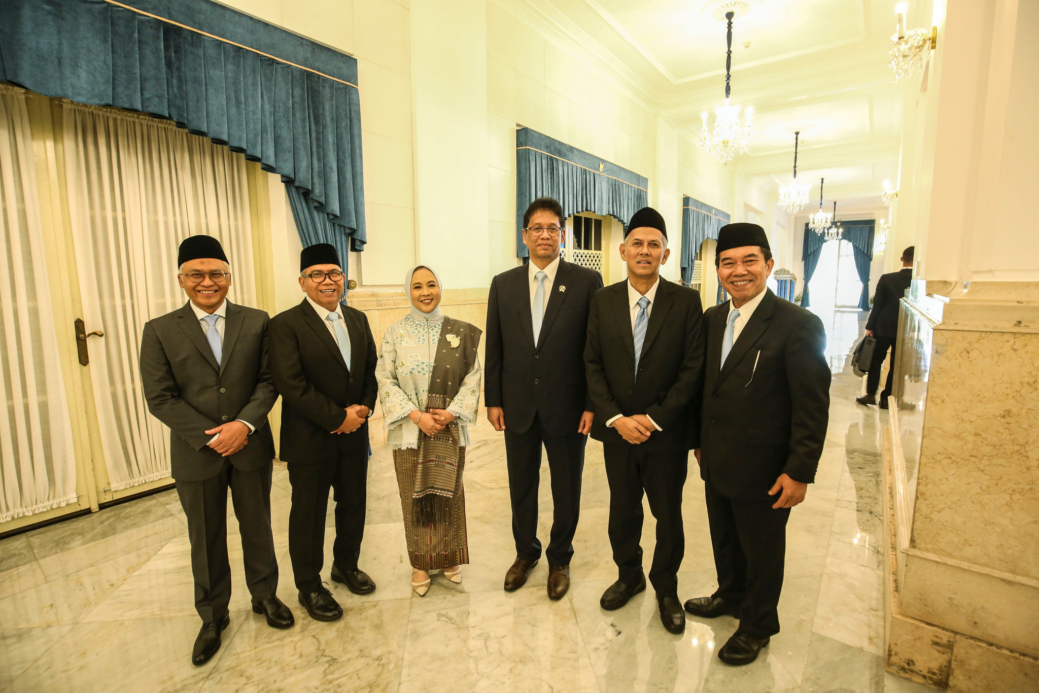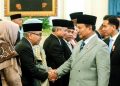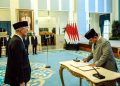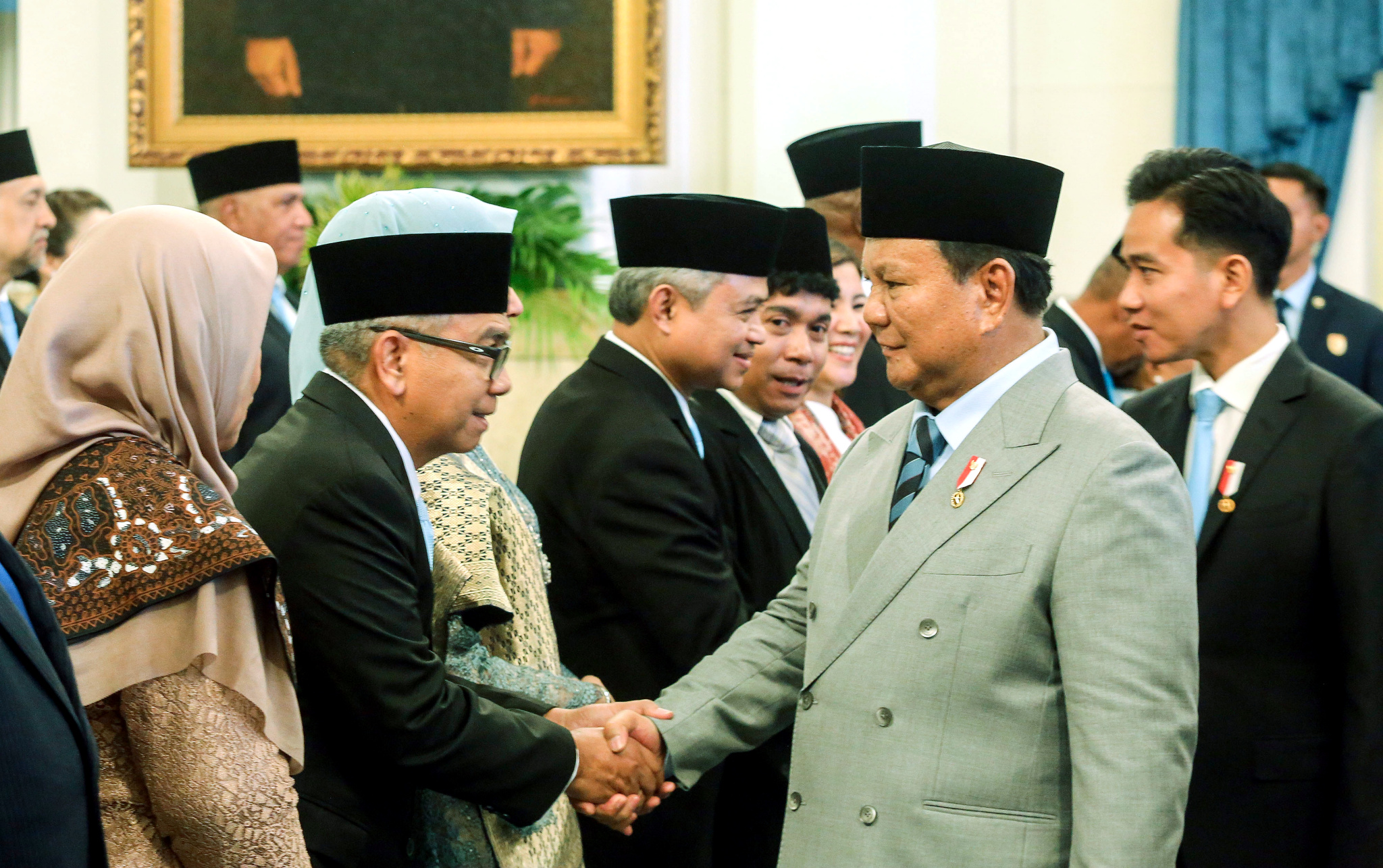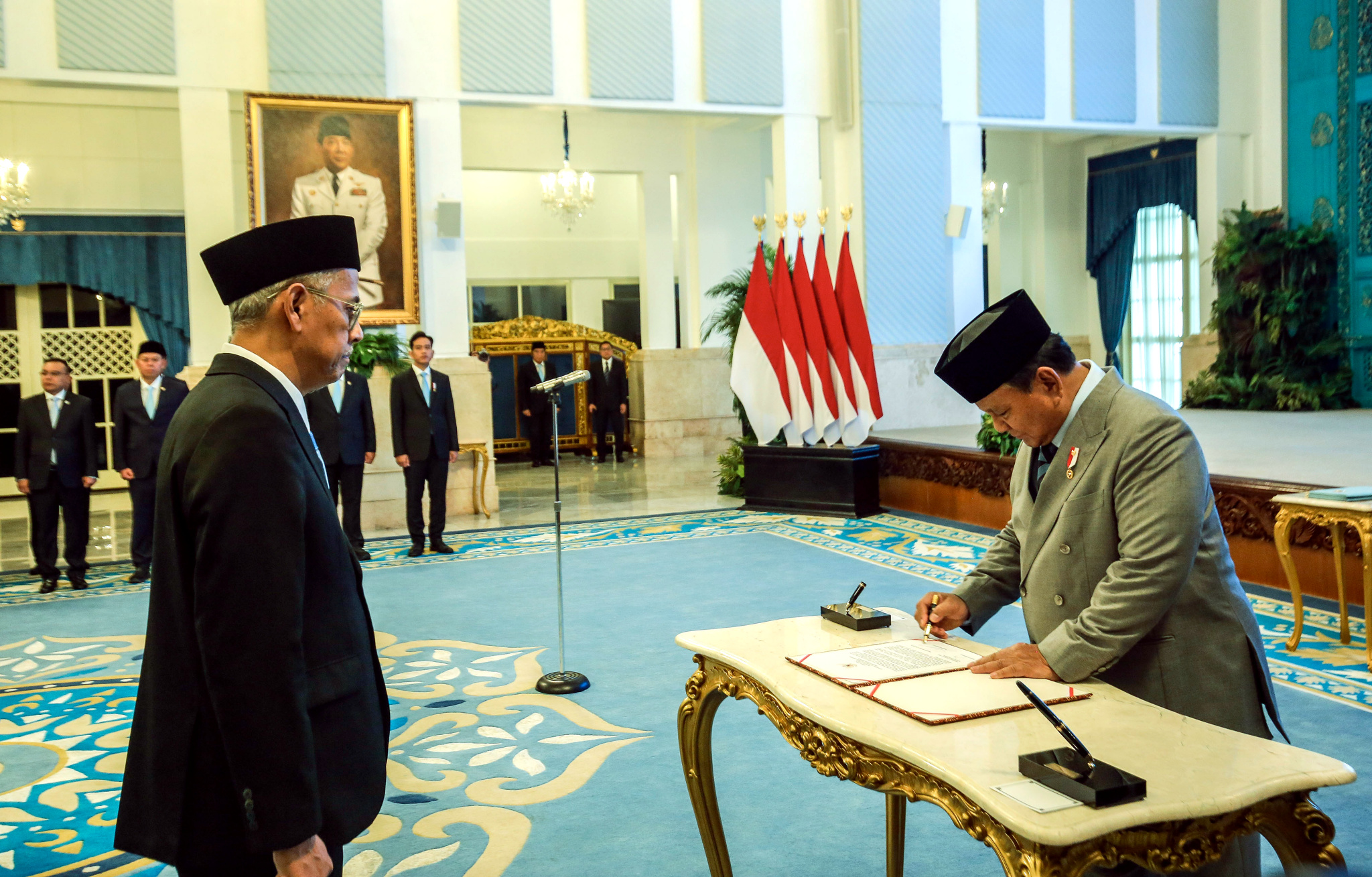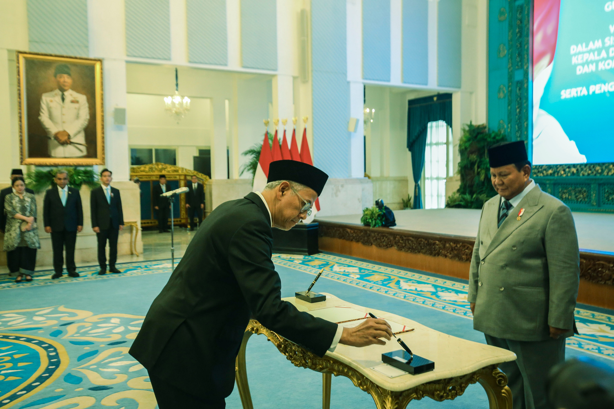 Presiden Prabowo melantik Ketua Dewan Komisioner (DK) Lembaga Penjamin Simpanan (LPS) Anggito Abimanyu (kiri) menandatangini sumpah jabatan saat acara pelantikan di Istana Negara, Jakarta, Rabu (8/10/2025). Presiden melantik Ketua DK LPS merangkap anggota Anggito Abimanyu, Wakil Ketua DK LPS merangkap anggota Farid Azhar Nasution dan anggota DK LPS Doddy Zulverdi, Ferdinan Dwikaroja Purba, Suminto, Aida S Budiman.
