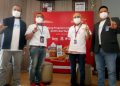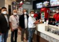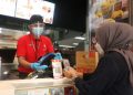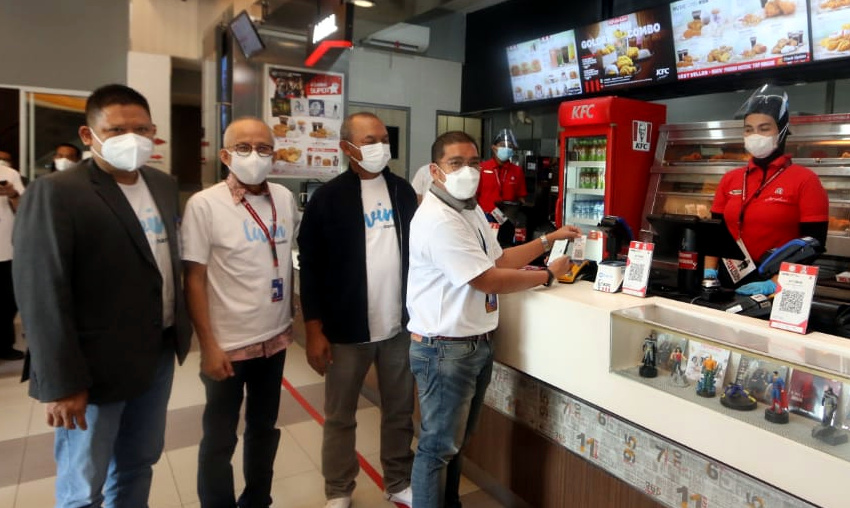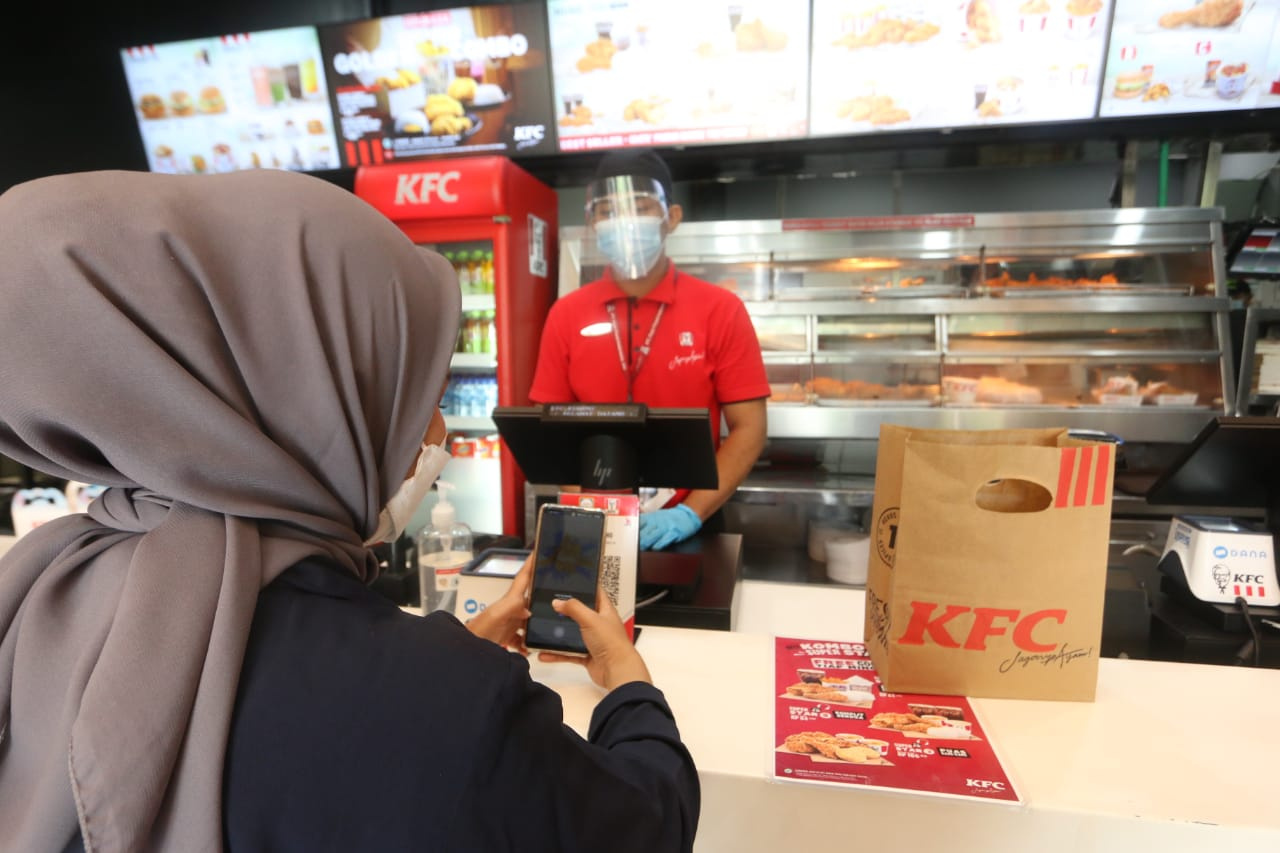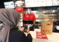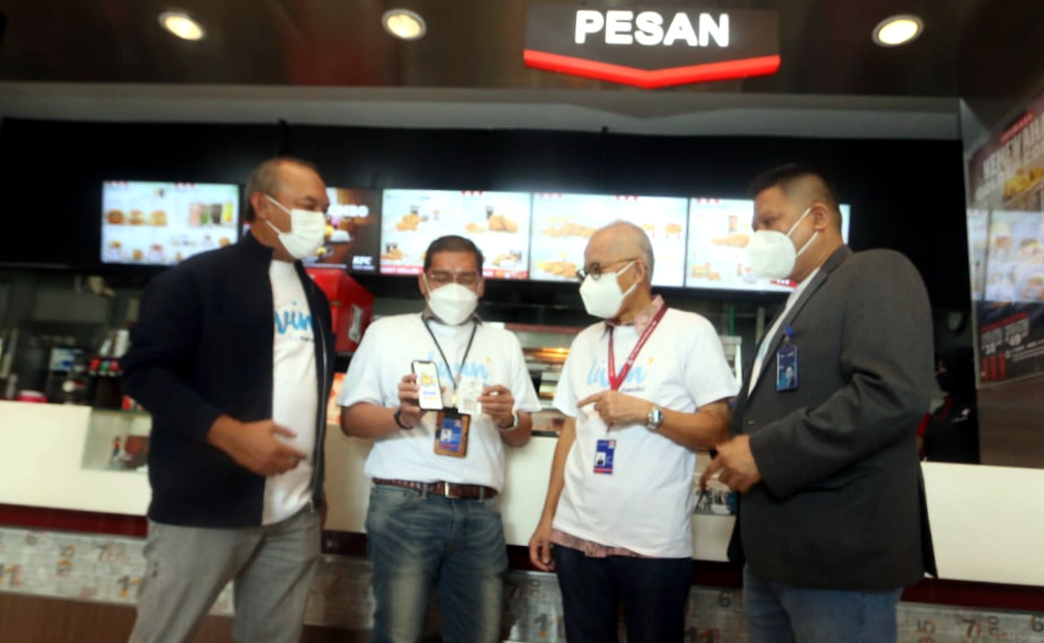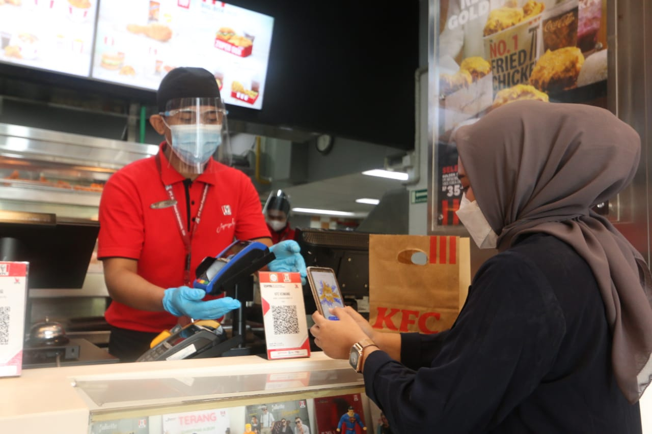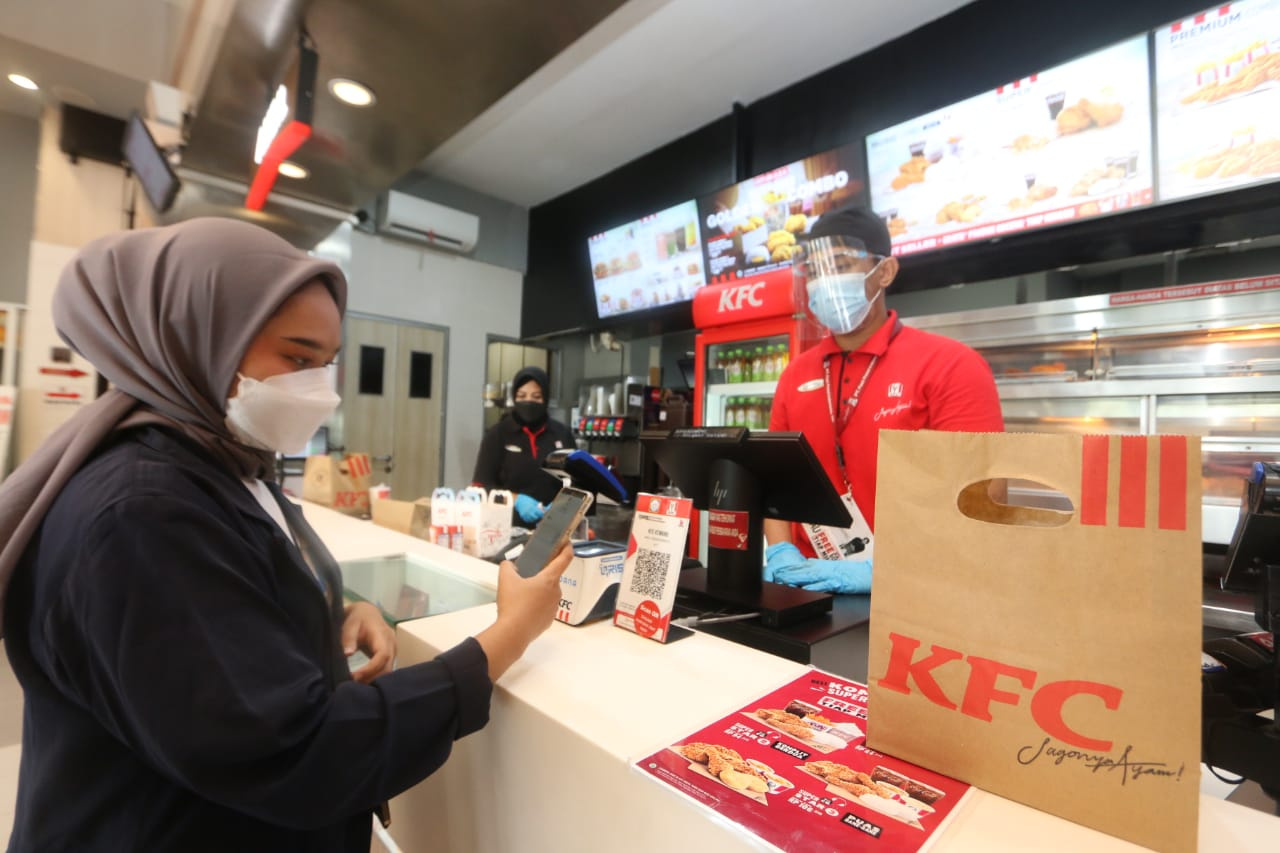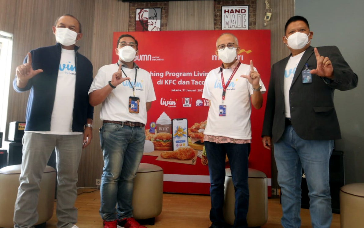 Regional CEO Bank Mandiri Kanwil VJakarta 3 Sulaeman, Chief Marketing Officer PT Fastfood Indonesia Hendra Yuniarto, Direktur PT Fastfood Indonesia Justinus Dalimin Juwono dan SVP Transaction Banking Retail Sales Bank Mandiri Thomas Wahyudi saat meluncurkan program promo belanja kuliner hemat dengan QRIS di gerai KFC dan Taco Bell Livin’ by Mandiri di salah satu gerai KFC di Jakarta, Senin (31/1). Pada periode pertama 1-3 Februari 2022, pengguna Livin’ berlogo kuning dapat menikmati bonus New Colonel All Star 1 KFC secara gratis dengan minimal transaksi Rp 100.000 serta Crunchy Taco untuk minimal belanja Rp150.000.