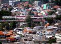 Kereta melintas disamping proyek double double track (DDT) Manggarai-Jatinegara di Jakarta, Rabu (29/7/2020). Secara keseluruhan pembangunan proyek double-double track (DDT) atau jalur rel dwiganda ditargetkan rampung tahun 2021. Proyek DDT itu meliputi segmen Cakung-Bekasi sepanjang 12 km dan Manggarai-Jatinegara sepanjang 3 km.