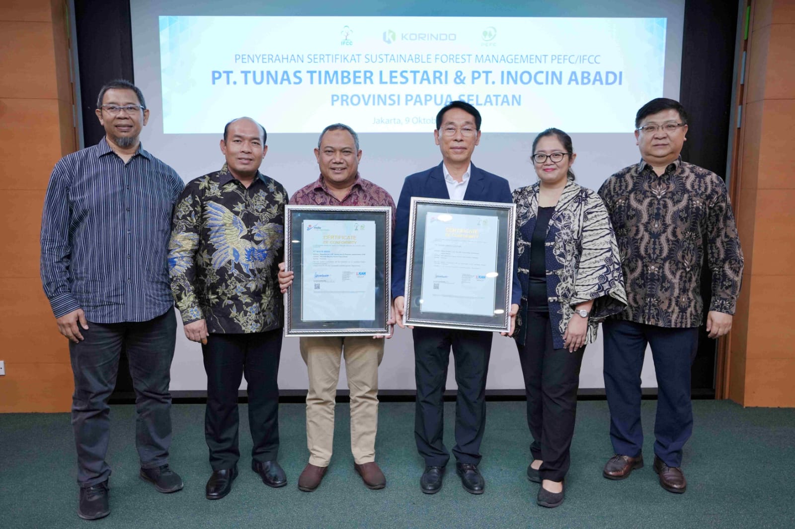 Penyerahan sertifikat tersebut dilakukan pada Senin (9/10) dengan dihadiri oleh Direktur Utama PT Tunas Timber Lestari dan PT Inocin Abadi, Mr. Kim Young Cheol, General Manager Divisi Plantation, Mr. Kim Nam Hong, Ibu Ragita sebagai perwakilan dari Direktur Executive IFCC dan Direktur PT Mutuagung Lestari, Sumarna.