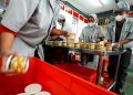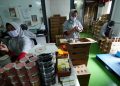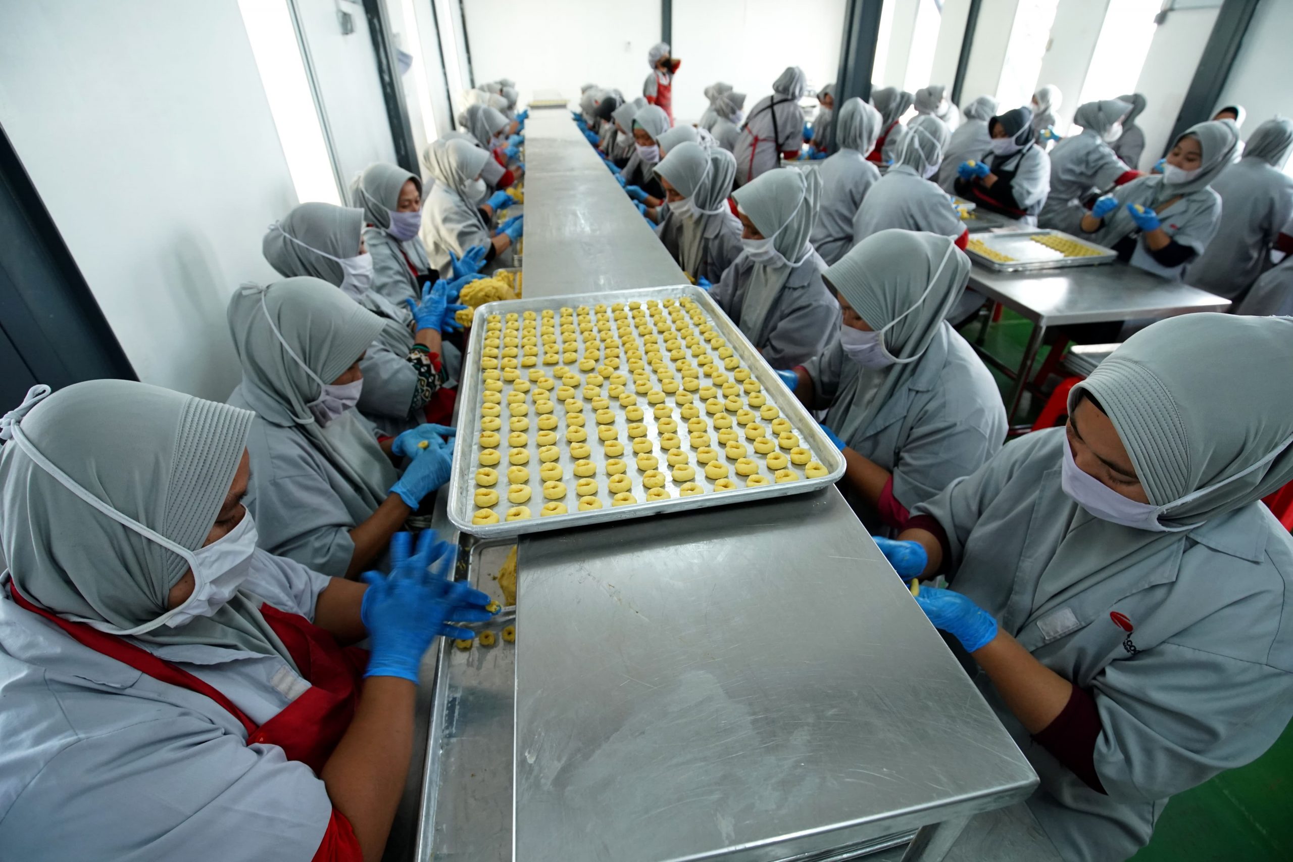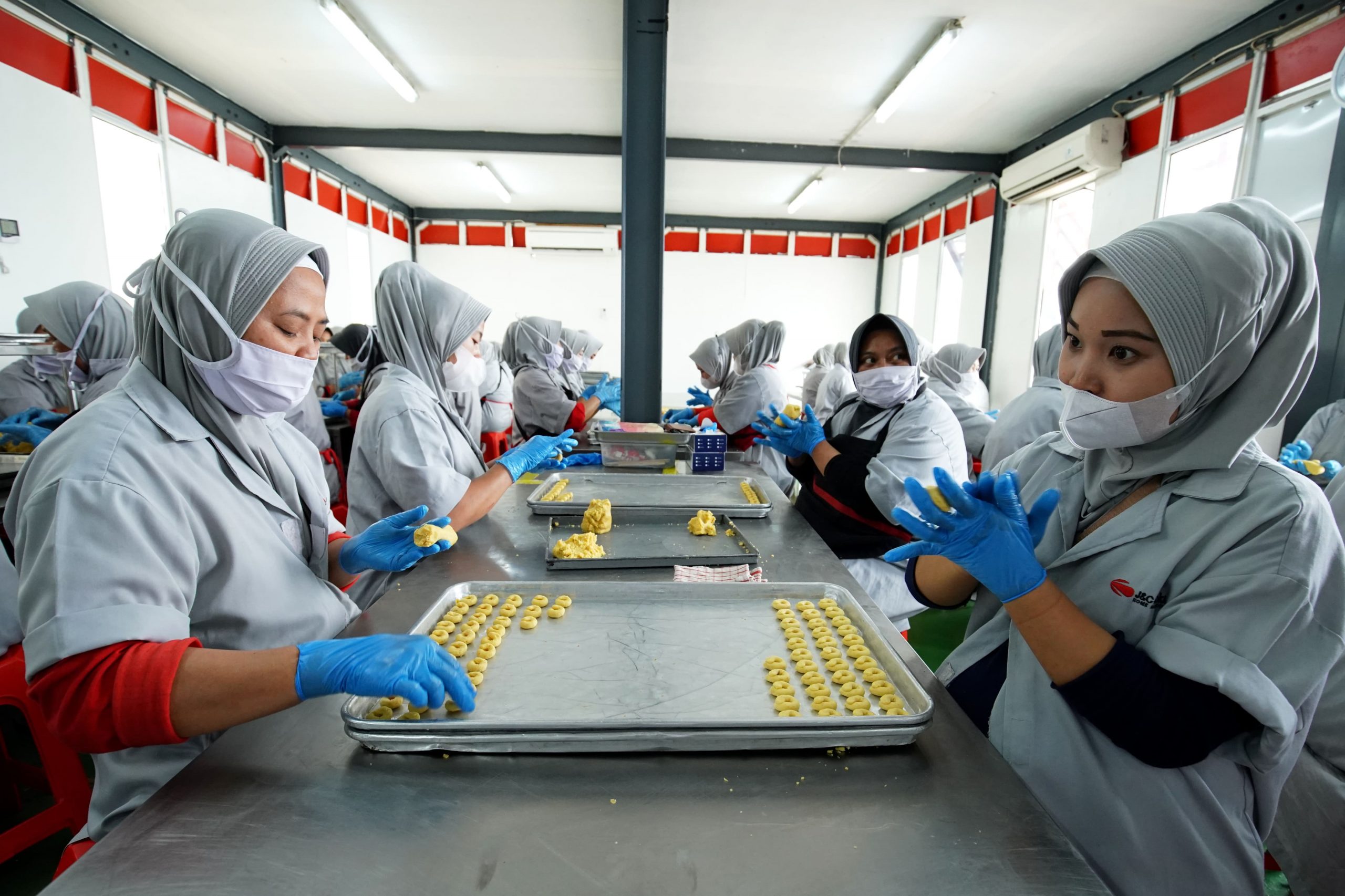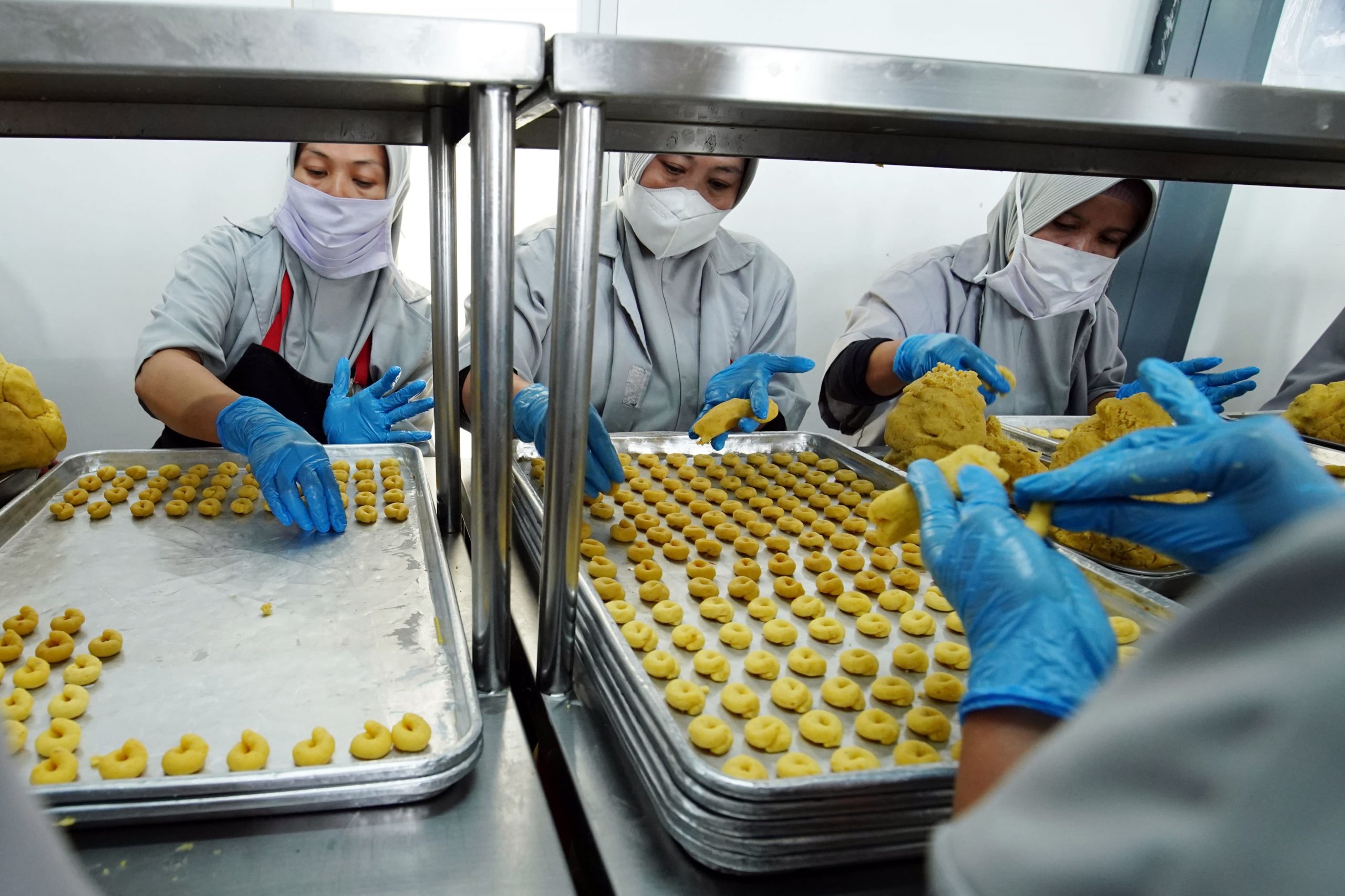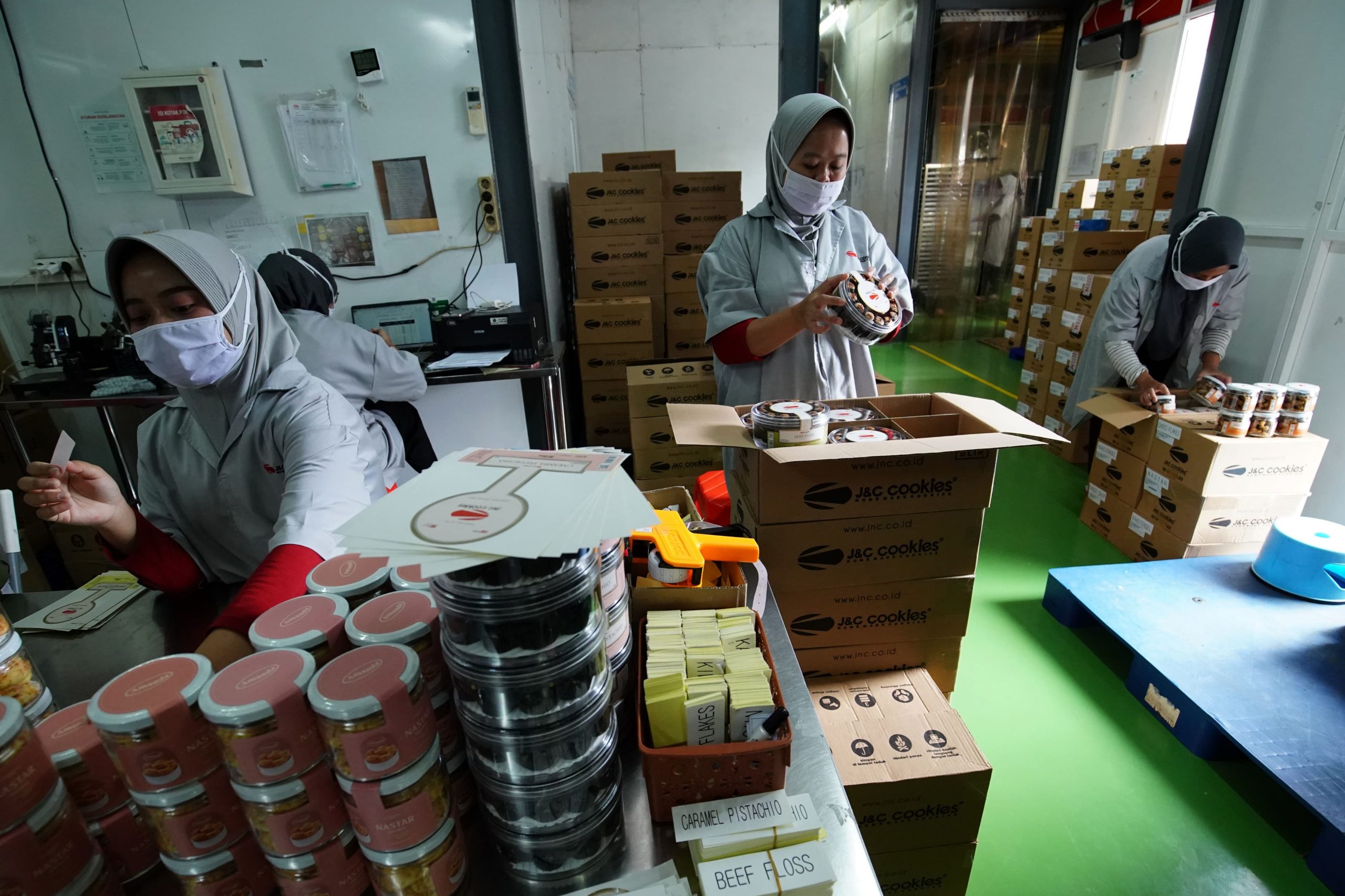 Pekerja melabeli toples kue kering di pabrik kue kering J&C Cookies di Bandung, Jawa Barat, Senin (23/2/2026). Produsen kue kering ini memproduksi 600 lusin per hari untuk memenuhi lonjakan permintaan kue kering di bulan Ramadhan tahun ini. Untuk memastikan kesiapan stok, manajemen J&C Cookies menambah hingga 500 pekerja lepas harian untuk membantu proses produksi. Foto/Rachman.
