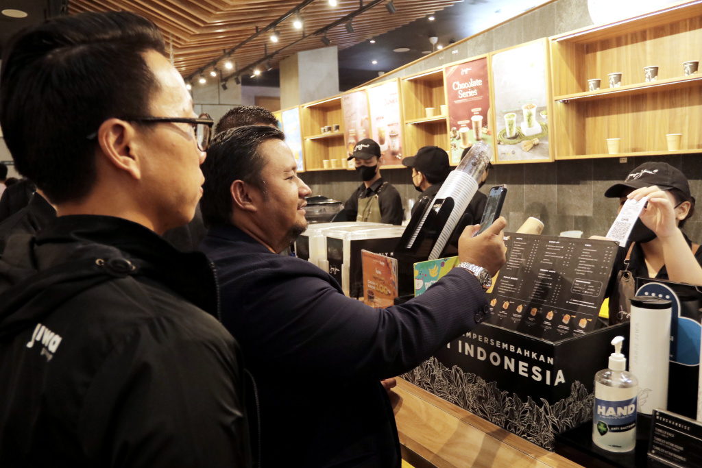 SVP Transaction Banking Retail Sales Bank Mandiri Thomas Wahyudi, RCEO Regional IV Jakarta 2 Bank Mandiri Trilaksito Singgih, CEO dan Founder Jiwa Group Billy Kurniawan serta VP of Operations Jiwa Group William Sutanto saat mencoba bertransaksi dengan QR livin’ by Mandiri di Jakarta, Rabu (19/10). Sebagai perayaan HUT Ke-24 dan International Coffee Day di bulan Oktober, Bank Mandiri berkolaborasi dengan brand kopi Janji Jiwa memberikan promo cashback 100% untuk new user dan 24% untuk existing user Livin’ by Mandiri saat bertransaksi dengan code QRIS pada Livin’ by Mandiri hingga akhir Oktober ini. Adapun, cashback berlaku untuk pembelian dua menu ekslusif bertajuk Livin’ Honey Pistachio Latte dan Livin’ Honey Orange Coffee di gerai-gerai kopi Janji Jiwa.