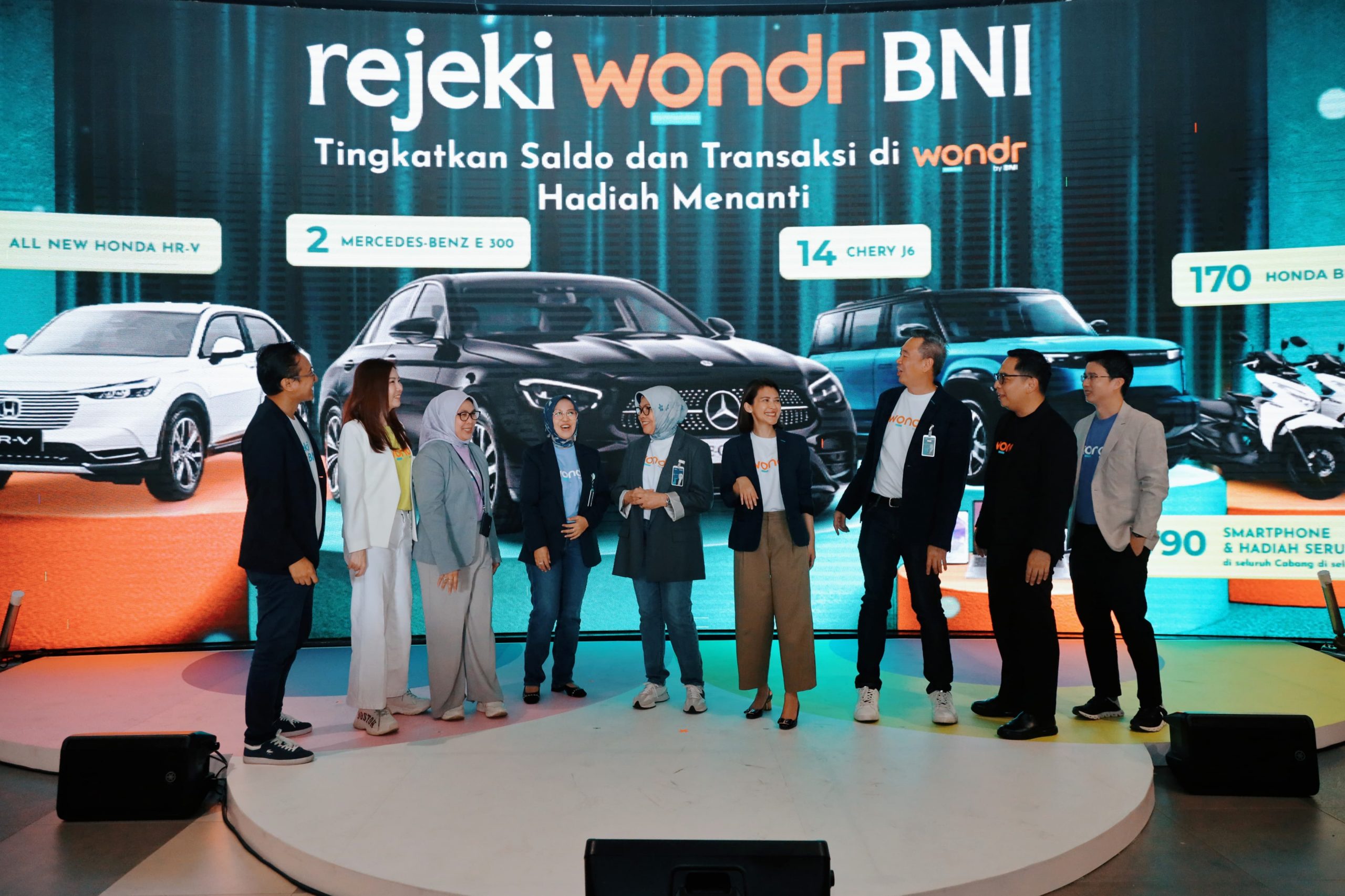 Direktur Consumer Banking BNI Corina Leyla Karnalies (tengah) bersama jajaran direksi, SEVP dan Kepala Divisi BNI di tengah peluncuran Program Undian Rejeki wondr BNI di Menara BNI Pejompongan, Jakarta, Rabu (16/4/2025). PT Bank Negara Indonesia (Persero) Tbk atau BNI kembali menghadirkan program Undian Rejeki wondr BNI sebagai bentuk apresiasi kepada Nasabah setia dan menjaring nasabah baru.