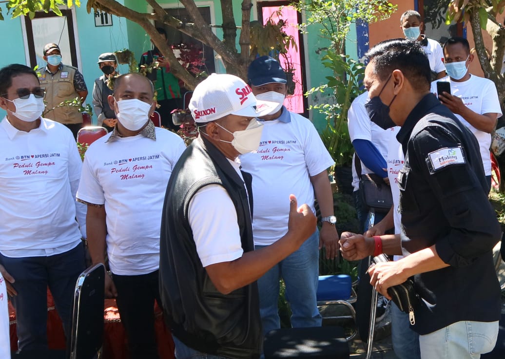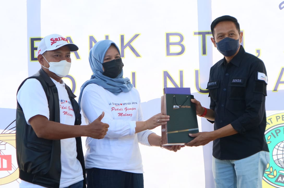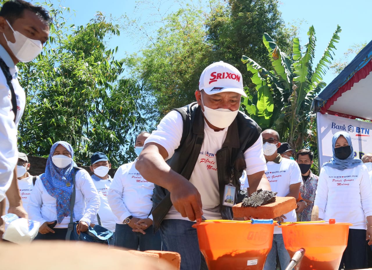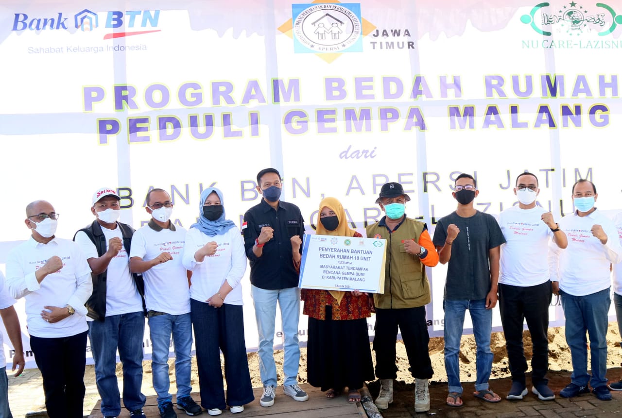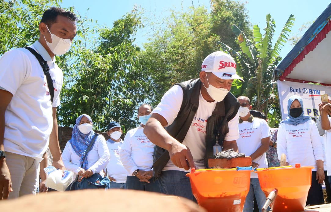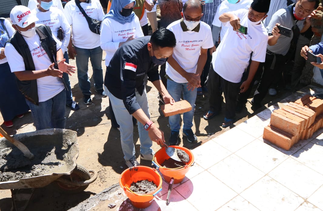 PT Bank Tabungan Negara (Persero) Tbk Kantor Cabang Malang bersama DPD Apersi Jatim, NU Care, IPPAT Malang dan INI melakukan kegiatan sosial berupa renovasi sejumlah rumah korban gempa yang menimpa rumah masyarakat desa Majangtengah, Kabupaten Dampit, Malang, Sabtu (24/4). Renovasi rumah ini merupakan bagian dari kegiatan corporate sosial responsibility (CSR) Bank BTN yang disiapkan perseroan untuk membantu masyarakat terdampak bencana atau secara sosial ekonomi layak dibantu agar dapat hidup layak di tengah masyarakat umumnya. Tampak Kepala Cabang BTN Malang Surasta meletakkan batu pertama renovasi rumah warga disaksikan oleh Sekda Kab Malang, Dr.Ir Wahyu Hidayat MM, Kepala BPBD Kabupaten Malang Bambang Istiawan, Ketua DPD Apersi Jatim Makhrus Soleh, Ketua INI Imam, Ketua IPPAT Malang Arini.