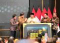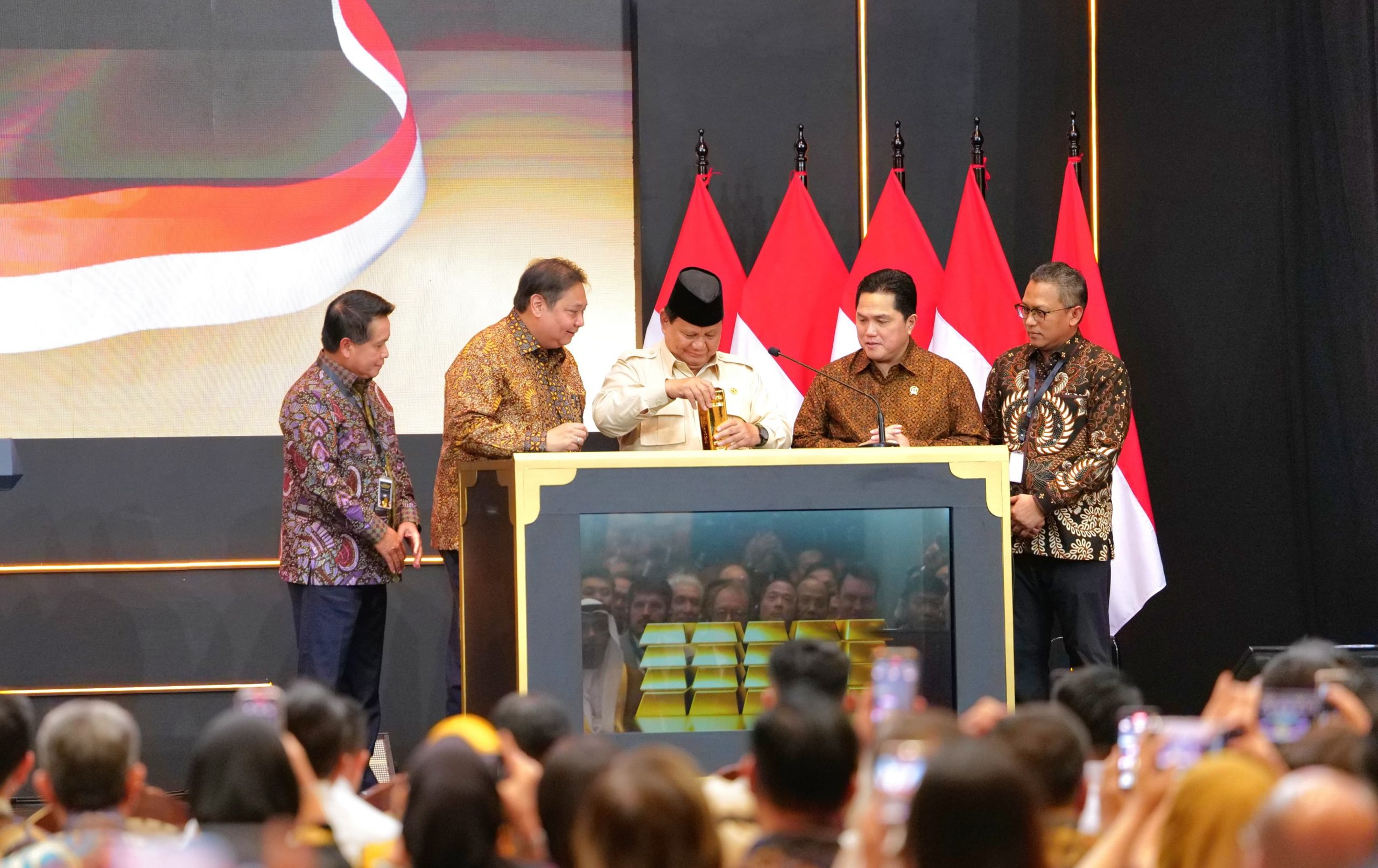 Layanan Bank Emas diresmikan oleh Presiden Republik Indonesia Prabowo Subianto (tengah) didampingi Direktur Utama BSI Hery Gunardi (kiri), Menteri Koordinator Bidang Perekonomian Airlangga Hartanto (dua dari kiri), Menteri BUMN Erick Thohir (empat dari kiri) dan Direktur Utama PT Pegadaian Damar Latri Setiawan (paling kanan). Jakarta, Rabu (26/2). PT Bank Syariah Indonesia Tbk (BSI) Resmi menjadi bank emas syariah pertama di Indonesia. Bank Emas menjadi bagian transformasi Besar untuk pengembangan ekosistem keuangan syariah di Indonesia.