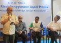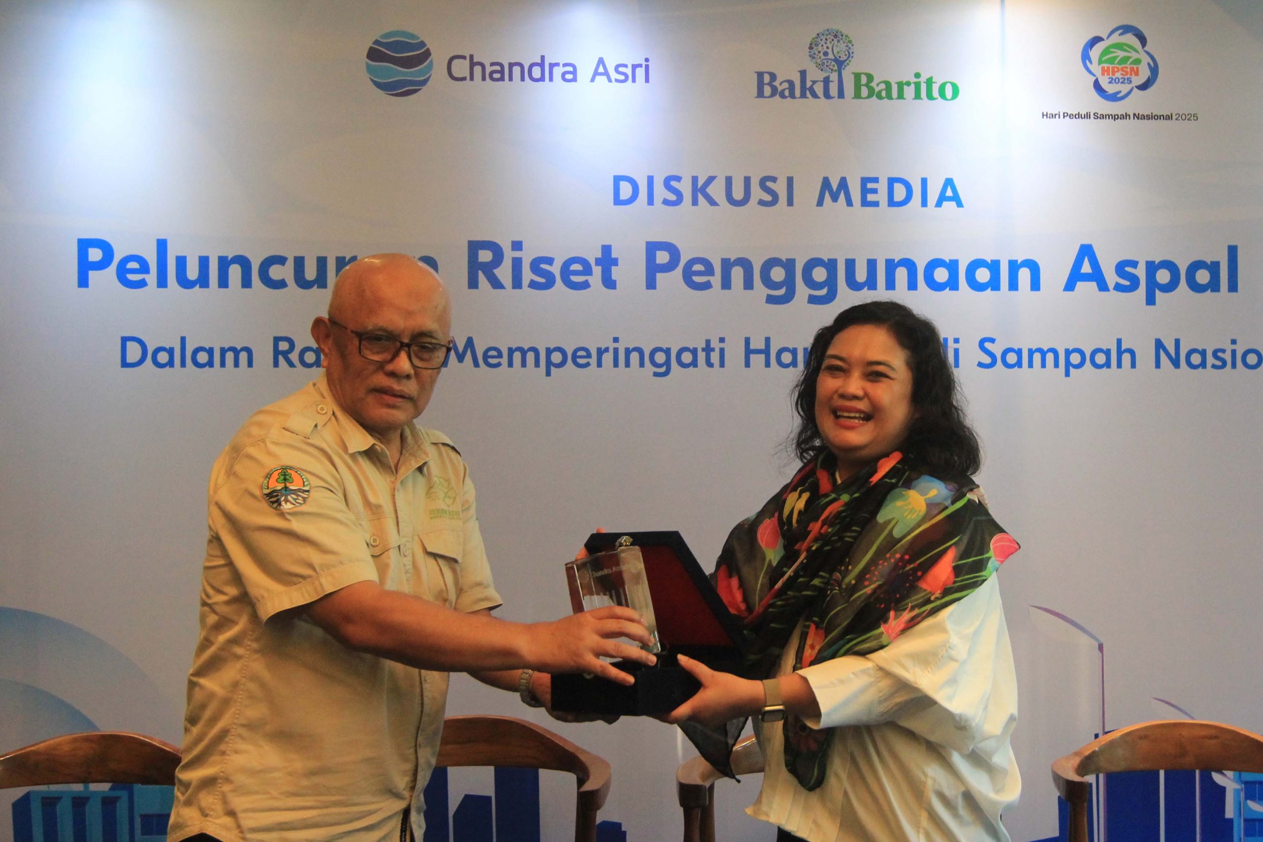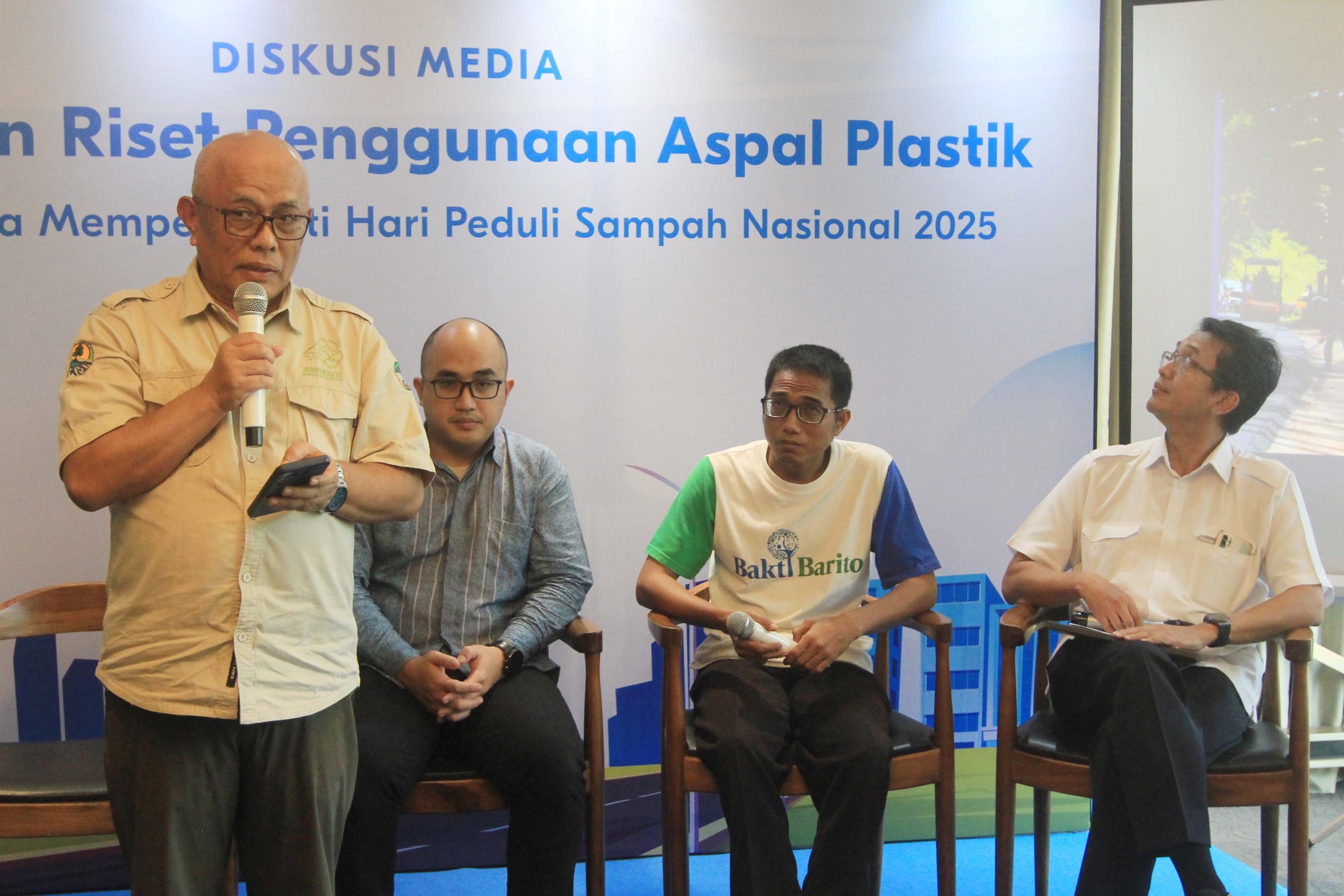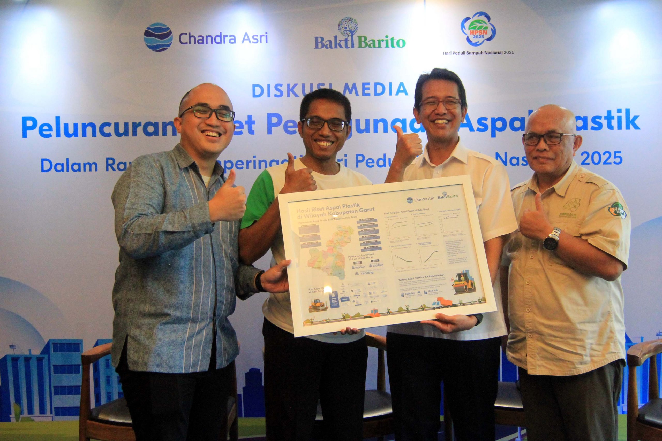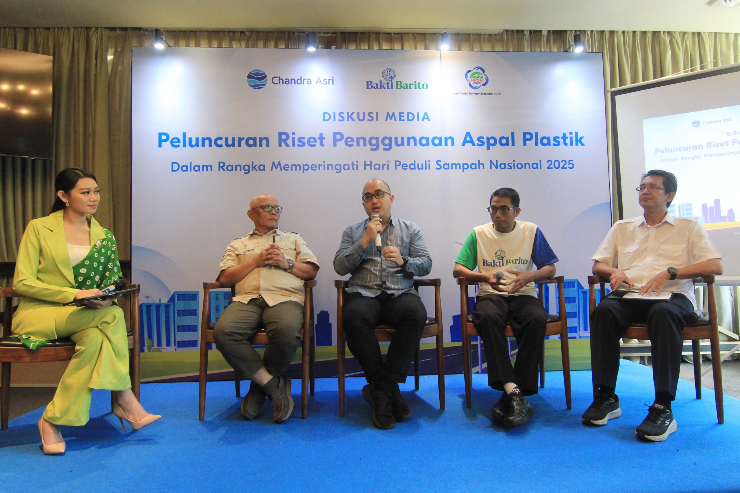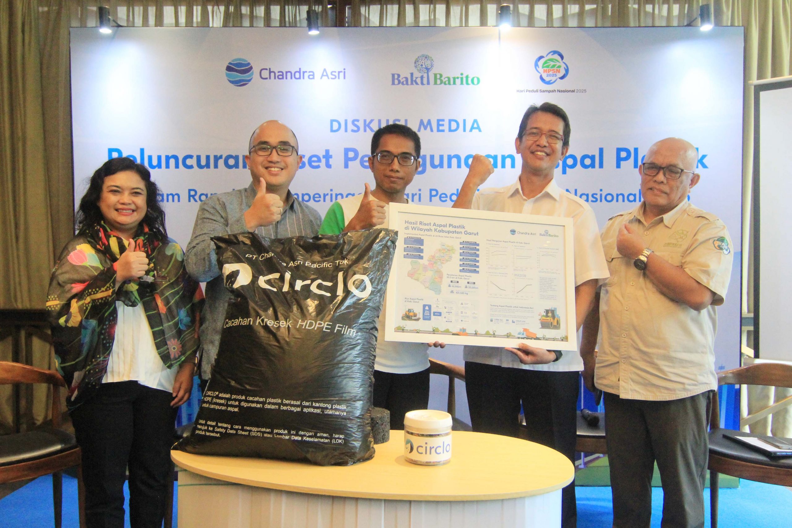 Direktorat Pengelolaan Sampah, Kementerian Lingkungan Hidup dan Kehutanan (KLHK), Ujang Solihin Sidik (kanan), Kepala Balai Bahan Jalan Kementerian Pekerjaan Umum (PU), Yohanes Ronny (kedua kanan), Circular Economy & Partnership Manager Chandra Asri Group, Nicko Setyabudi (kedua kiri), Head of Corporate Communications Chandra Asri Group, Chrysanthi Tarigan (kiri), Koordinator Program Lingkungan Hidup Yayasan Bakti Barito (YBB), Yoris Sindhu Sunarjan (tengah) berfoto bersama usai acara diskusi media Peluncuran Riset Penggunaan Aspal Plastik dalam rangka Hari Peduli Sampah Nasional (HPSN) 2025 di Jakarta, Selasa, 25 Februari 2025.