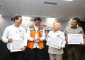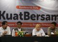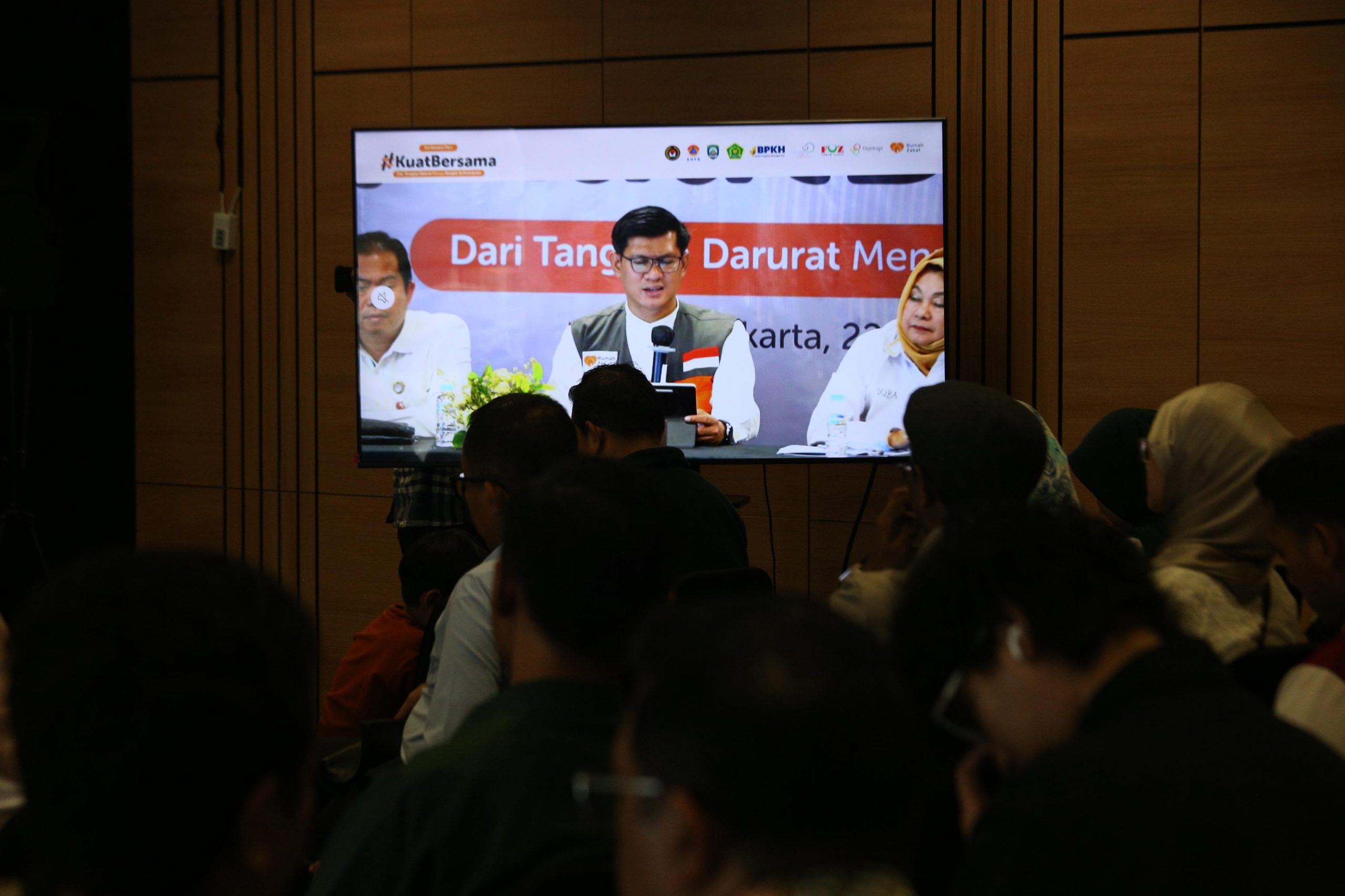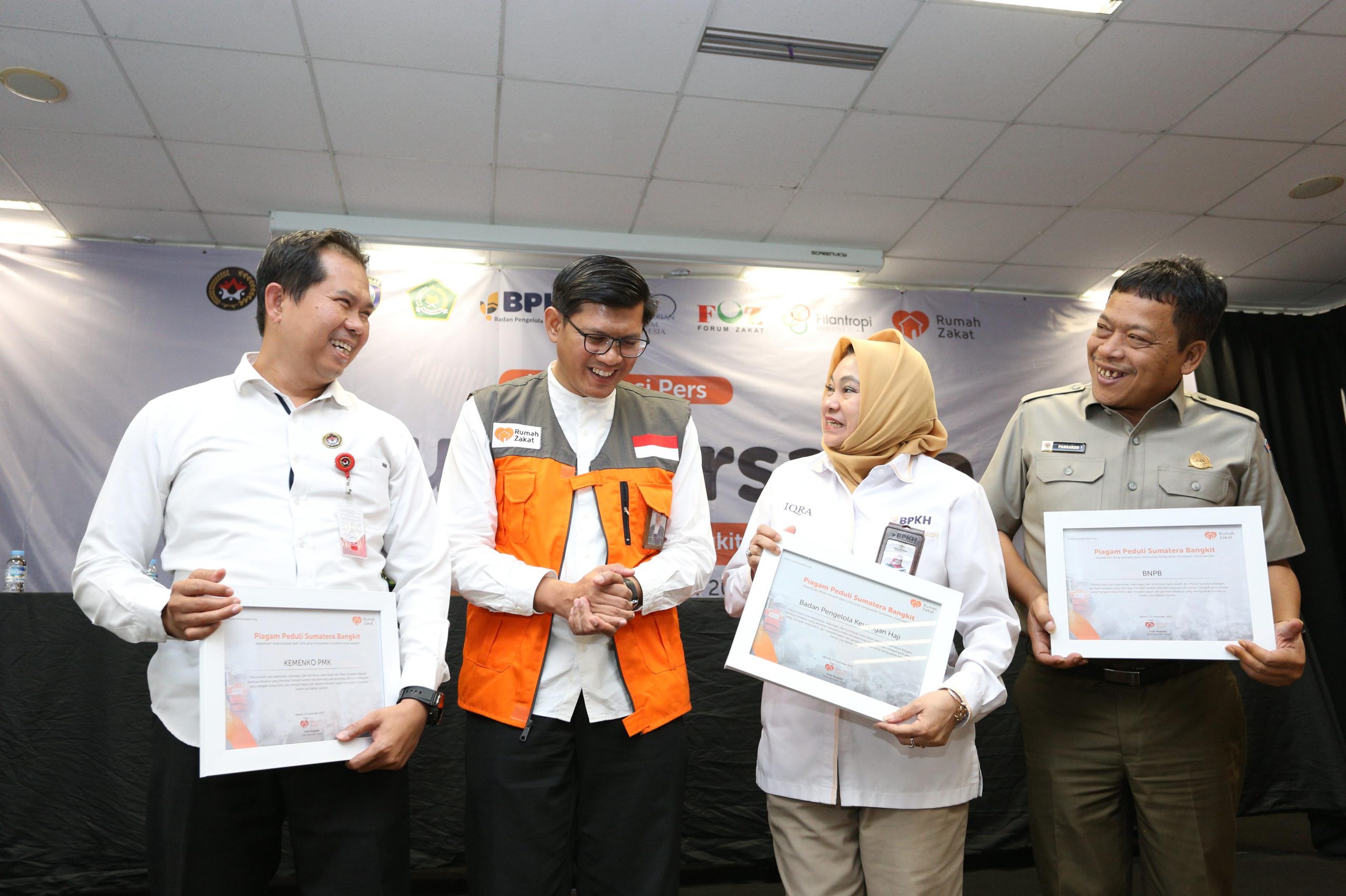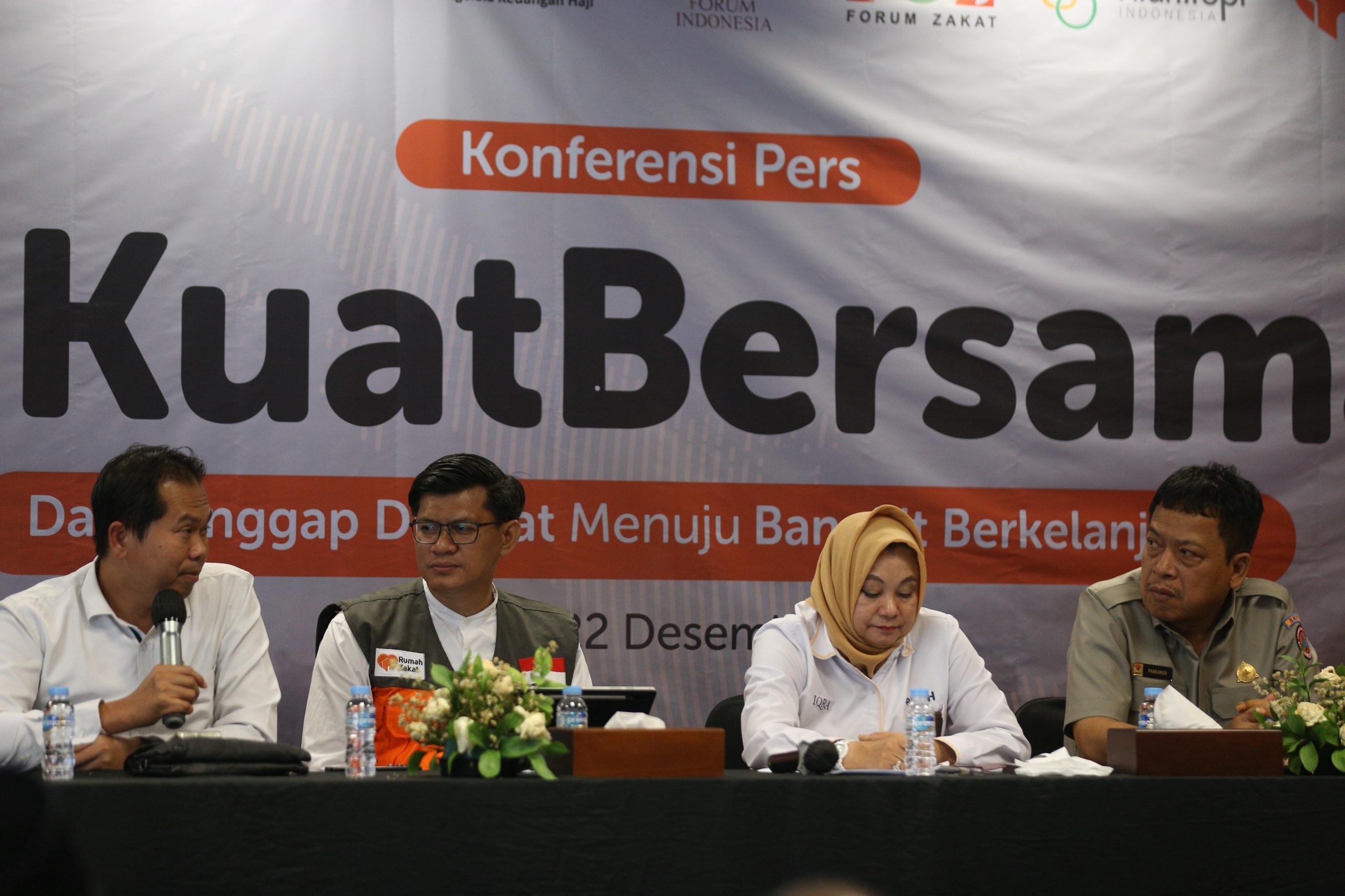 (Dari kanan) CEO Rumah Zakat Irvan Nugraha menjelaskan desain hunian sementara, masjid darurat, MCK, sekolah darurat Rumah Zakat yang akan dibangun untuk warga terdampak bencana Aceh, Sumatera Utara dan Sumatera Barat kepada Asisten Deputi Moderasi Beragama Kemenko PMK Asep Sunandar, Pimpinan Badan pelaksana BPKH Sulistyowati dan Deputi Bidang Pencegahan Badan Nasional Penanggulangan Bencana (BNPB) Pangarso Suryotomo saat peluncuran program “Kuat Bersama” di Jakarta, Senin (2212/2025).