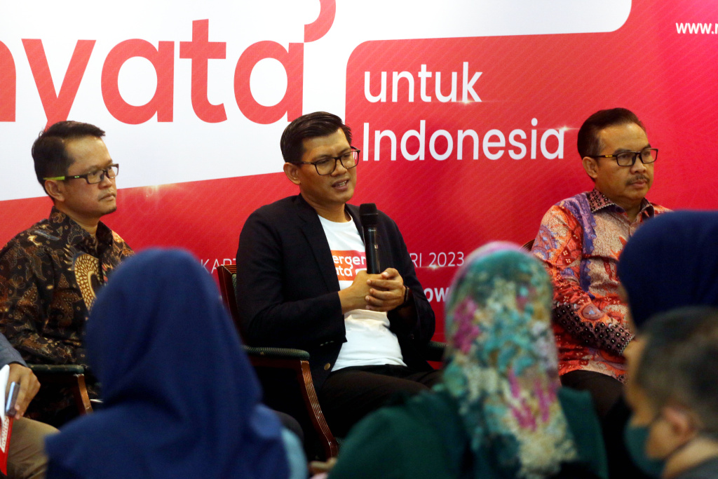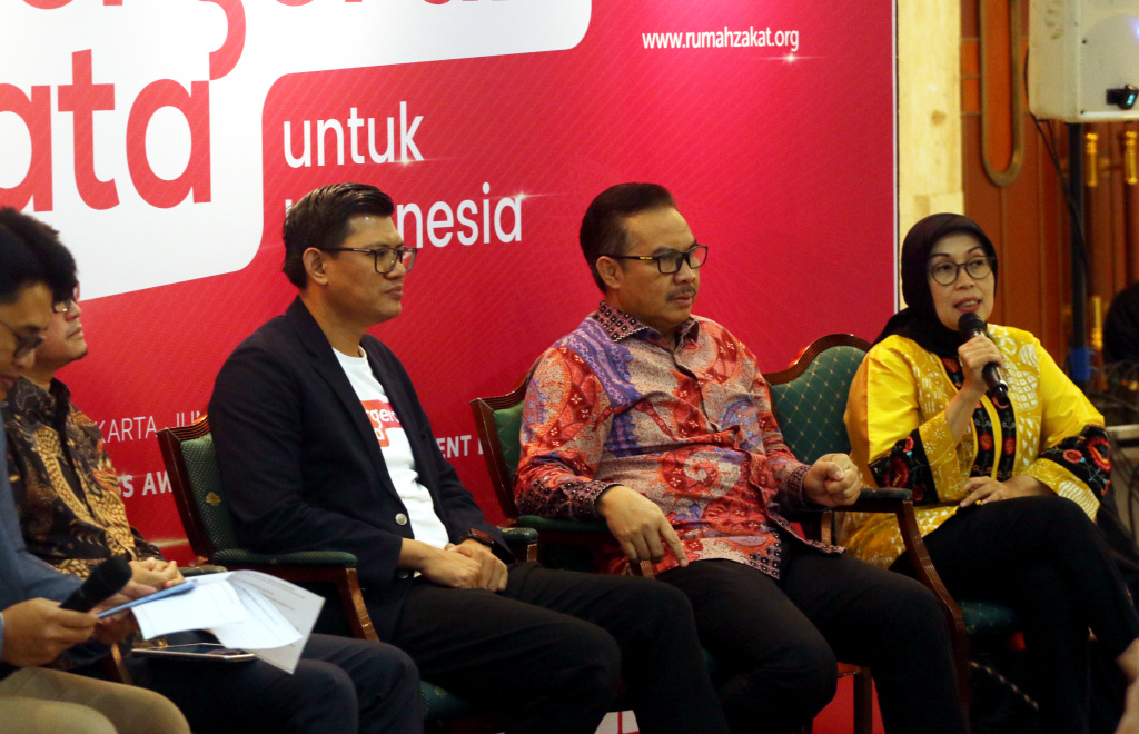 Kepala Badan Kependudukan dan Keluarga Berencana Nasional (BKKBN) Hasto Wardoyo (kedua kanan), Chief Executive Officer Rumah Zakat Irvan Nugraha (kedua kiri), Plt. Bidang Kependudukan dan Ketenagakerjaan Bappenas Maliki (kiri) dan Divisional Head of CSR PT Adaro Energy, Tbk Okty Damayanti berbincang saat paparan publik dan peluncuran Gerakan #BergerakNyata di Jakarta, Jumat (24/2). Rumah Zakat meluncurkan Gerakan #BergerakNyata untuk Indonesia. Gerakan ini untuk mengajak masyarakat melakukan aksi nyata untuk kebaikan diri sendiri dan sekitarnya. Rumah Zakat tahun ini menargetkan membantu 1,5 juta penerima manfaat dan 20 persen dari penerima manfaat program ekonomi, keluar dari garis kemiskinan.