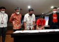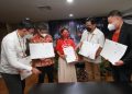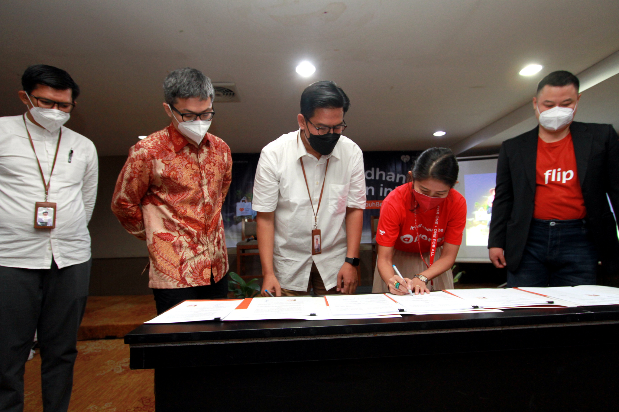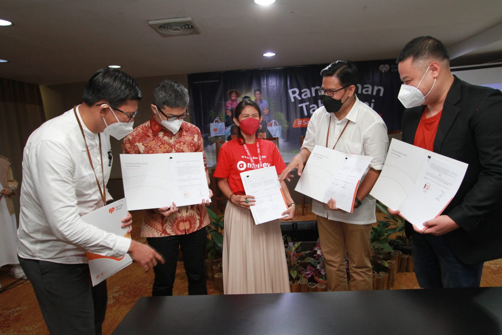 Dari kiri: Chief Marketing Officer Rumah Zakat Irvan Nugraha, Assistant Vice President External Affairs Shipper Even Alex Chandra, Head of AirAsia Money Nadia Hasanuddin, Chief Executive Officer Rumah Zakat Nur Efendi dan Vice President Enterprise Growth & BD Flip Henri Halim menunjukan nota kesepahamn kolaborasi yang telah ditandatangani, Selasa (15/3/2022).
