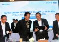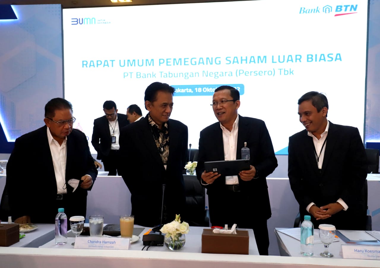 Direktur Utama Bank BTN Haru Koesmahargyo bersama Wakil Direktur Utama Bank BTN Nixon LP Napitulu, Komisaris Utama Bank BTN Chandra Hamzah dan Wakil Komisaris Utama Bank BTN Iqbal Latanro berbincang di sela Rapat Umum Pemegang Saham Luar Biasa (RUPSB) Bank BTN di Jakarta, Selasa (18/10). RUPSLB Bank BTN menyetujui penerbitan saham baru melalui skema Hak Memesan Efek Terlebih Dahulu (HMETD) atau rights issue sebanyak-banyaknya 4,6 miliar saham Seri B dengan nilai nominal Rp500 per saham. Bank BTN akan menggunakan dana hasil rights issue untuk meningkatkan kapasitas perseroan dalam penyaluran kredit untuk mendukung Program Perumahan Nasional, khususnya Program Pemerintah Sejuta Rumah.