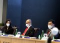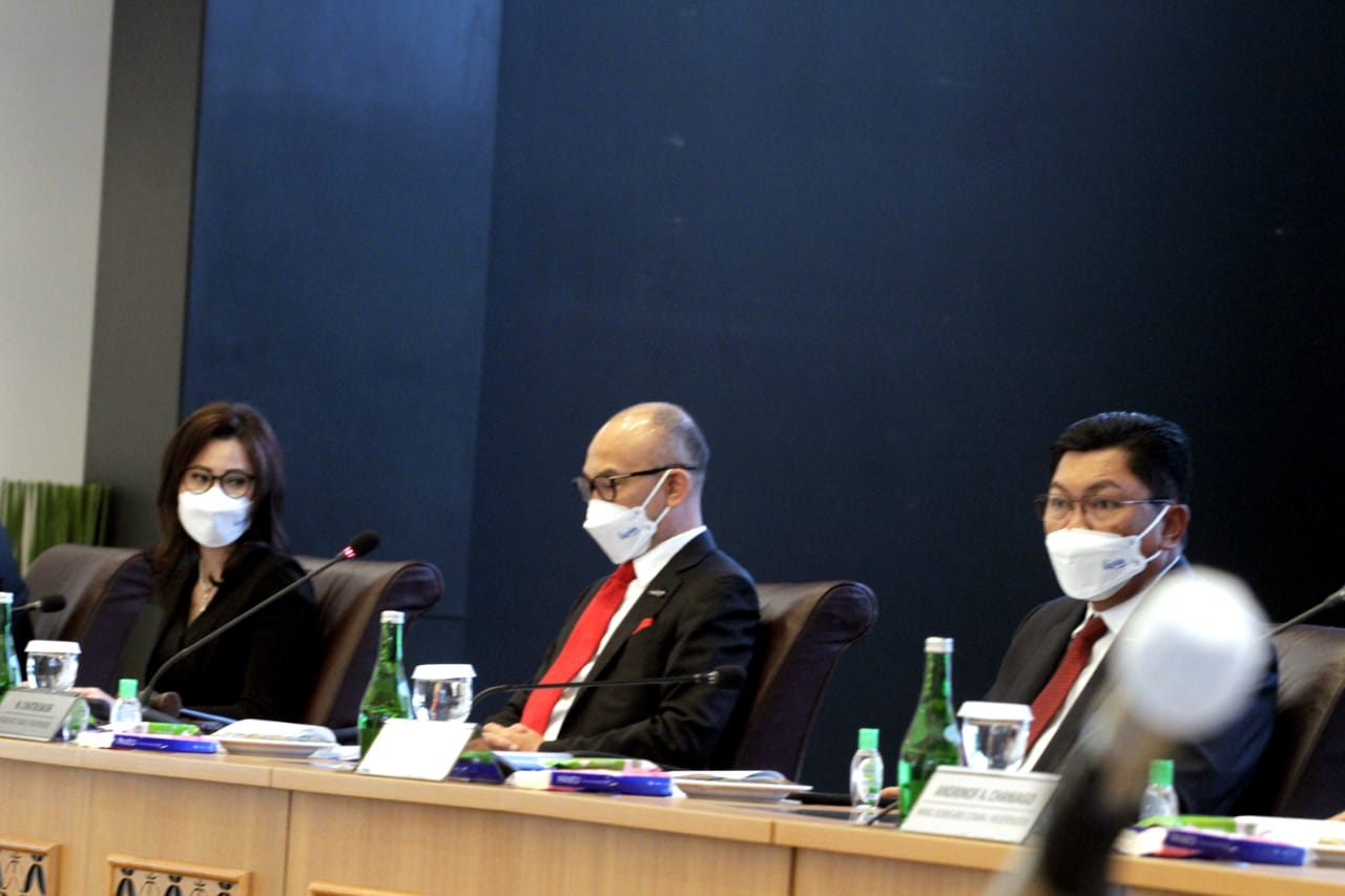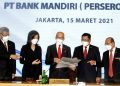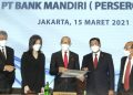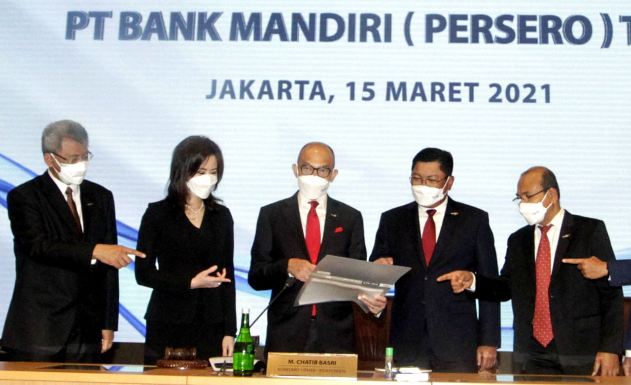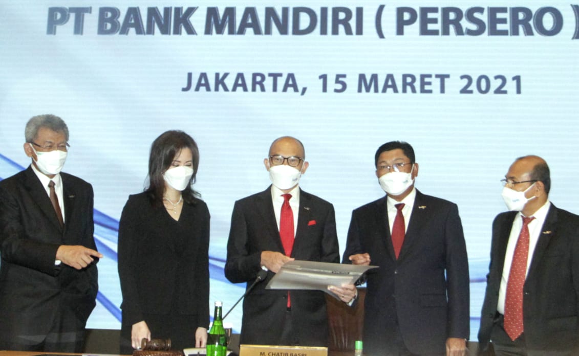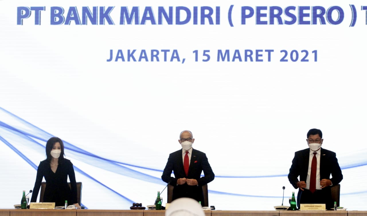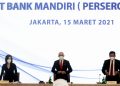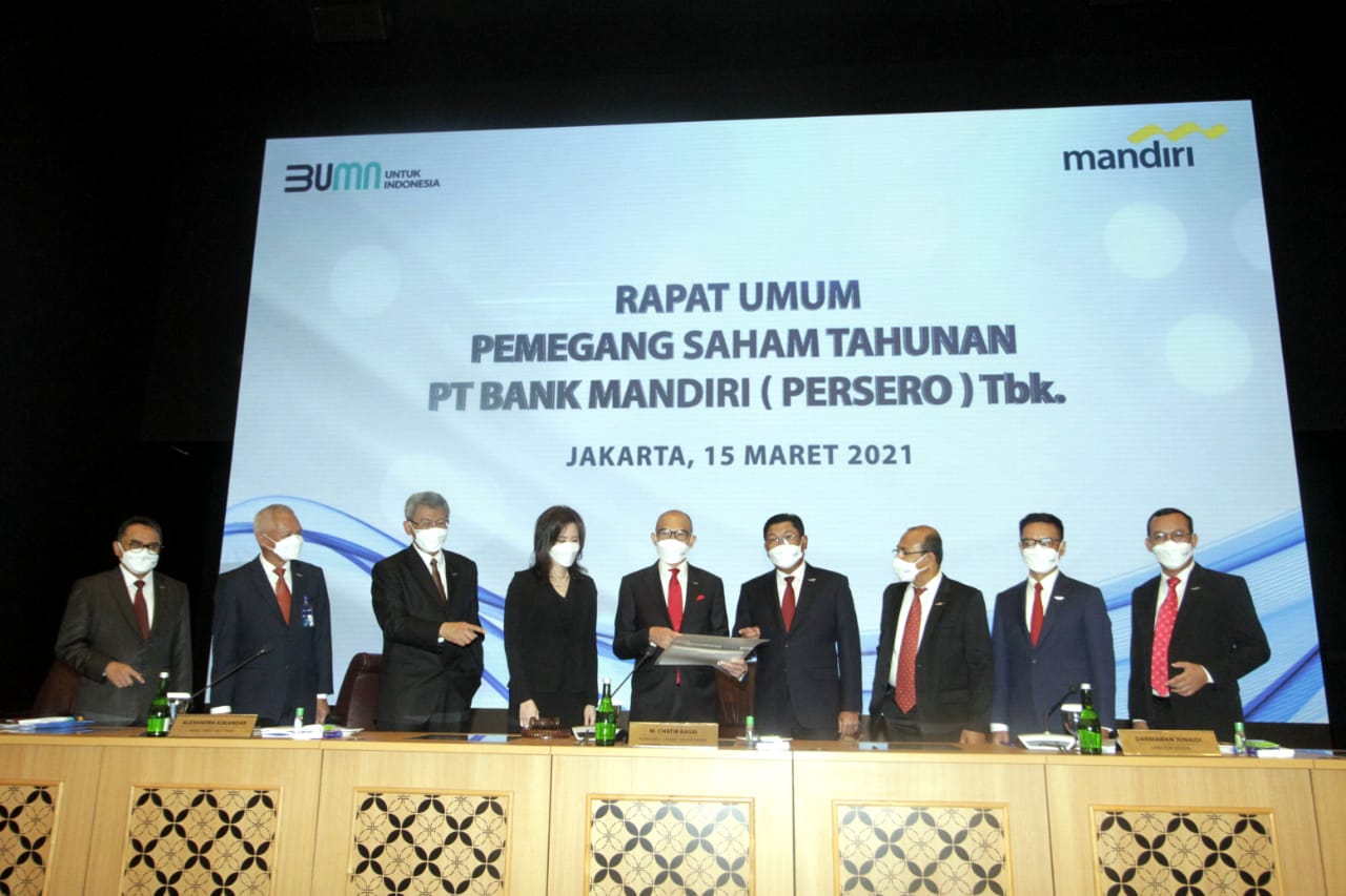 Chatib Basri, Direktur Utama Bank Mandiri Darmawan Junaidi, Wakil Komut Andrinof A. Chaniago, Direktur Manajemen Risiko Ahmad Siddik Badruddin dan Direktur Keuangan & Strategi Sigit Prastowo saat pembukaan RUPS Tahunan Bank Mandiri 2021 di Jakarta, Senin (15/3). Pemegang saham menyetujui besaran dividen sebesar 60% dari laba bersih tahun 2020 atau sekitar Rp10,27 Triliun (sekitar Rp220 per lembar saham). Dengan memperhitungkan komposisi saham merah putih yang sebesar 60%, maka Bank Mandiri akan menyetorkan dividen sekitar Rp6,16 triliun ke kas Negara. RUPST juga menyetujui pengangkatan Timothy Utama Sebagai Direktur Information Technology dan Muhammad Yusuf Ateh Sebagai Komisaris.