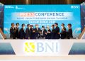 Direktur Utama BNI Royke Tumilaar dan Wakil Direktur Utama Bank BNI Adi Sulistyowati bersama jajaran direksi BNI lainnya usai Rapat Umum Pemegang Saham Tahunan (RUPST) BNI Tahun Buku 2021, Selasa (15/3/2022).