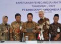 (kiri – kanan) : Direktur Risk Management PT Bank Syariah Indonesia Tbk (BSI) Tiwul Widyastuti, Direktur Finance & Strategy BSI Ade Cahyo Nugroho, Direktur Compliance & Human Capital BSI Tribuana Tunggadewi, Wakil Direktur Utama BSI Bob Tyasika Ananta, Direktur Utama BSI Hery Gunardi, Komisaris Utama BSI Adiwarman Azwar Karim, Ketua Dewan Pengawas Syariah BSI Hasanudin, Komisaris Independen BSI Komaruddin Hidayat, Komisaris Independen BSI M. Arief Rosyid Hasan, Komisaris Independen Mohamad Nasir, dan Anggota Dewan Pengawas Syariah BSI Mohamad Hidayat saat pelaksanaan RUPST Tahun Buku 2022 BSI di Wisma Mandiri, Jakarta. (22/05)