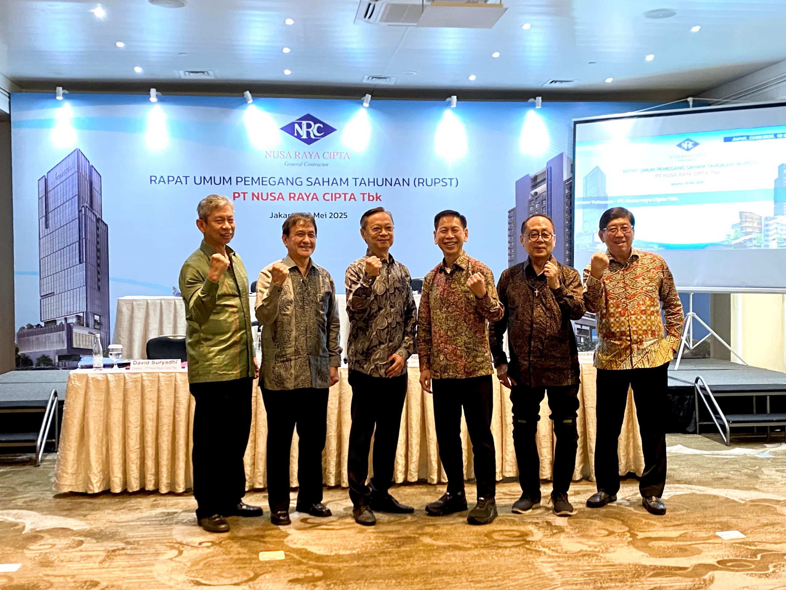 (Ki-ka) Direktur PT Nusa Raya Cipta Tbk (NRCA) Stefanus Irawan Gumulja, Direktur Setiadi Djajasaputra, Presiden Komisaris Johannes Suriadjaja, Presiden Direktur Hadi Winarto Christanto, Wakil Presiden Direktur Eddy Purwana Wikanta, Direktur David Suryadhi berfoto bersama usai Rapat Umum Pemegang Saham Tahunan (RUPST) untuk Tahun Buku 2024 di Jakarta, (23/05/2025). Dalam RUPST NRCA tersebut menyetujui pembagian dividen sebanyak-banyaknya sebesar Rp54,92 Miliar atau sebesar Rp22 per lembar saham. Perseroan mencatatkan pendapatan sebesar Rp3,37 Triliun pada tahun 2024, sementara di tahun sebelumnya pendapatan Perseroan adalah sebesar Rp2,90 Triliun.