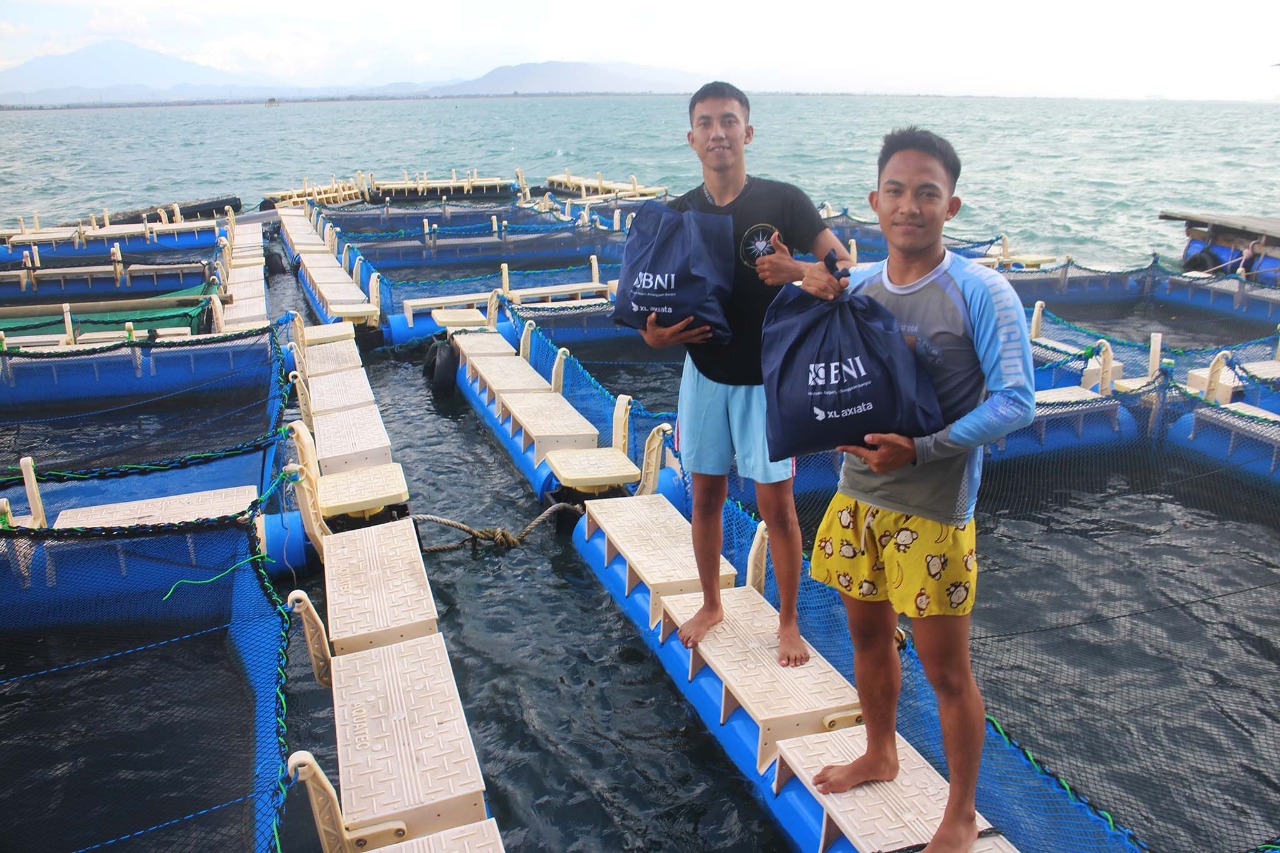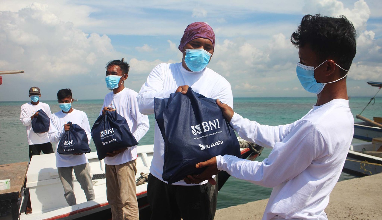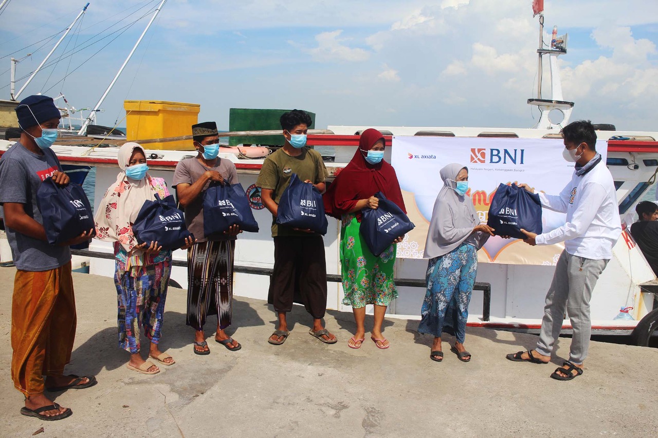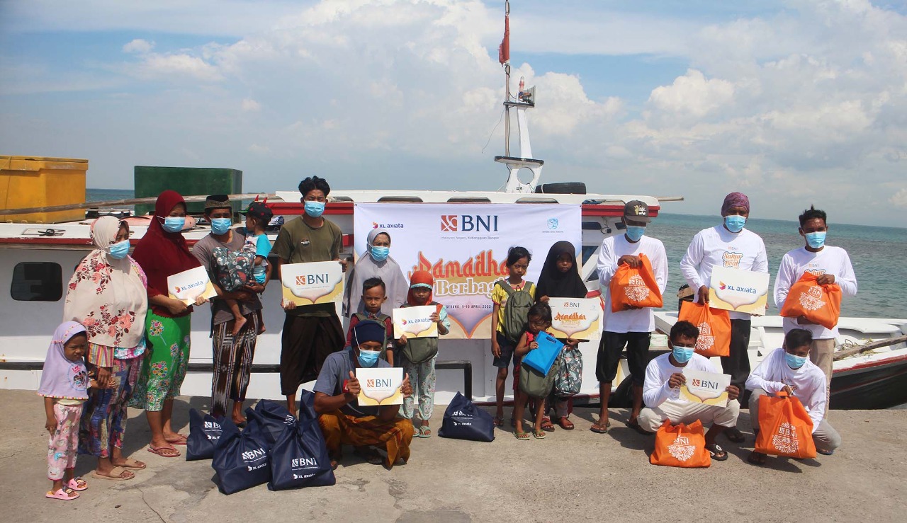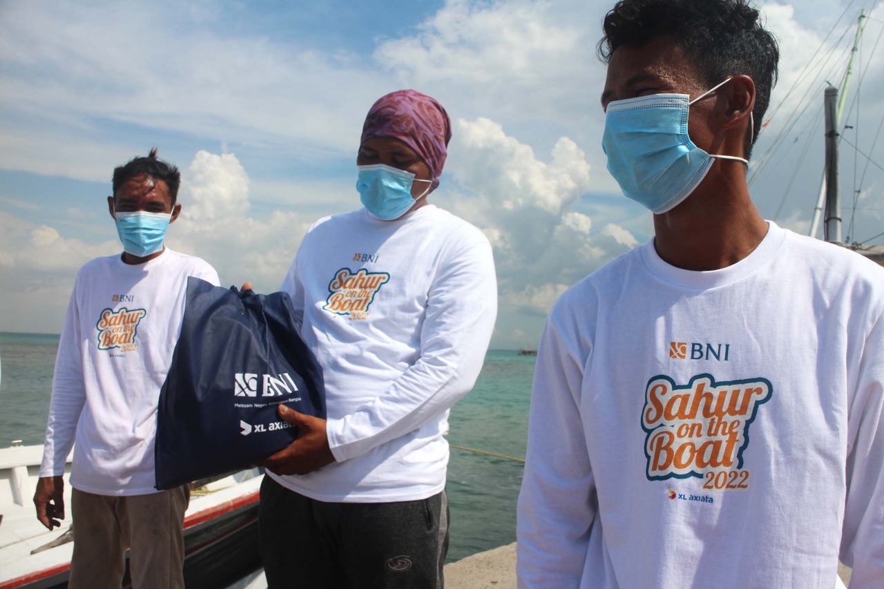 Sejumlah perwakilan jurnalis membagikan paket kebutuhan Ramadan kepada warga pesisir saat kegiatan Sahur on The Boat 2022-Ramadan Berbagi di Serang, Banten, Sabtu (9/4/2022). Acara yang didukung oleh BNI dan XL Axiata ini juga memberikan perlengkapan sekolah untuk anak-anak nelayan.