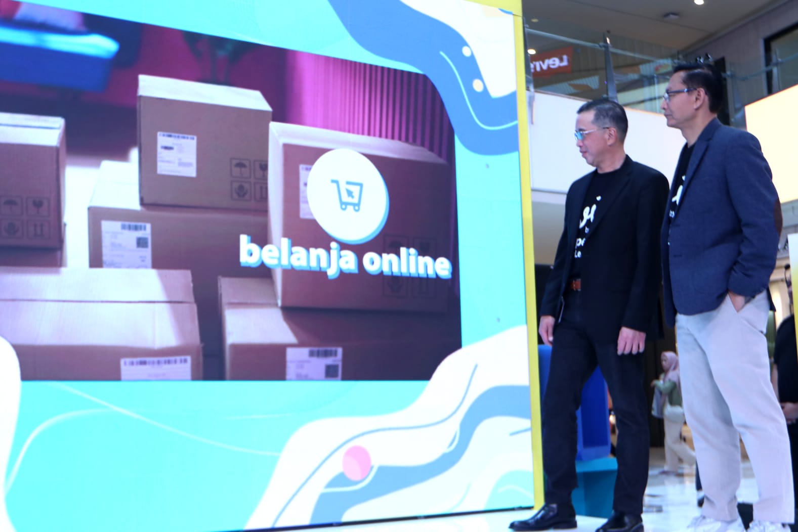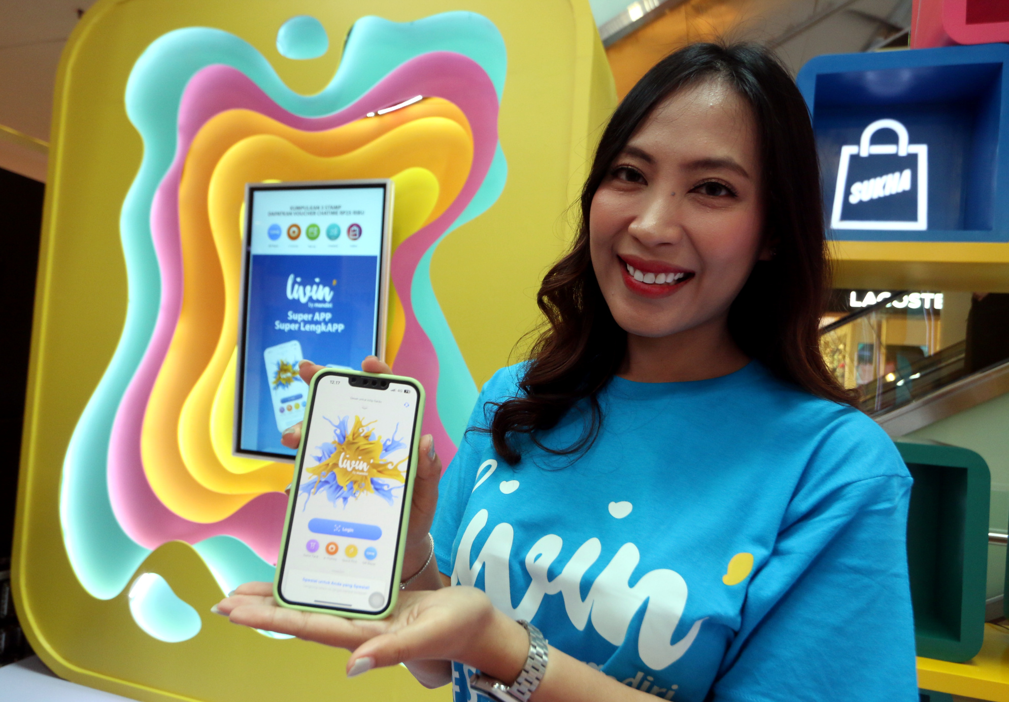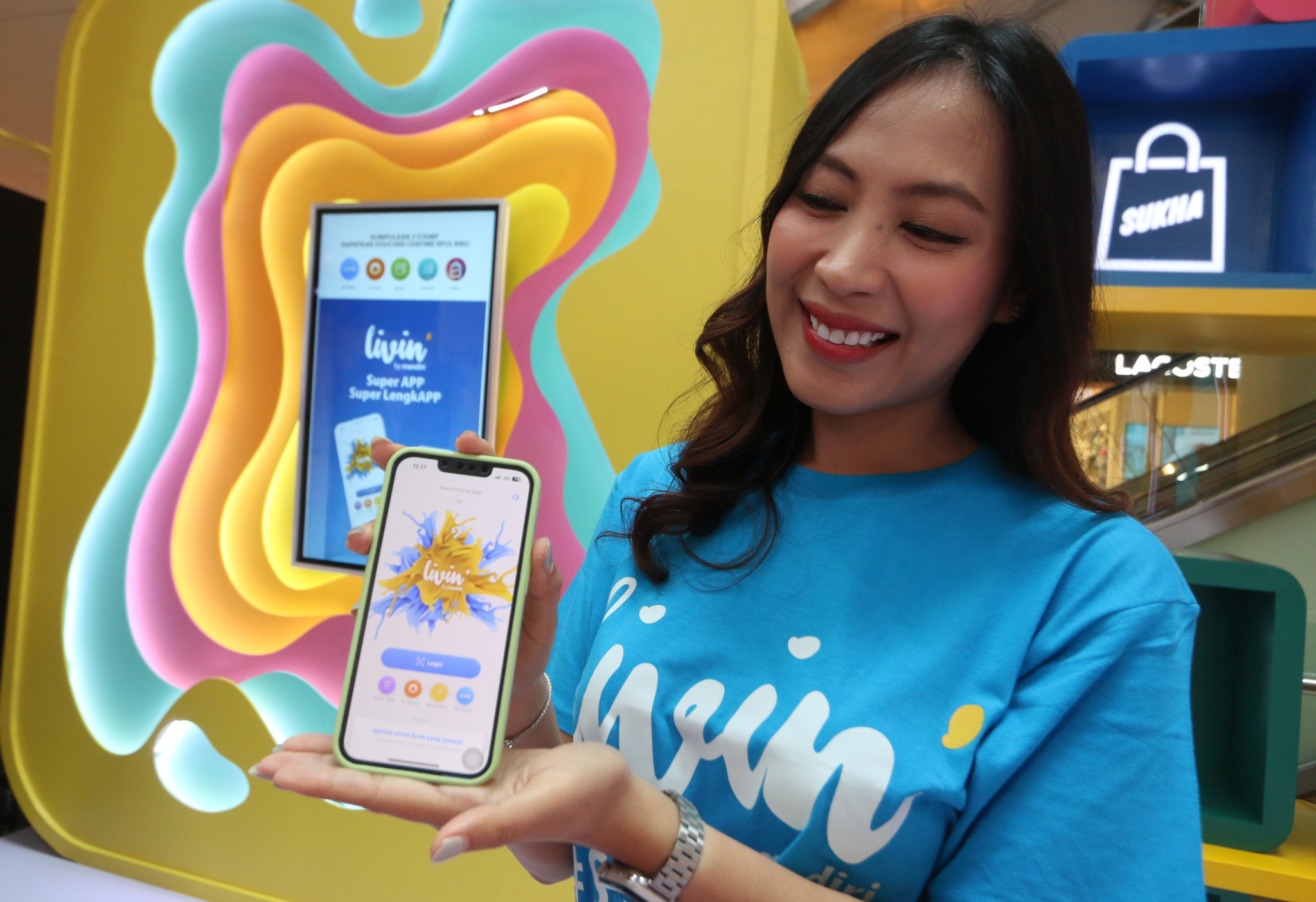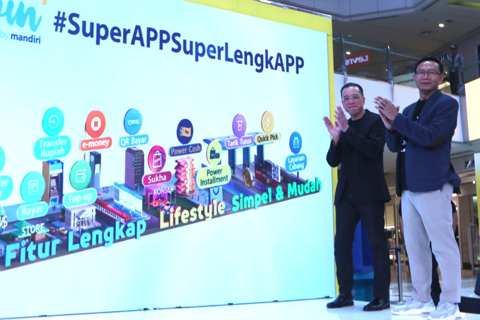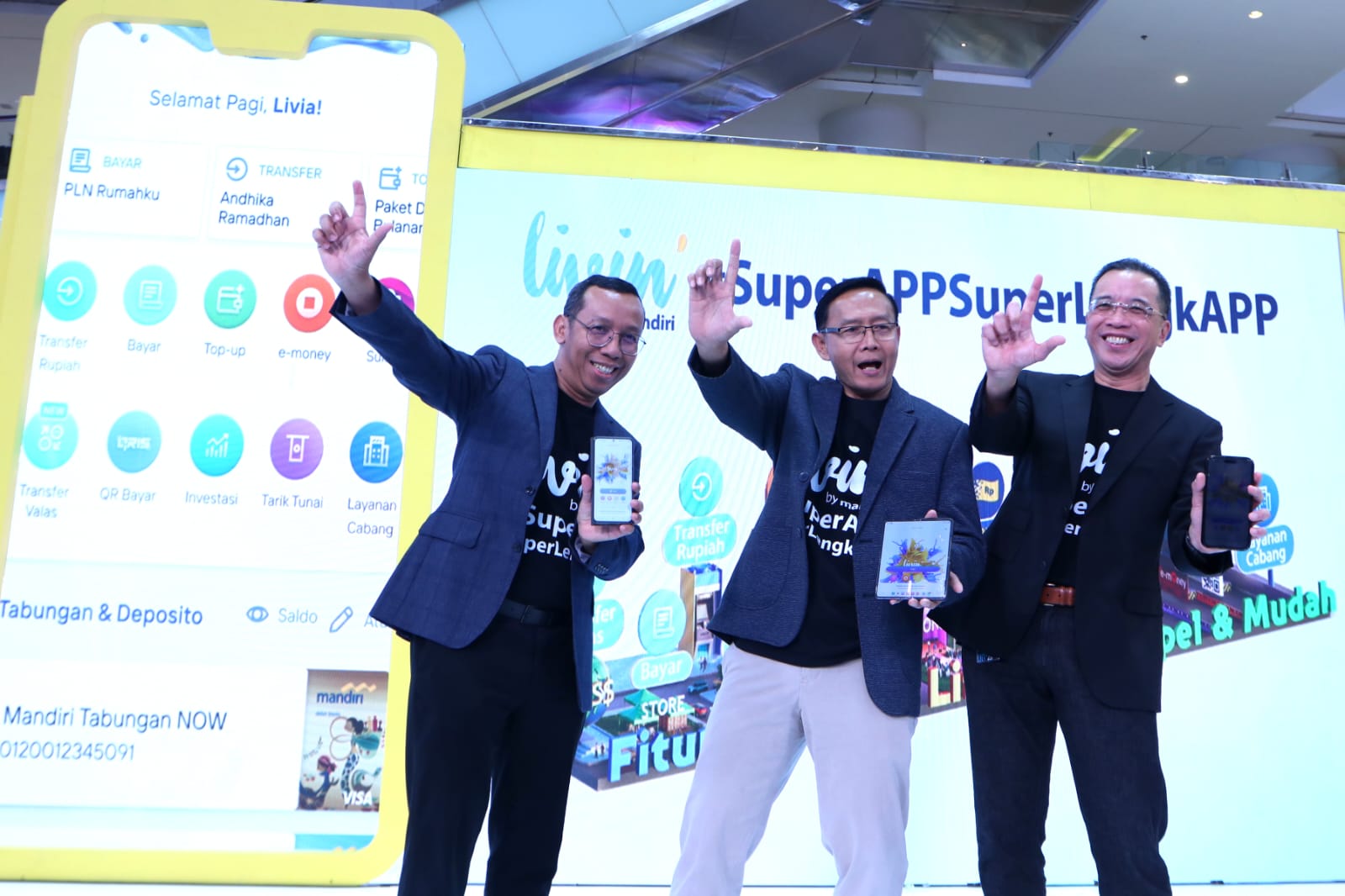 (Ki-Ka) Direktur Information Technology Bank Mandiri Timothy Utama, Direktur Jaringan & Retail Banking Bank Mandiri Aquarius Rudianto, Presiden Direktur Grand Indonesia Budiman Rasjid serta Direktur Keuangan dan Strategi Bank Mandiri Sigit Prastowo saat menjajal transaksi di merchant dalam pembukaan event Livin’ Fest untuk menyambut HUT ke-25 Bank Mandiri di Mall Grand Indonesia, Jakarta, Kamis (14/9). Dalam acara ini Bank Mandiri turut menggelar program #SuperAPPSuperLengkAPP yang memperkenalkan lebih dari 70 fitur keuangan Livin’ by Mandiri secara langsung ke masyarakat mulai dari pembukaan rekening, pembayaran, investasi, pinjaman serta terhubung lebih dari 3.000 biller dan jutaan merchant QRIS. Adapun, hingga Agustus 2023, Livin’ by Mandiri telah diunduh sebanyak 30 juta kali dan mengelola lebih dari 1,5 miliar transaksi dengan nilai menembus Rp 1.500 triliun.