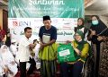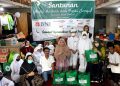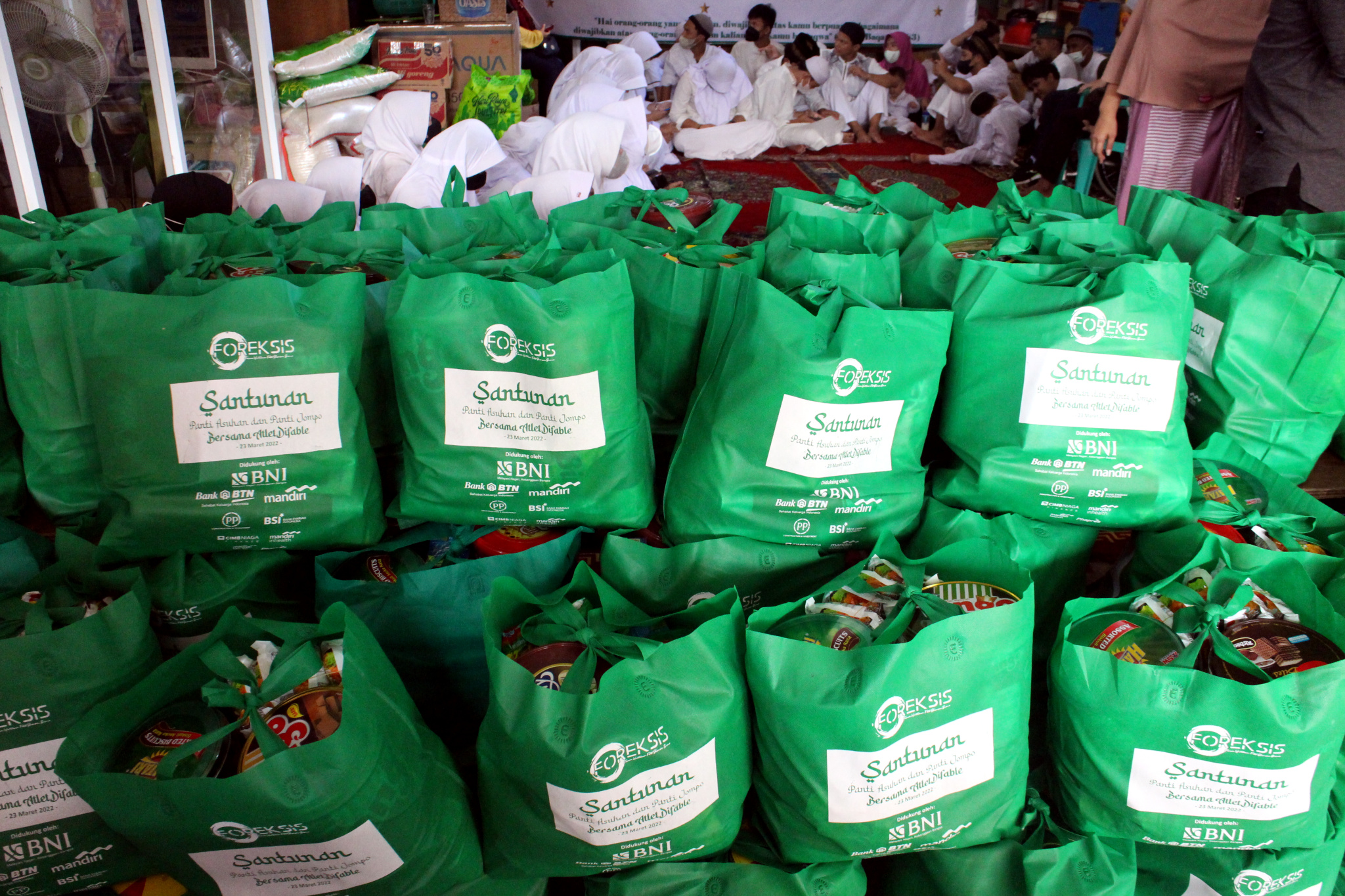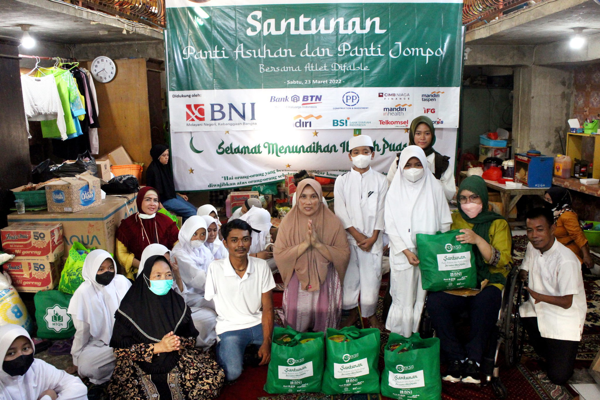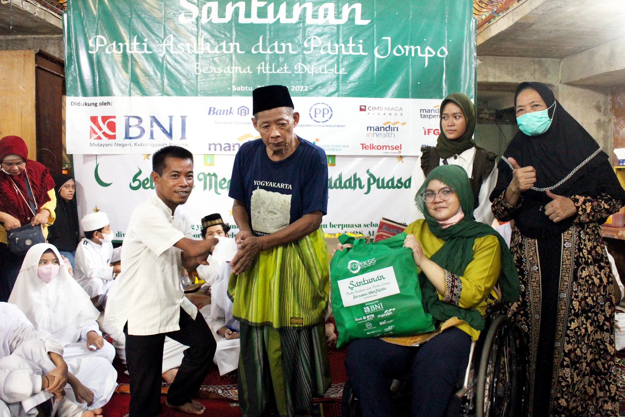 Sejumlah atlet porda difabel menyalurkan santunan kepada anak-anak yatim piatu dan orang jompo di Rumah Panti Asuhan Rasulullah SAW, Jakarta, Sabtu (23/4). Kegiatan santunan dan berbagi pengalaman para atlet porda difabel bertujuan untuk memberi motivasi kepada anak-anak panti agar bisa berprestasi meski berada dalam keterbatasan