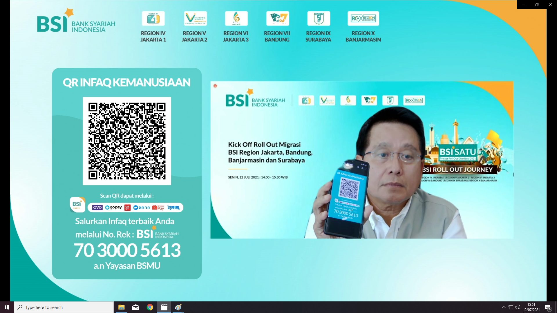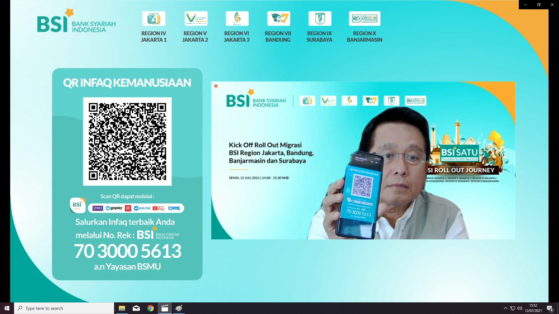 Direktur Utama PT Bank Syariah Indonesia Tbk (BSI) Hery Gunardi bersama segenap Direksi, SEVP, dan Regional CEO BSI melakukan scan QRIS menggunakan BSI Mobile pada acara kick off roll out BSI tahap akhir secara virtual di Jakarta, Senin (12/7).