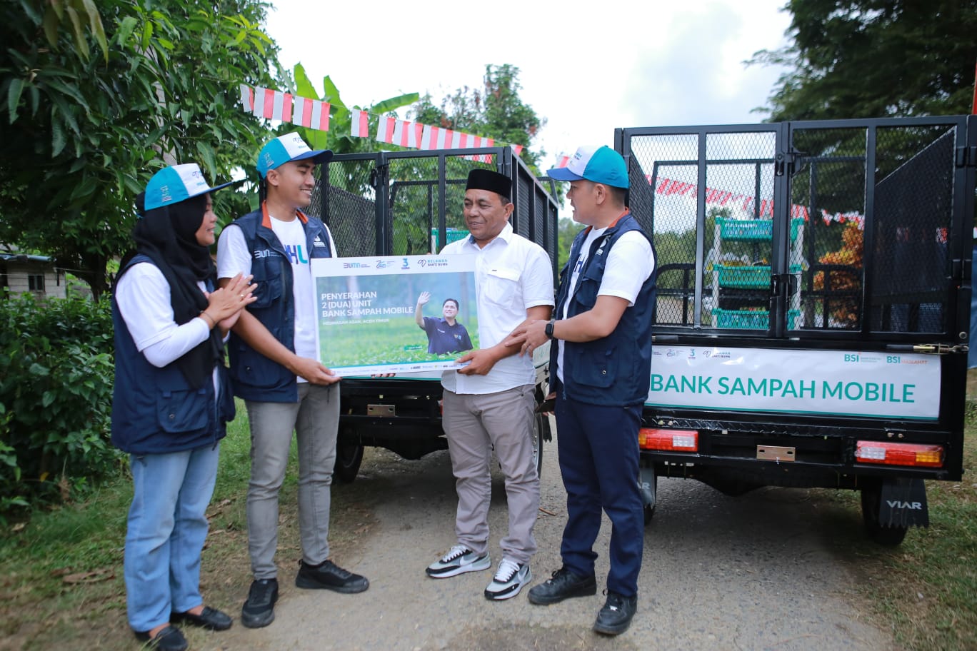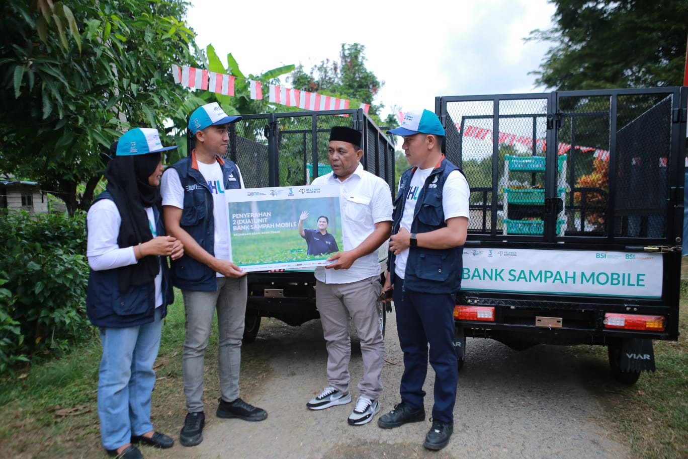 BSI dan BSI Maslahat bersama Relawan Bakti BUMN memberikan bantuan Bank Sampah Mobile kepada Kepala Desa Meunasah Asan Bachtiar (kanan kedua) sebagai bentuk kepedulian lingkungan di Desa Muenasah Asan, Aceh Timur. Selain itu masyarakat diajarkan pula bagaimana mengelola dan memilah sampah plastik.