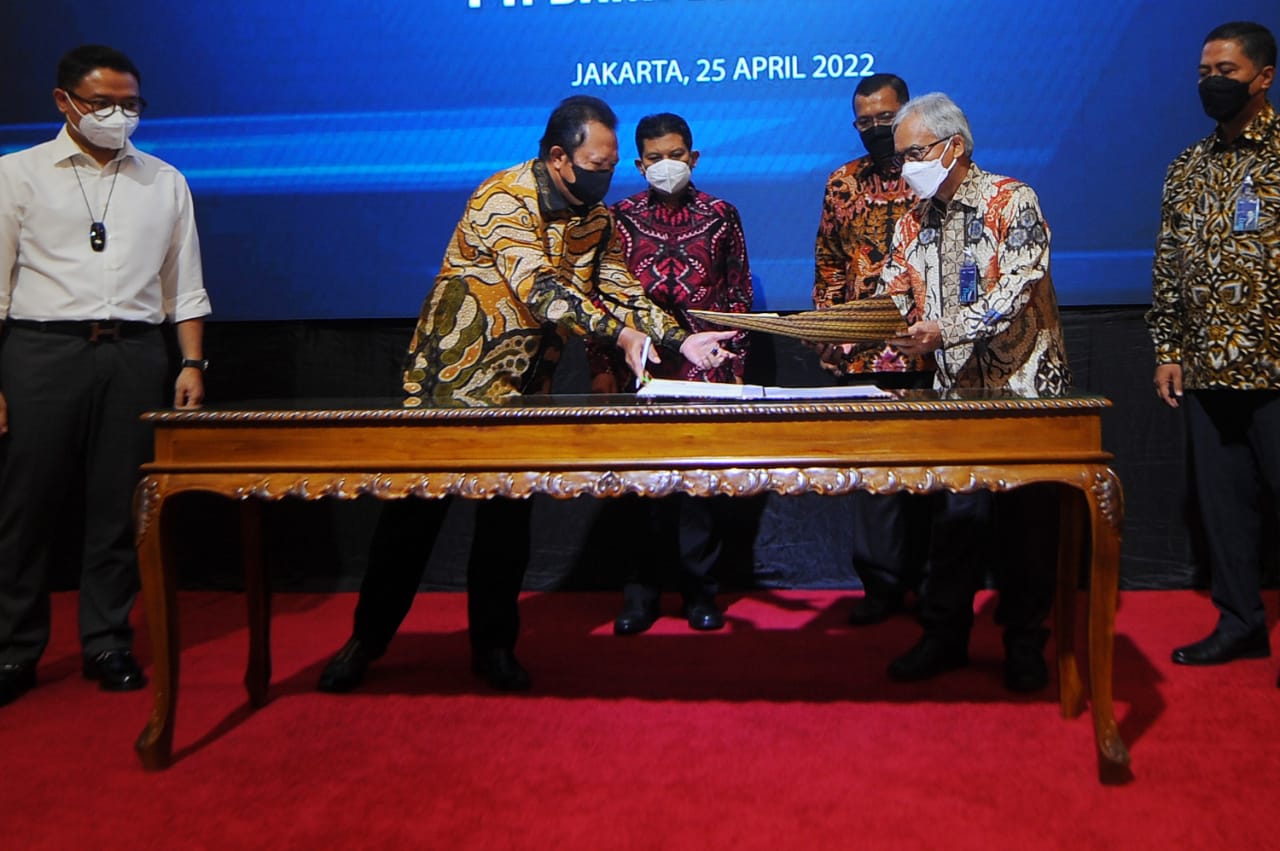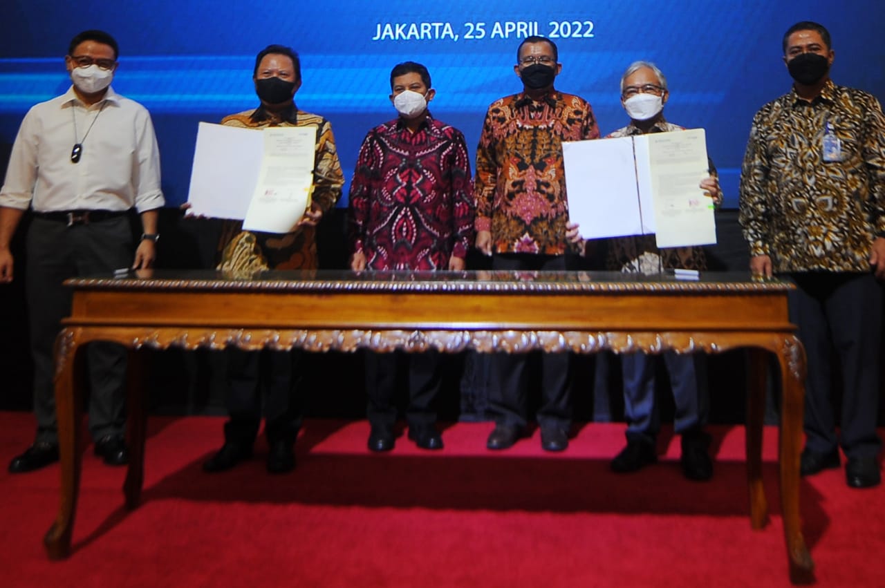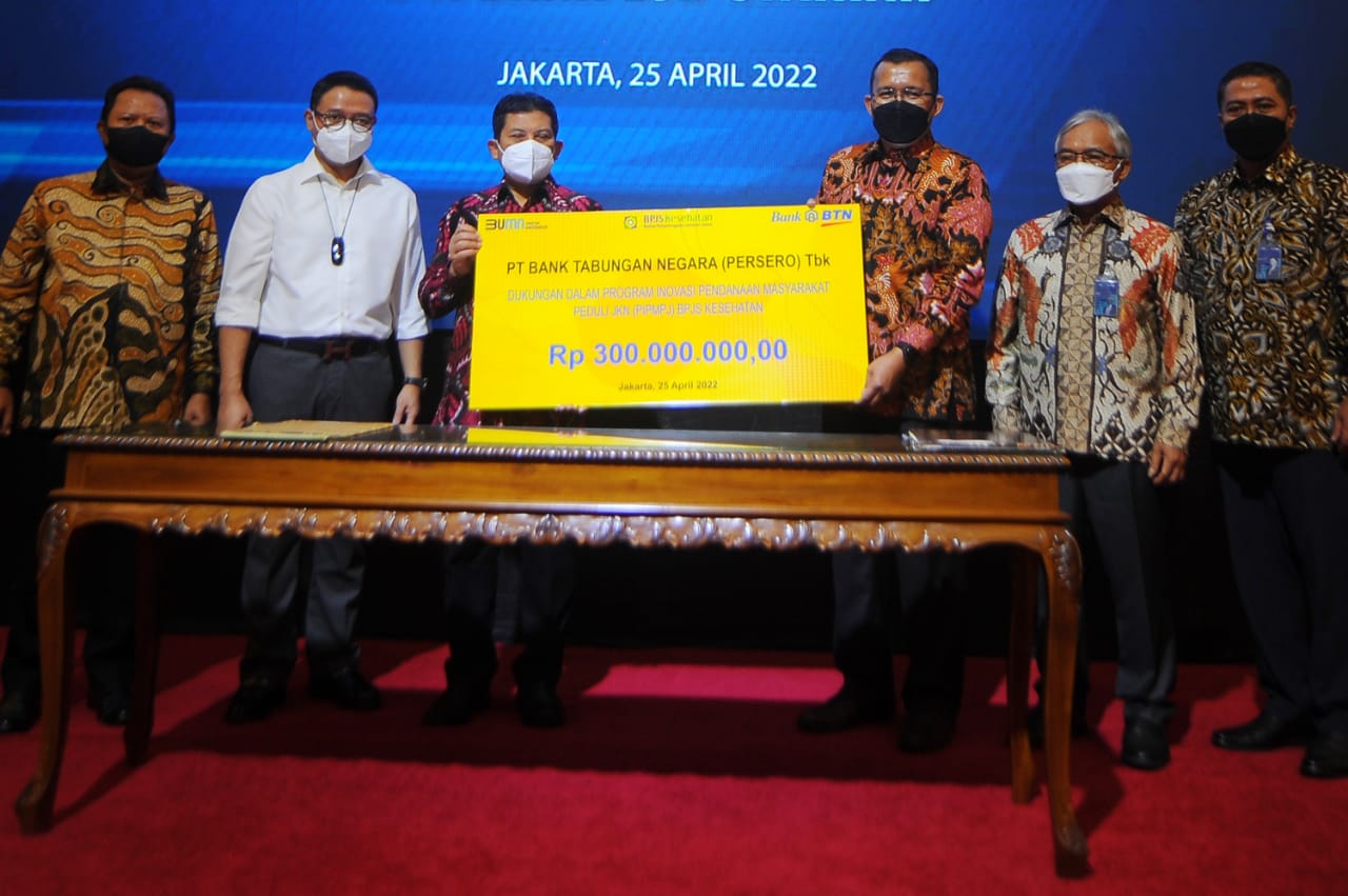 Direktur Utama Bank BTN Haru Koesmahargyo dan Direktur Utama BPJS Kesehatan Ali Ghufron Mukti serta Direktur Consumer Bank BTN Hirwandi Gafar menyaksikan penandantangan perjanjian kerjasama oleh Direktur Distribution and Funding Bank BTN Jasmin dan Direktur Pengawasan, Pemeriksaan dan Hubungan Antar Lembaga BPJS Kesehatan Mundiharno di Jakarta, Senin (25/4). Bank BTN dan BPJS Kesehatan melakukan perjanjian kerjasama terkait jasa layanan perbankan dan penyaluran pembiayaan bagi Fasilitas Kesehatan Tingkat Pertama (FKTP) dengan skema Supply Infrastructure Financing (SIF). Bank BTN menargetkan penyaluran pembiayaan kepada 10.000 FKTP senilai sekitar Rp2 triliun.