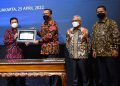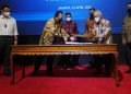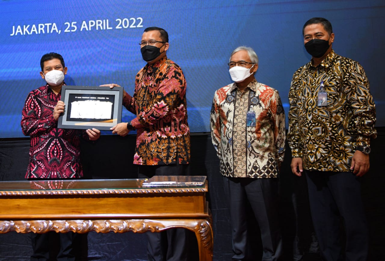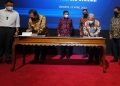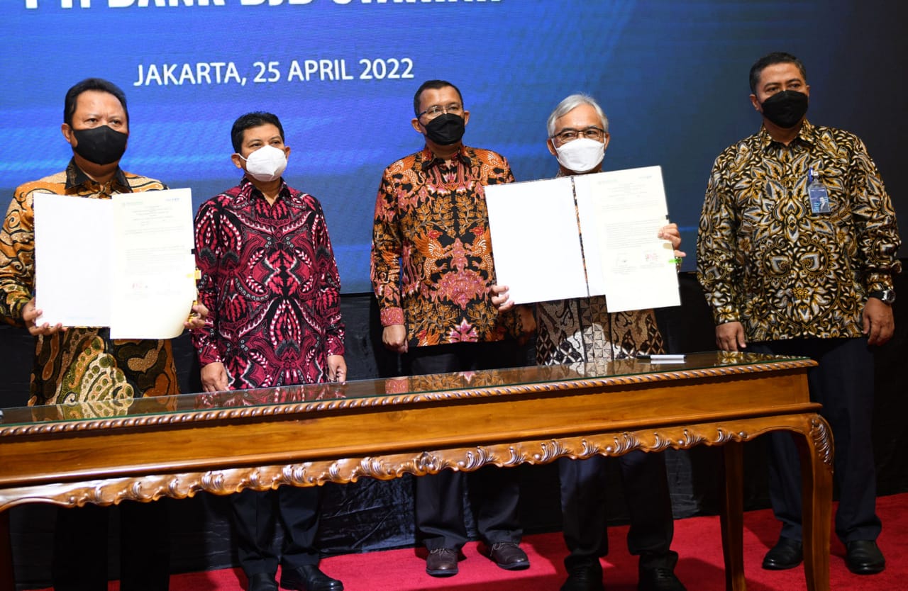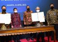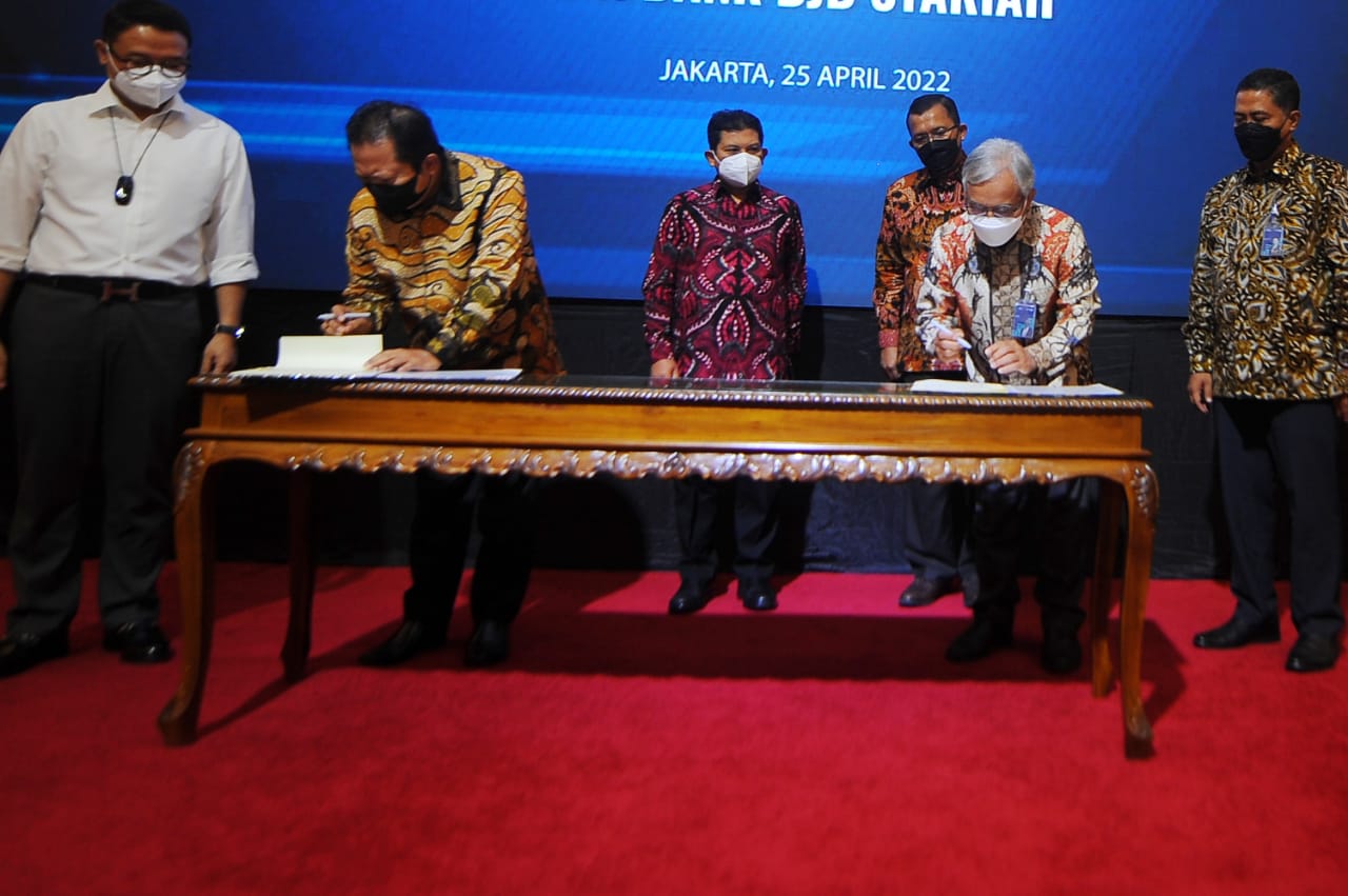 Direktur Utama Bank BTN Haru Koesmahargyo dan Direktur Utama BPJS Kesehatan Ali Ghufron Mukti serta Direktur Consumer Bank BTN Hirwandi Gafar menyaksikan penandantangan perjanjian kerjasama oleh Direktur Distribution and Funding Bank BTN Jasmin dan Direktur Pengawasan, Pemeriksaan dan Hubungan Antar Lembaga BPJS Kesehatan Mundiharno di Jakarta, Senin (25/4). Bank BTN dan BPJS Kesehatan melakukan perjanjian kerjasama terkait jasa layanan perbankan dan penyaluran pembiayaan bagi Fasilitas Kesehatan Tingkat Pertama (FKTP) dengan skema Supply Infrastructure Financing (SIF). Bank BTN menargetkan penyaluran pembiayaan kepada 10.000 FKTP senilai sekitar Rp2 triliun.