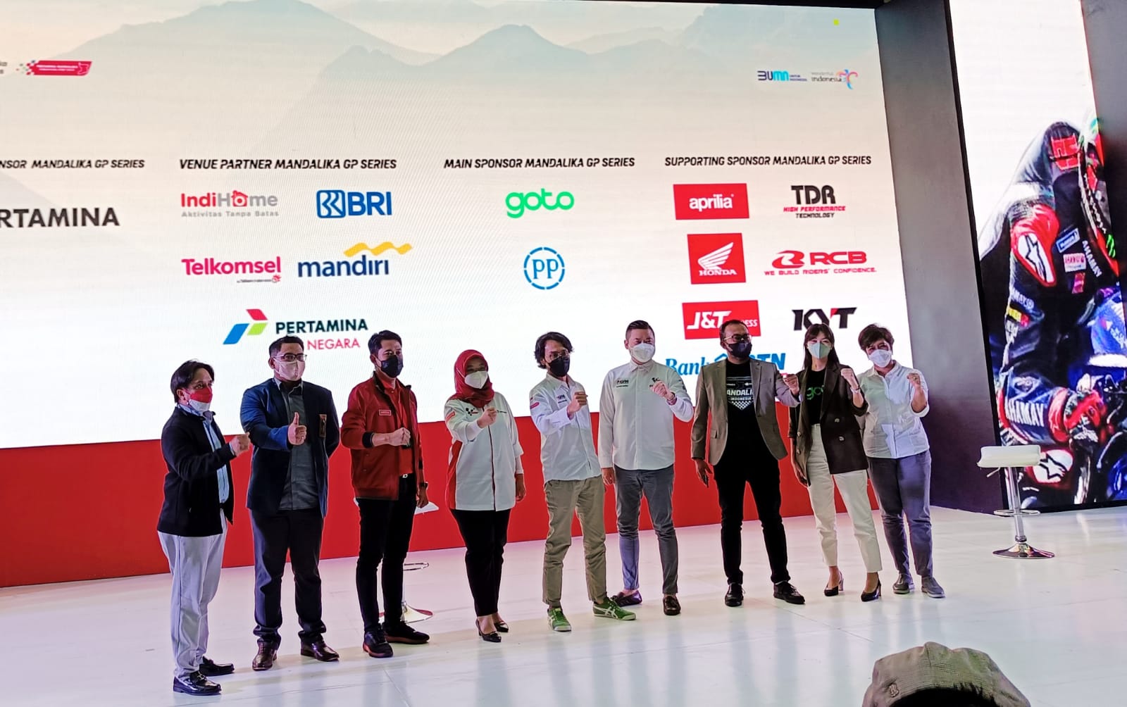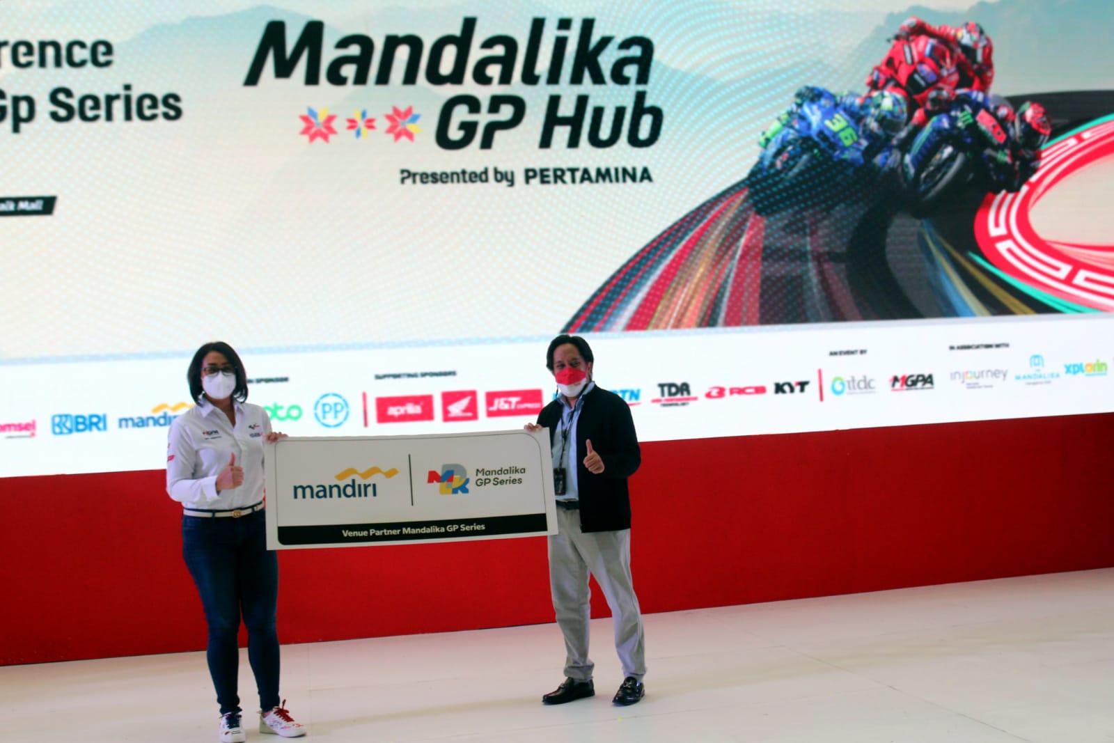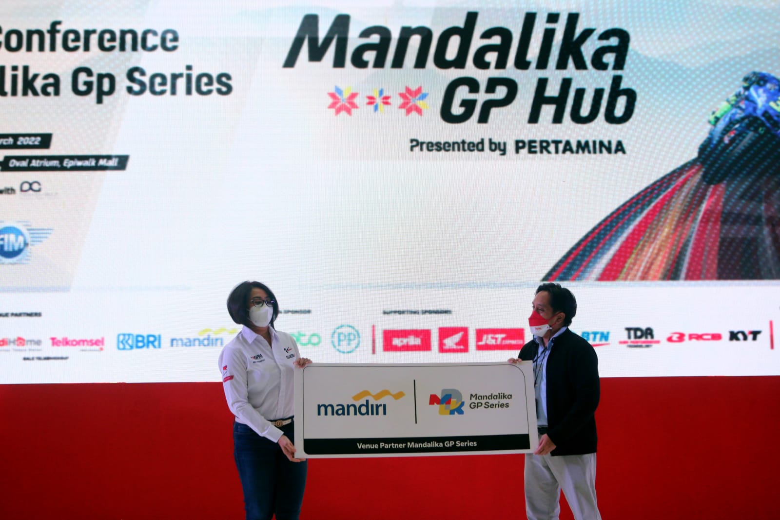 Direktur Pengembangan Bisnis Indonesia Tourism Development Corporation (ITDC) Ema Widiastuti (kiri) dan VP CSR Dept. Bank Mandiri Diwangkoro A. Ratam saat memegang simbolisasi kerjasama dukungan pelaksanaan MotoGP Mandalika dalam konferensi pers di Jakarta, Selasa (8/3). Sebagai bentuk dukungan, Bank Mandiri menyiapkan channel pembelian tiket khusus nonton MotoGP Mandalika dengan bertransaksi di app Livin’ by Mandiri, Mandiri kartu kredit dan Mandiri kartu debit. Tak hanya itu, Bank Mandiri sebagai venue sponsor juga menyiapkan Special Lounge “Bale Mandiri” di Bukit 360 di Mandalika bagi penonton untuk menikmati pemandangan indah keseluruhan sirkuit dengan 17 tikungan yang berdampingan dengan pantai serta bukit yang hijau. Selain itu, Bank Mandiri melakukan berbagai aktivasi layanan produk di beberapa pusat perbelanjaan di Jawa, Bali dan Lombok sebagai kegiatan Road to MotoGP Mandalika.