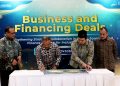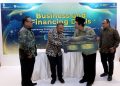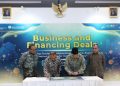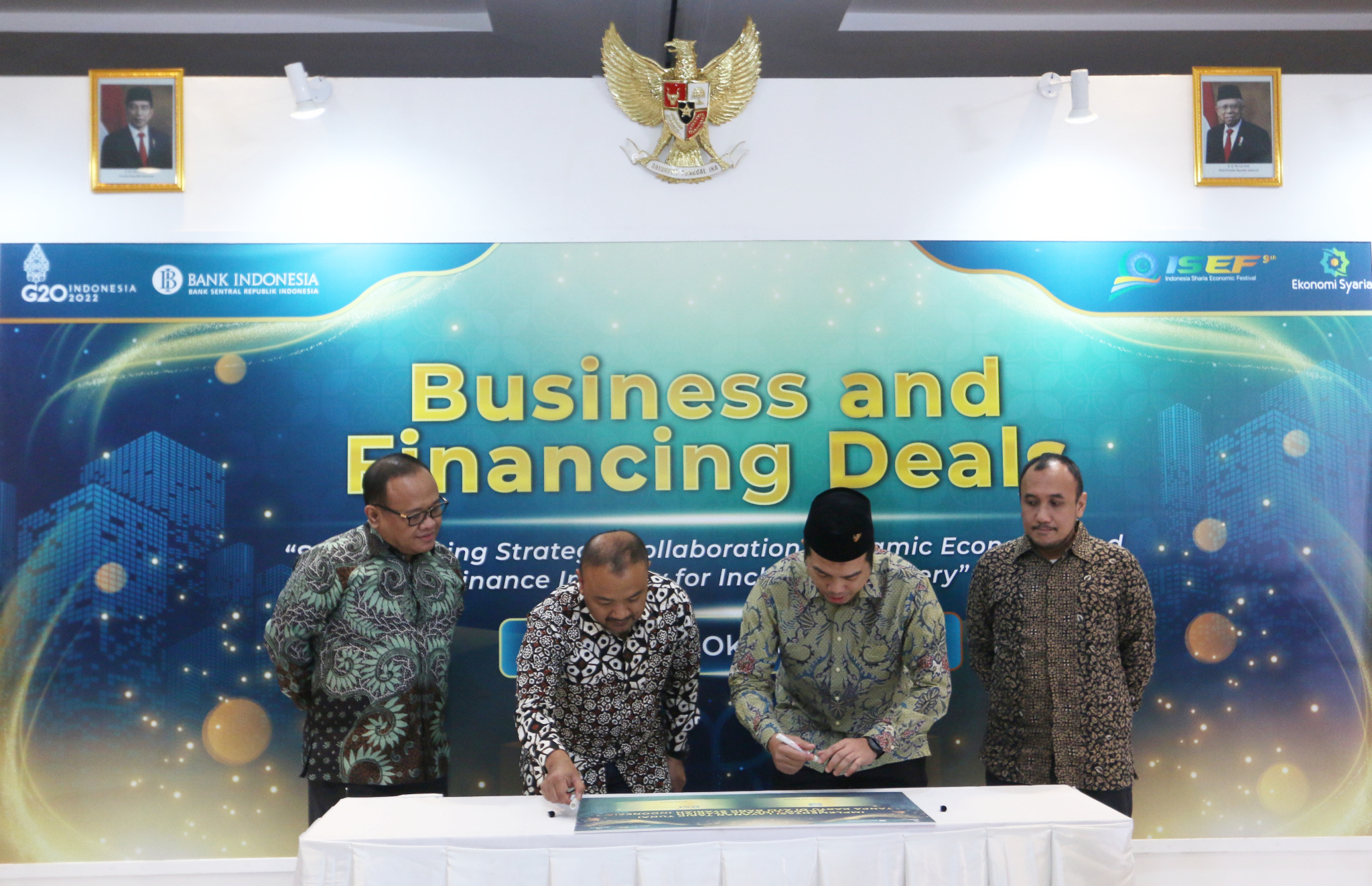 Direktur Information Technology BSI Achmad Syafi’i (kiri pertama) saat menyaksikan penandatanganan perjanjian kerja sama BSI dengan LinkAja terkait implementasi layanan tarik tunai saldo LinkAja Syariah tanpa kartu di seluruh ATM BSI oleh Group Head Digital Strategic Partnership BSI Wijayanto Group (kiri kedua) dengan Direktur Utama LinkAja Yogi Rizkian Bahar (kanan kedua) dan disaksikan juga oleh VP LinkAja Syariah Niko Fajar Utama (kanan pertama) pada acara Indonesia Sharia Economic Festival (ISEF) 2022 di JCC, Jakarta (6/10)