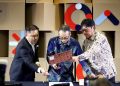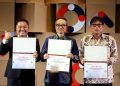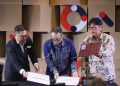 Dari kiri, Vice President Enterprise Product Management and Development Telkomsel Kwok Wai Kiat, Senior Corporate Officer, General Manager, Network Division, IT Infrastructure Service Business Group SCSK Corporation Kenji Ichiba dan CEO SC-NEX, Jun Okawara melakukan penandatanganan kerjasama disela rangkaian acara Solution Day 2025 di Jakarta, Kamis (21/8).