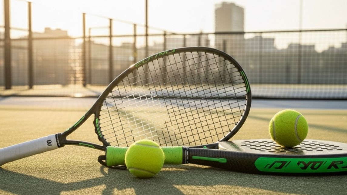 Raket tenis dan padel berdampingan, simbol dua olahraga raket populer.