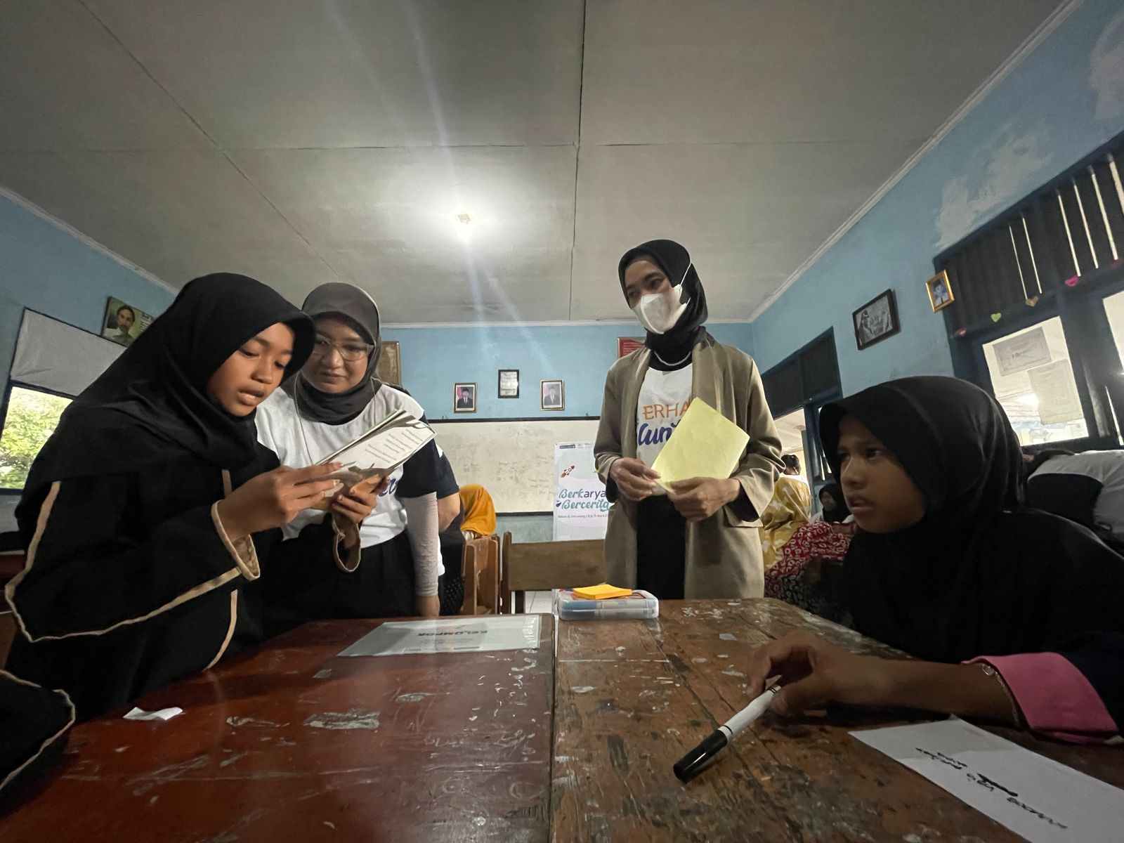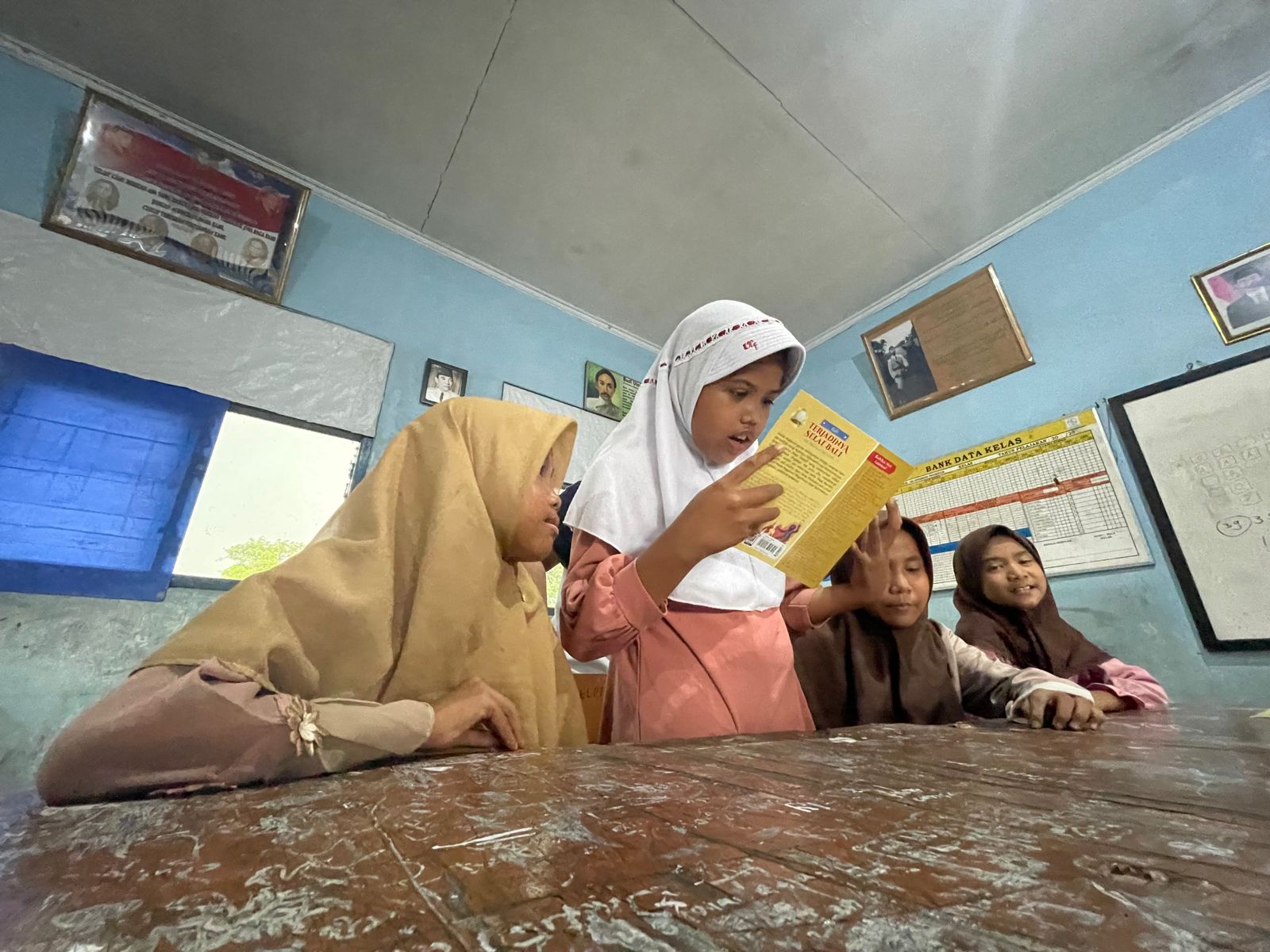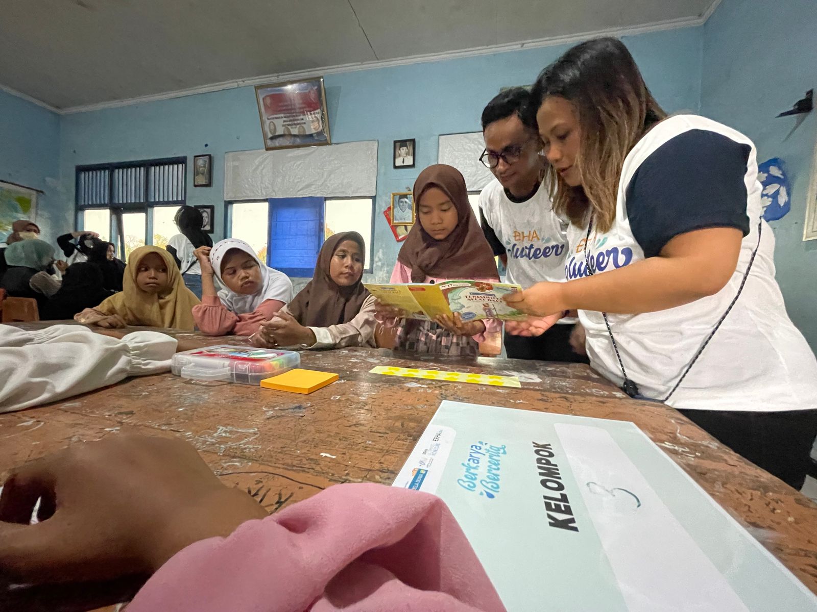 Seorang relawan dari Komunitas Erha Acne Free Universe membacakan cerita untuk anak-anak di saat pelaksanaan program Berkarya Bercerita di Sekolah Dasar Dinamika, Bekasi Jawa Barat (9/4/2023). Program Berkarya Bercerita yang digagas ERHA anak usaha dari Arya Noble Group ditujukan menyediakan fasilitas untuk mengasah literasi, membaca dan menulis serta meningkatkan minat belajar pada anak sekaligus mendukung upaya pemerintah dalam pemerataan Pendidikan di Indonesia.