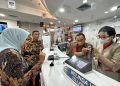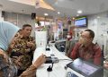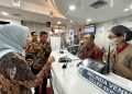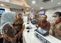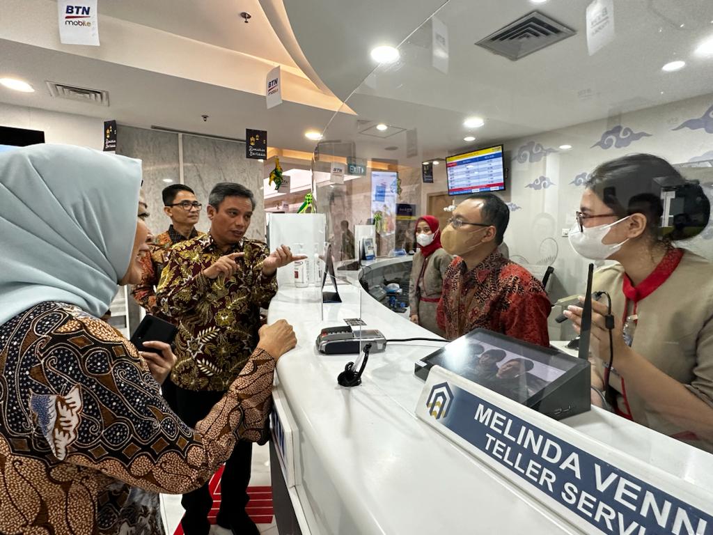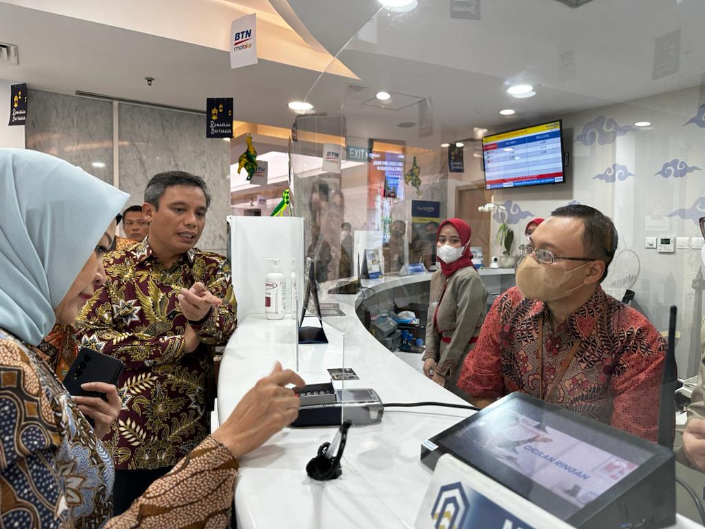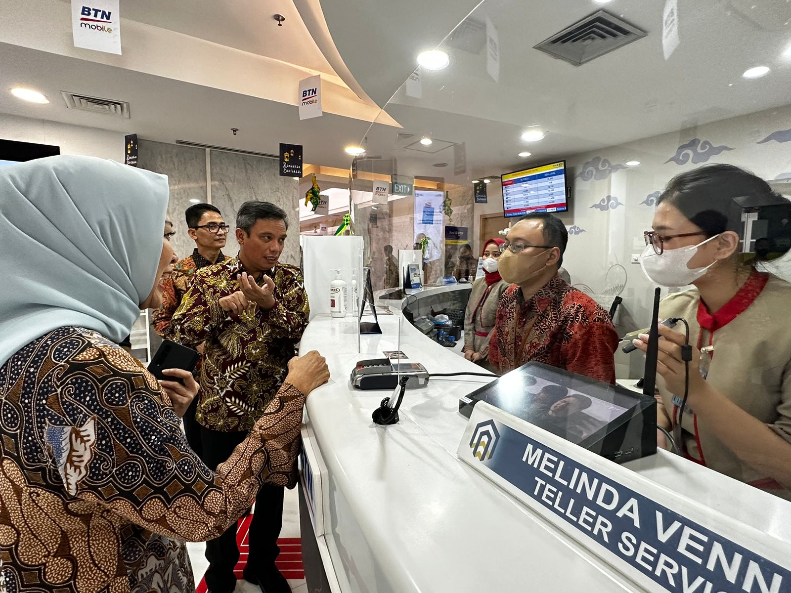 Direktur Utama PT Bank Tabungan Negara (Persero) Tbk, Nixon LP Napitupulu berbincang dengan salah satu Petugas Kantor Cabang Bank BTN Jakarta Kuningan saat meninjau persiapan kantor cabang Bank BTN dalam rangka libur panjang menyambut Idul Fitri 1444 Hijriah di Jakarta, Selasa (11/04). Selama libur Hari Raya dari tanggal 19-25 April 2023, Bank BTN cabang konvensional tetap membuka layanan operasional terbatas, diantaranya transaksi yang tidak berkaitan dengan kliring (termasuk pembukaan rekening, setoran/angsuran KPR dan penerbitan kartu ATM. Kantor cabang yang beroperasi terbatas tersebut mayoritas berlokasi di ibu kota atau kota besar di setiap provinsi dengan jam layanan 08.00-15.00 setiap hari, sementara saat hari raya Idul Fitri beroperasi hingga pukul 11.30.