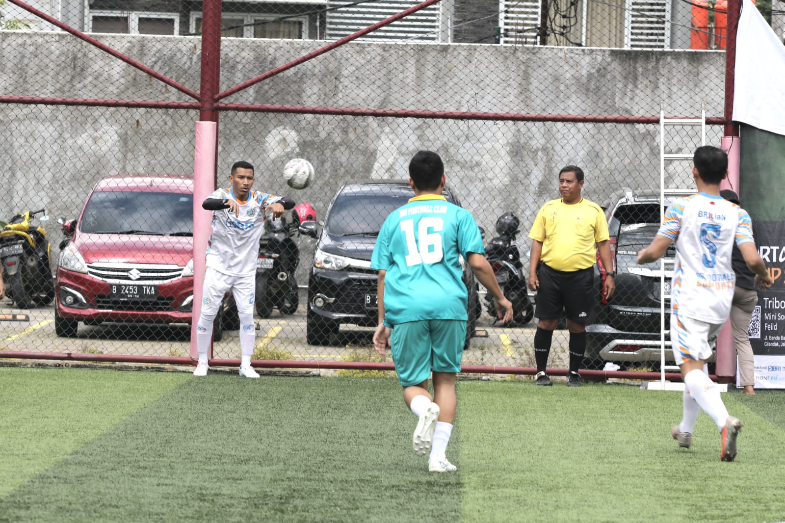 Head of Communication and Corporate Branding Department Mandiri Inhealth Farai Tody Syalar melakukan tendangan simbolis tanda dibukanya Turnamen Mini Soccer Fortabise Cup 2022 di Lapangan Triboon Mini Soccer Field, Cilandak, Jakarta Selatan (19/11). Turnament Fortabise Cup 2022 yang disponsori oleh Sinar Mas Land, Bank BRI, Mandiri Inhealth, Chandra Asri, Pupuk Indonesia, Herbalife Nutrition Indonesia, Indosat Ooredoo, Bank BNI, Bank BSI, Asuransi Allianz dan Yayasan Dharma Bhakti Astra (YDBA) diikuti oleh enam tim dari berbagai perusahaan dan forum wartawan desk ekonomi yang bertujuan untuk menjalin hubungan baik dan meningkatkan keakraban satu sama lain.